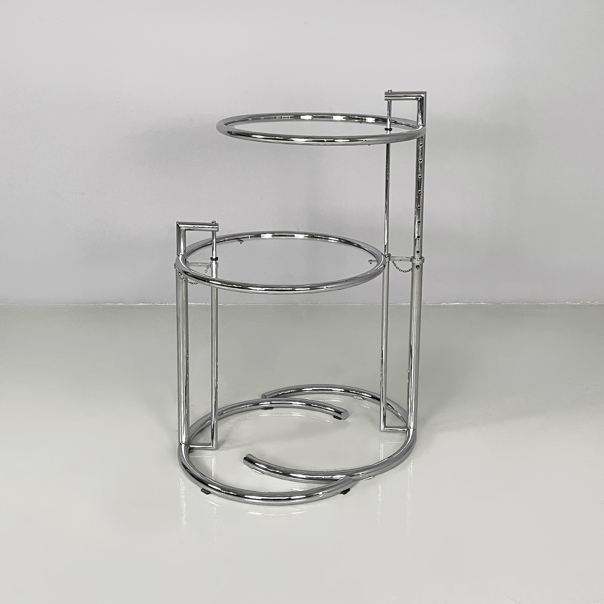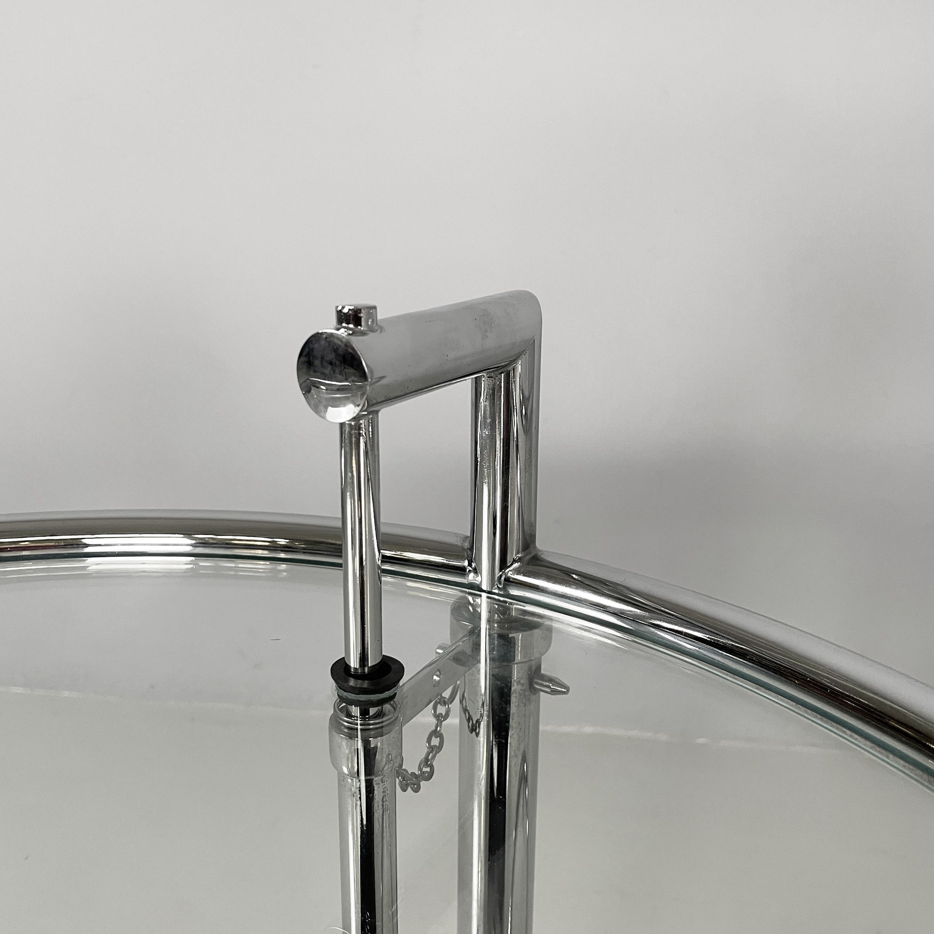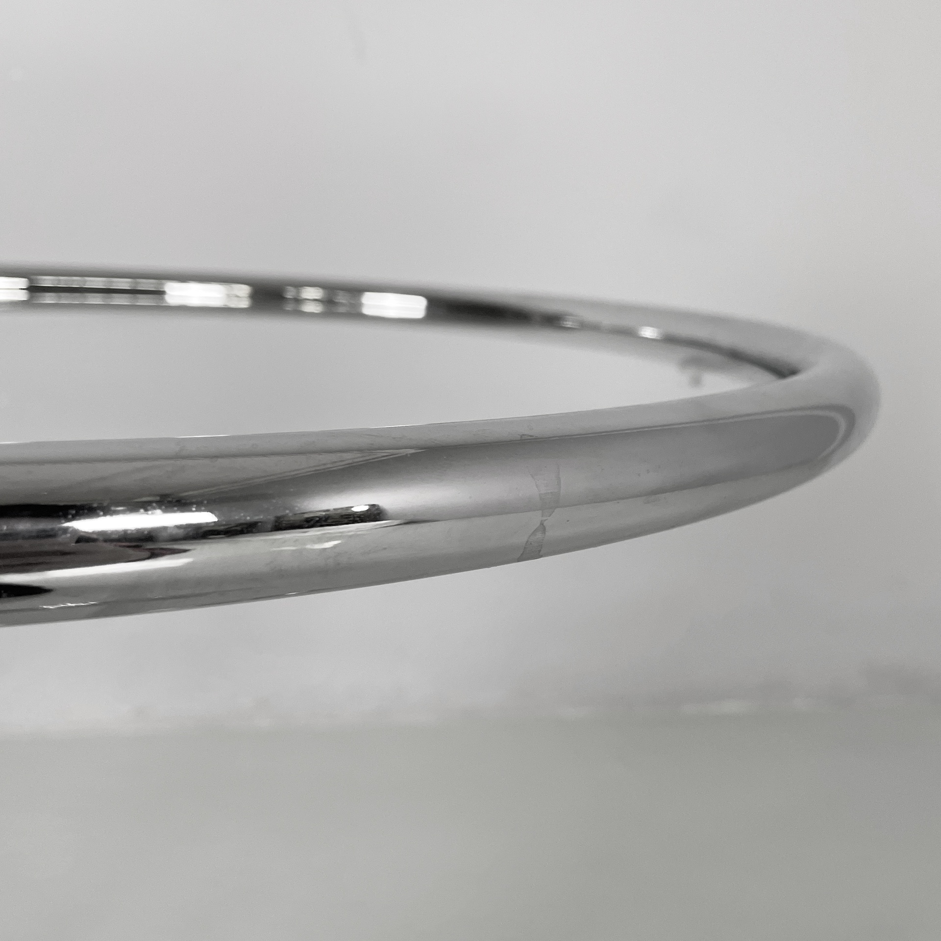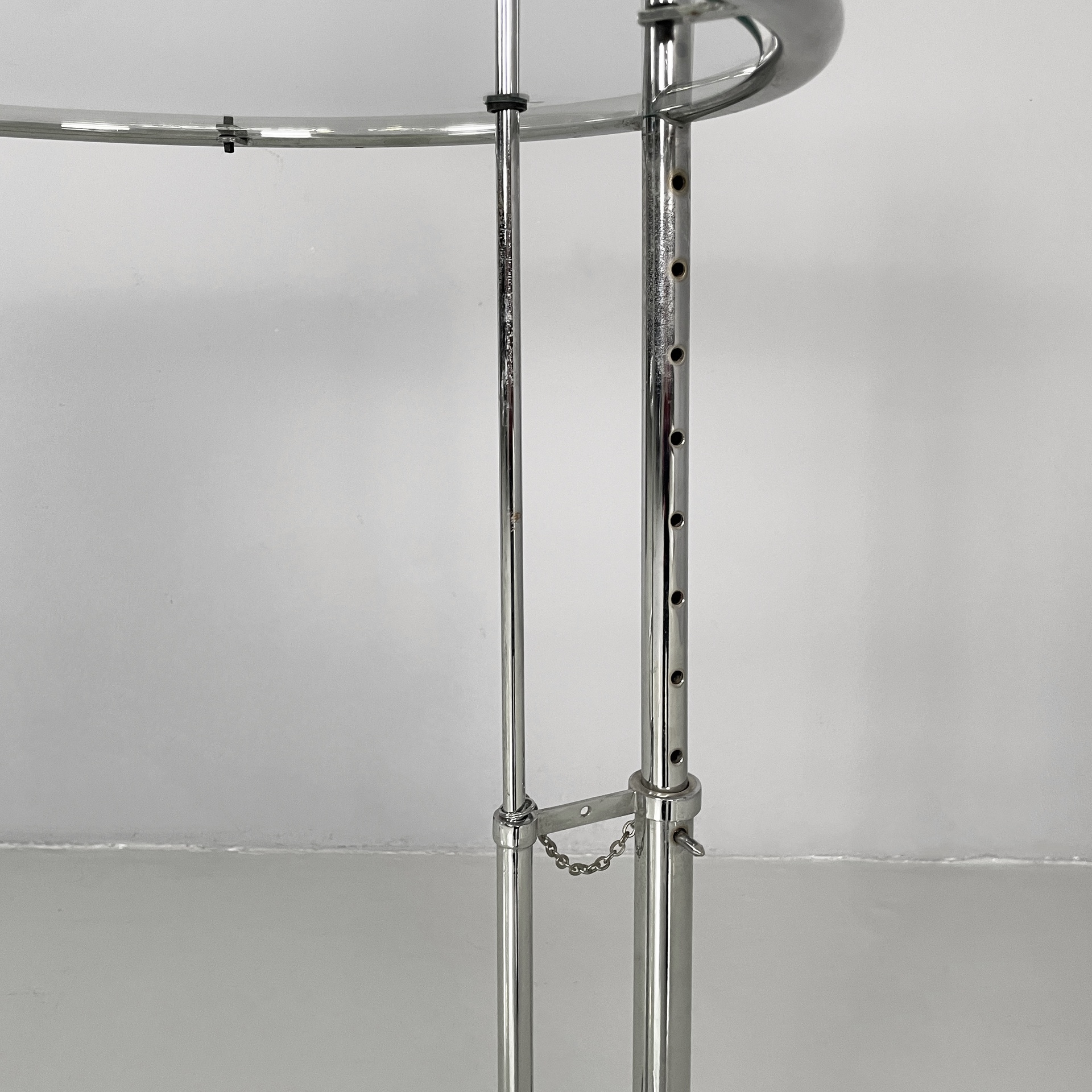 Coppia di tavoli da caffè con piano tondo in vetro. Il piano può essere regolato in altezza grazie alla struttura in tubolare di acciaio estraibile.