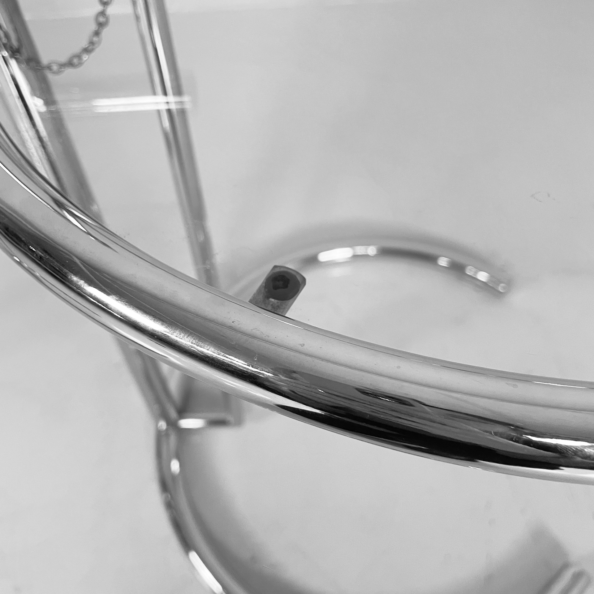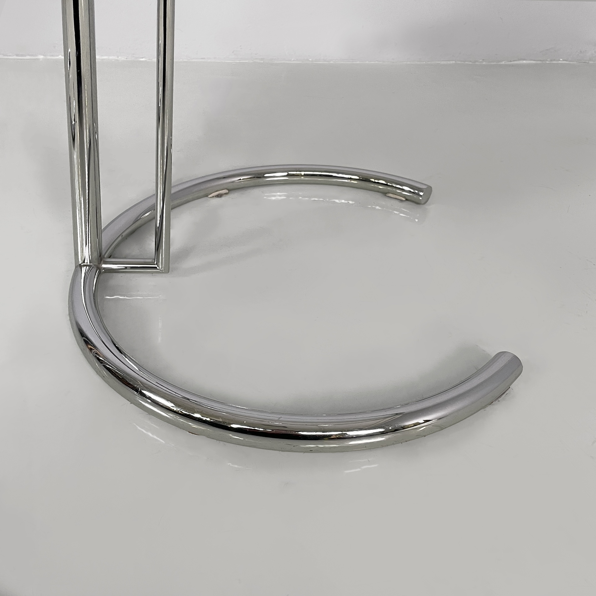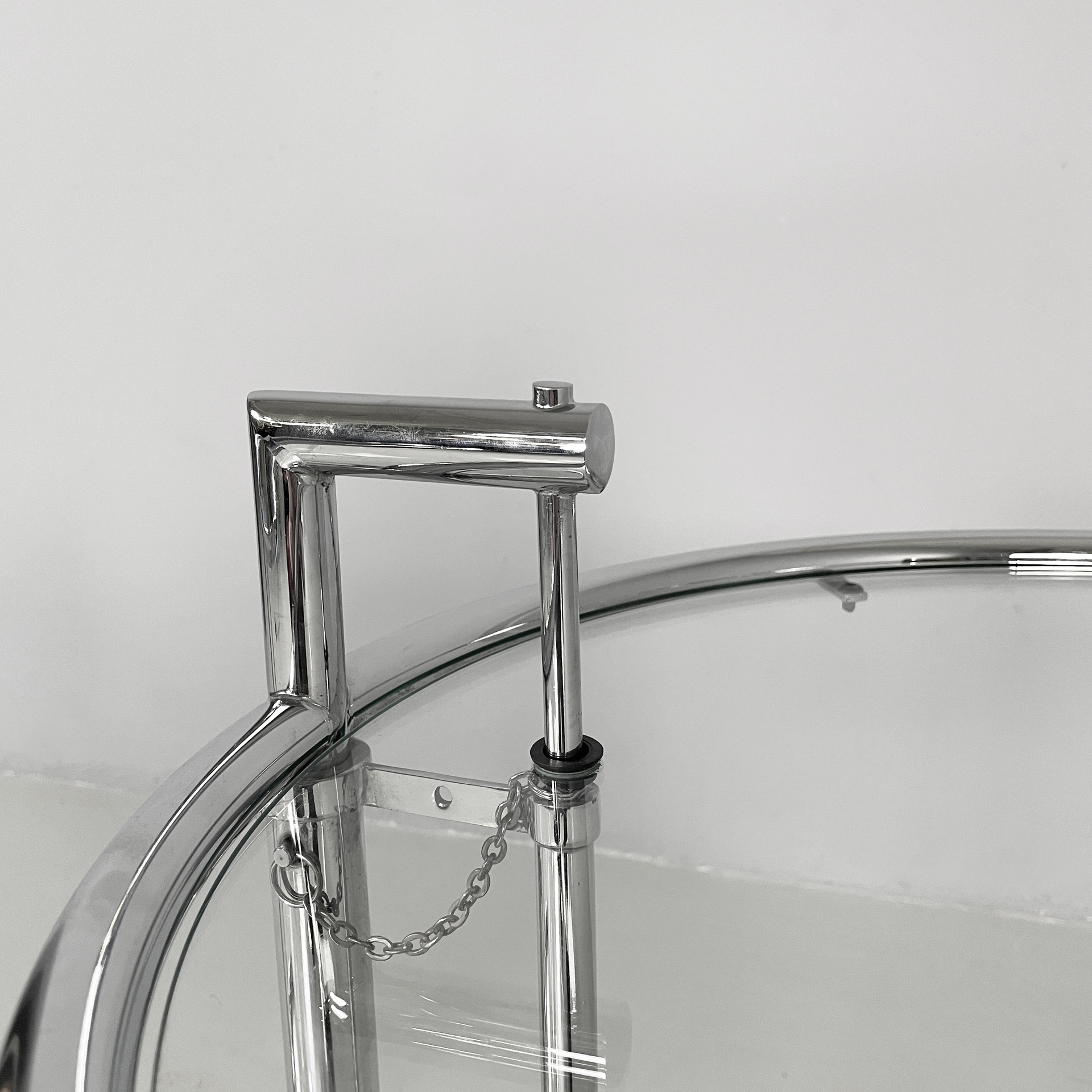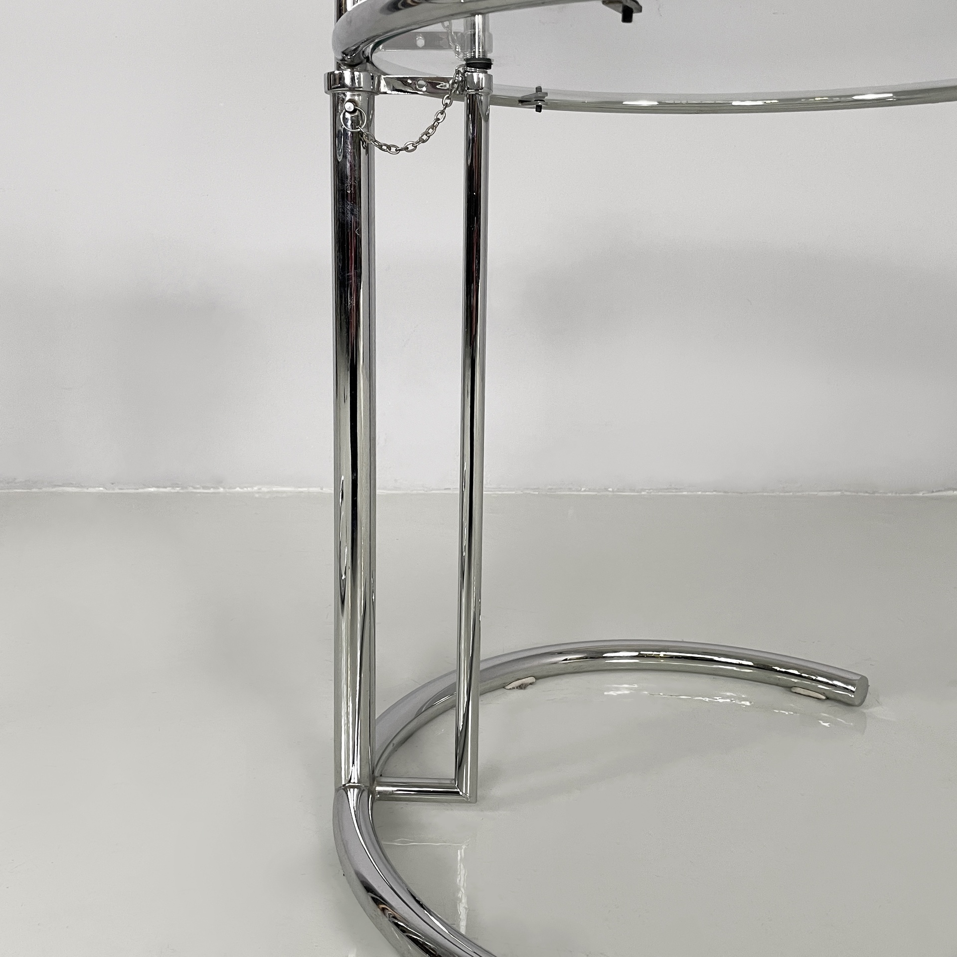 Coppia di tavoli da caffè con piano tondo in vetro. Il piano può essere regolato in altezza grazie alla struttura in tubolare di acciaio estraibile.
