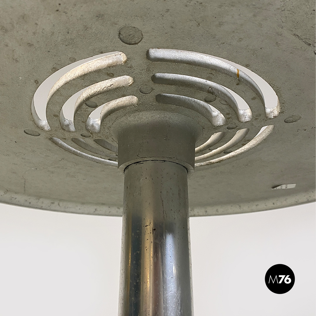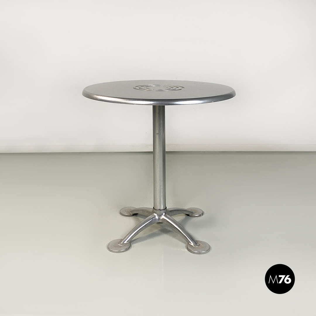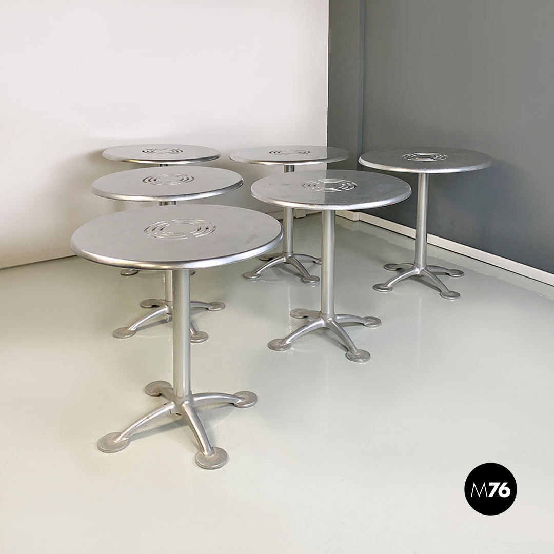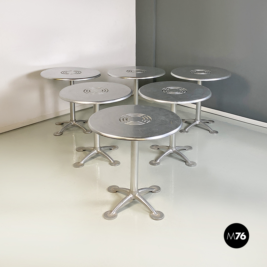 Set di sei tavoli da bar o da pranzo in fusione di alluminio satinato, con piano di forma tonda, con parti forate concentriche al centro. Basamento centrale a sezione tonda con quattro razze e puntale di forma tonda.