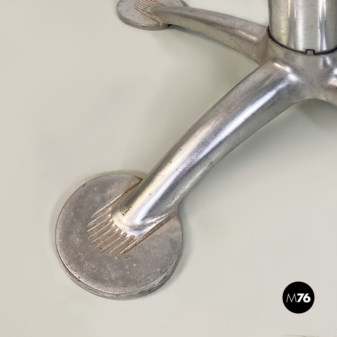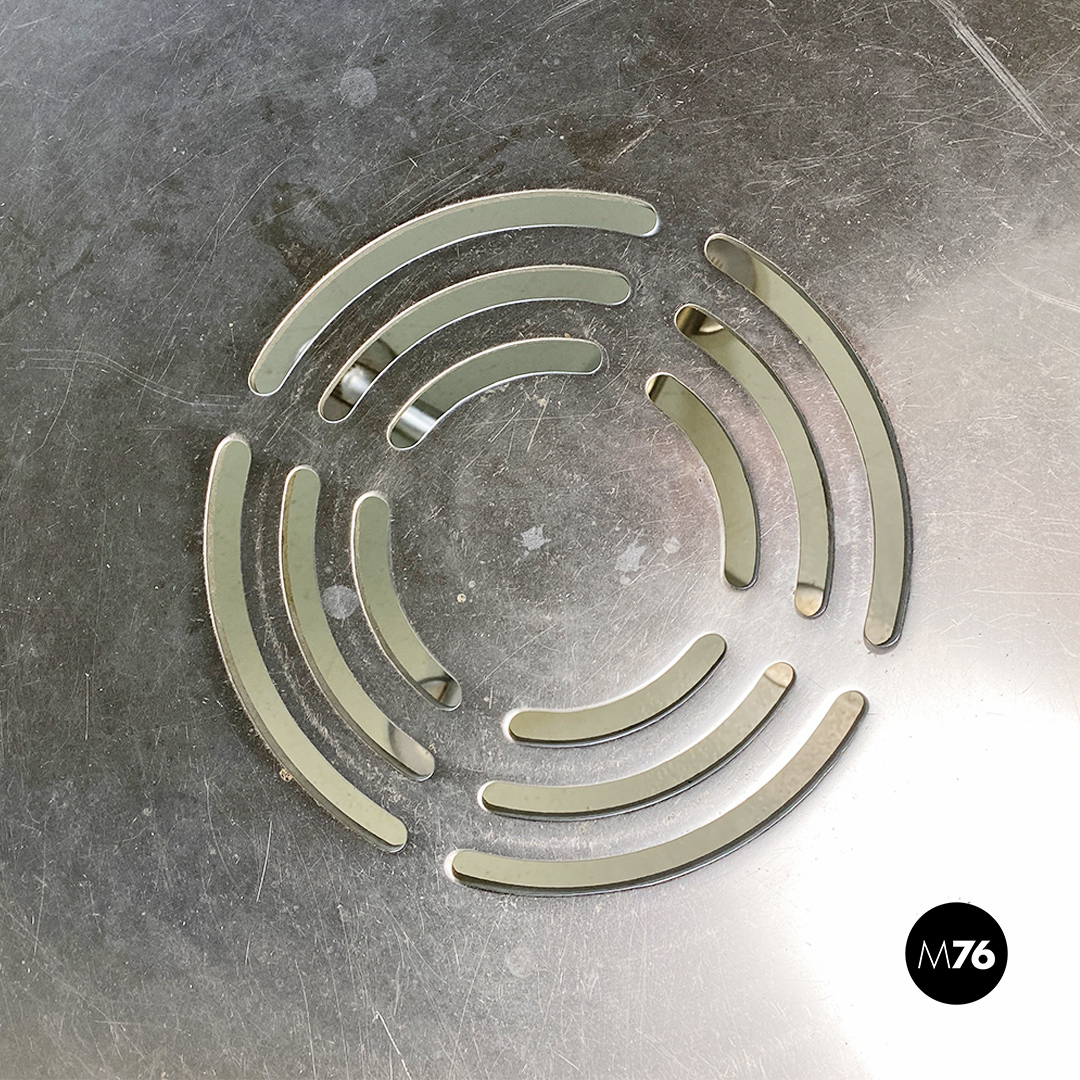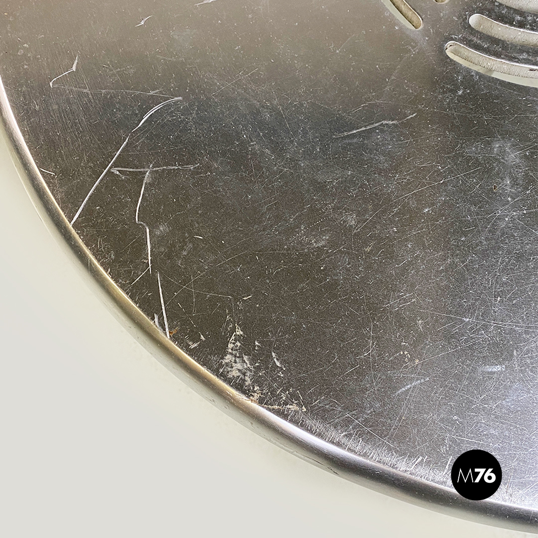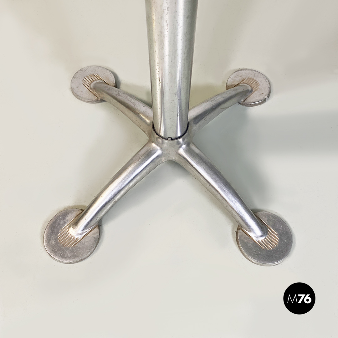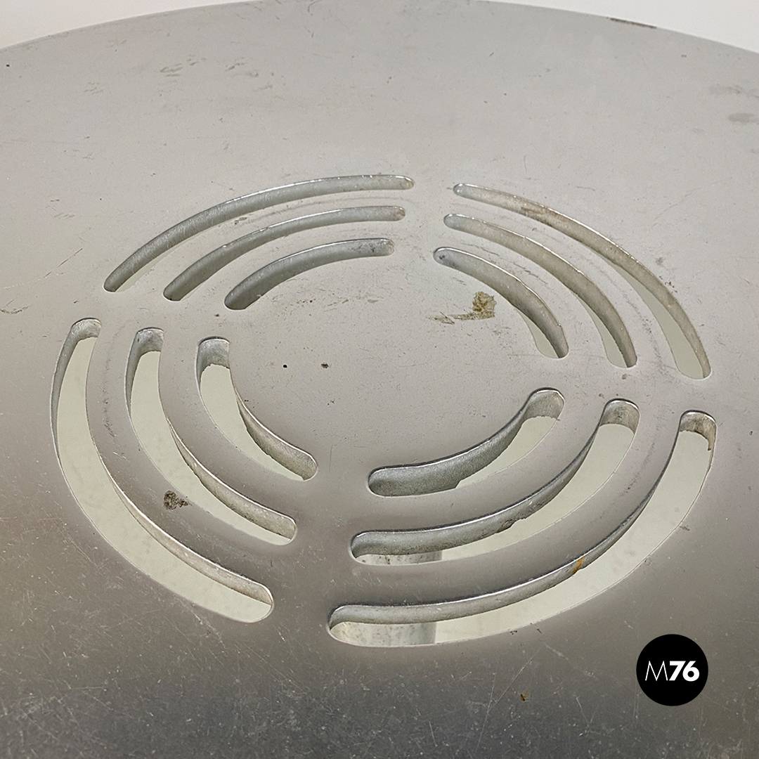 Set di sei tavoli da bar o da pranzo in fusione di alluminio satinato, con piano di forma tonda, con parti forate concentriche al centro. Basamento centrale a sezione tonda con quattro razze e puntale di forma tonda.