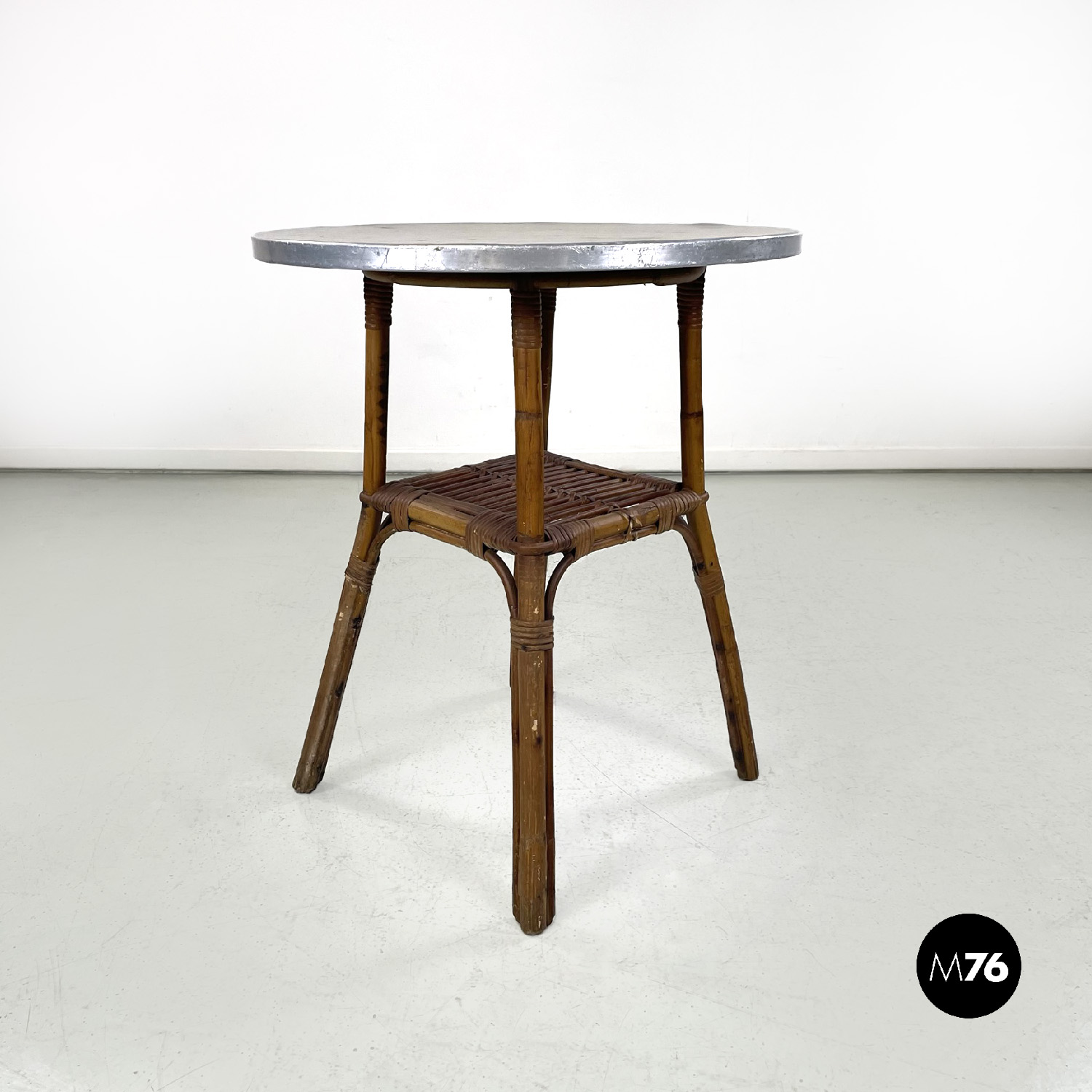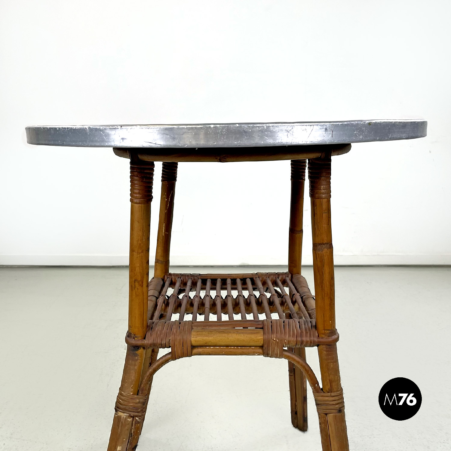 Set di tre tavoli da caffè tondi. Il piano tondo è in alluminio, la struttura è in bamboo finemente intrecciato e compone un piano nella parte centrale e le quattro gambe. Possono essere utilizzati anche in ambienti esterni come una terrazza o un giardino.
