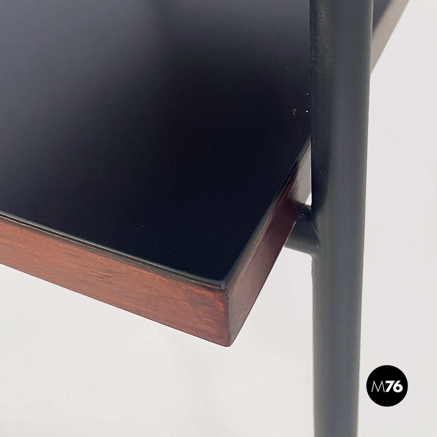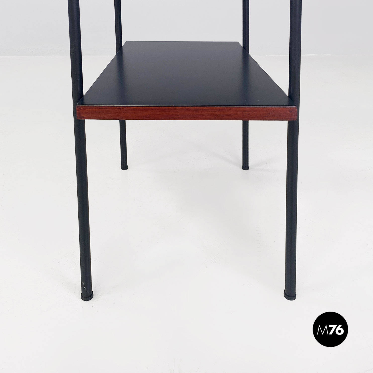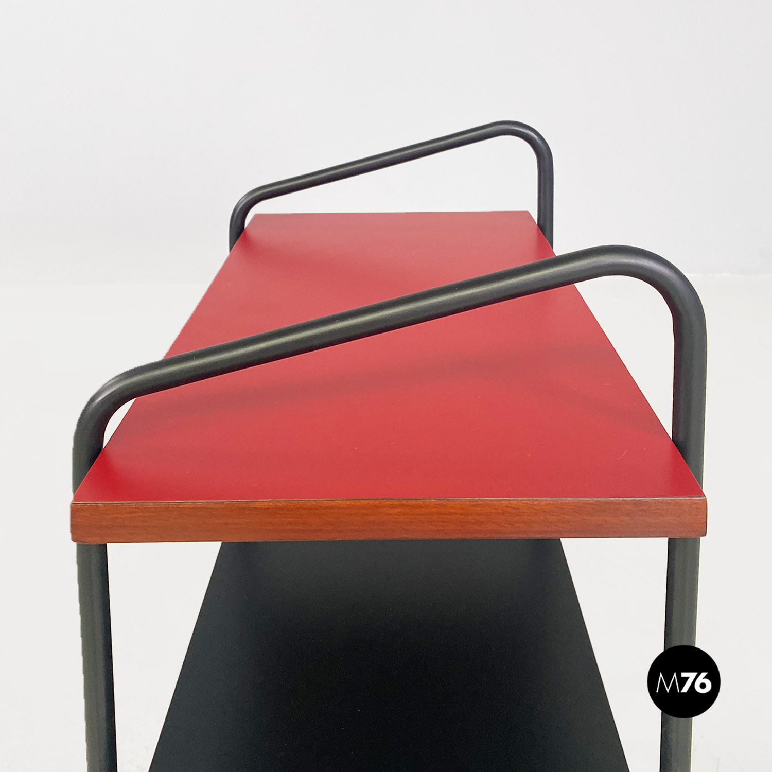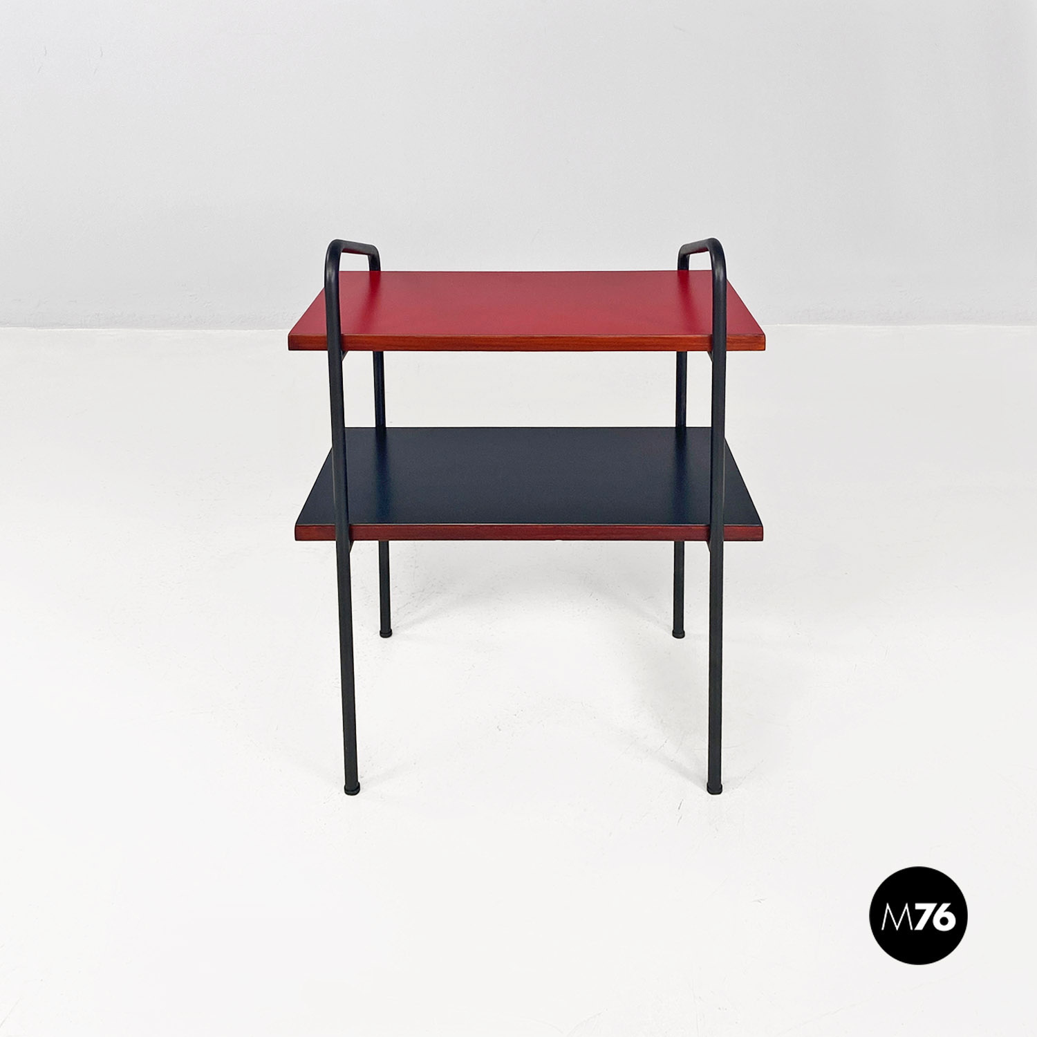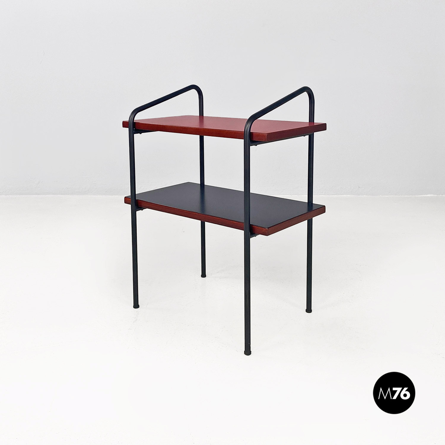 Coppia di comodini a doppio ripiano, rivestito in formica di colore rosso opaco nella parte alta e in nero opaco sulla mensola inferiore, con bordo marrone in tinta noce. La struttura è composta da tondini in metallo verniciato nero con finitura opaca su cui sono avvitati i ripiani. Il singolo elemento può essere utilizzato anche come tavolo da caffè o come un piccolo scaffale libreria da fianco divano.
