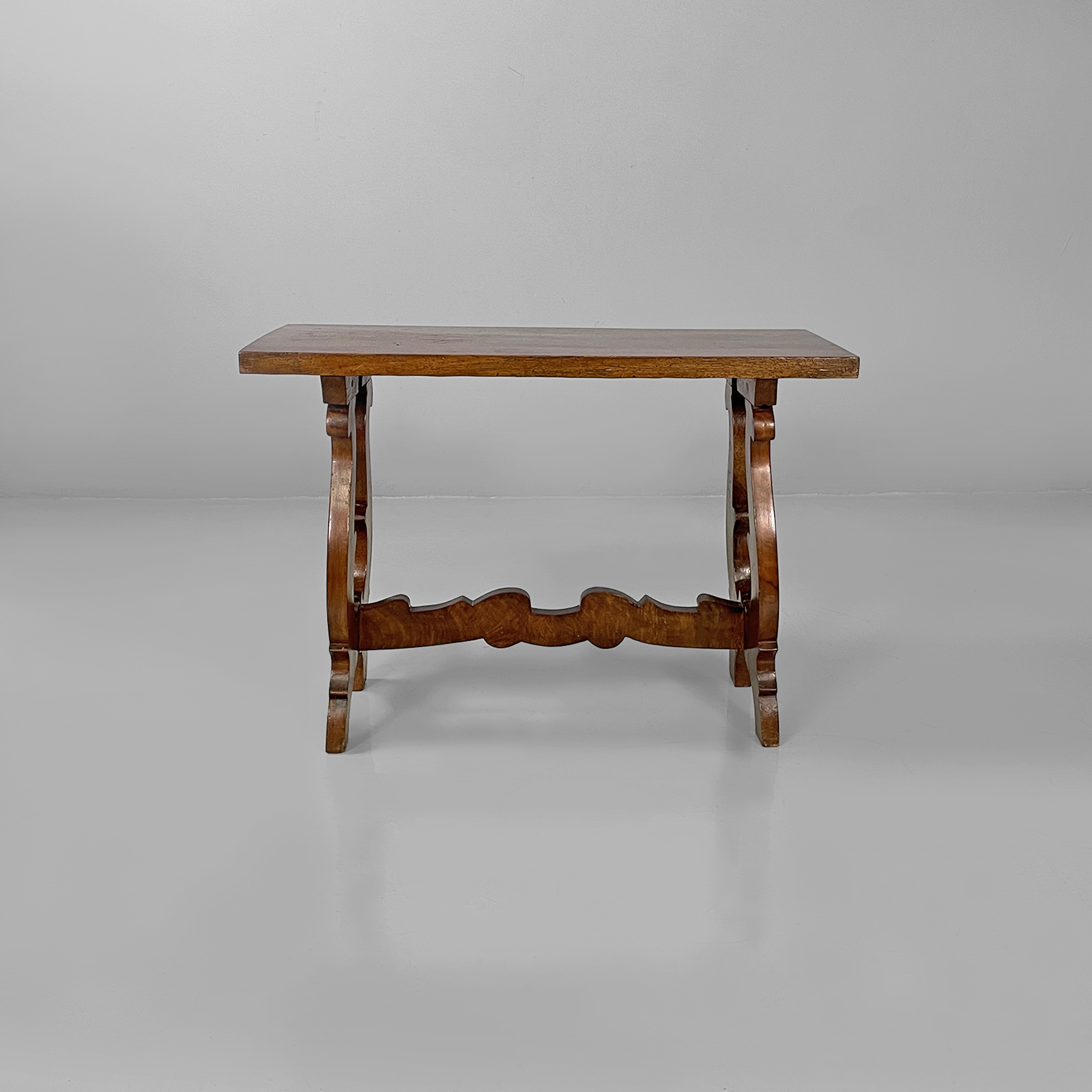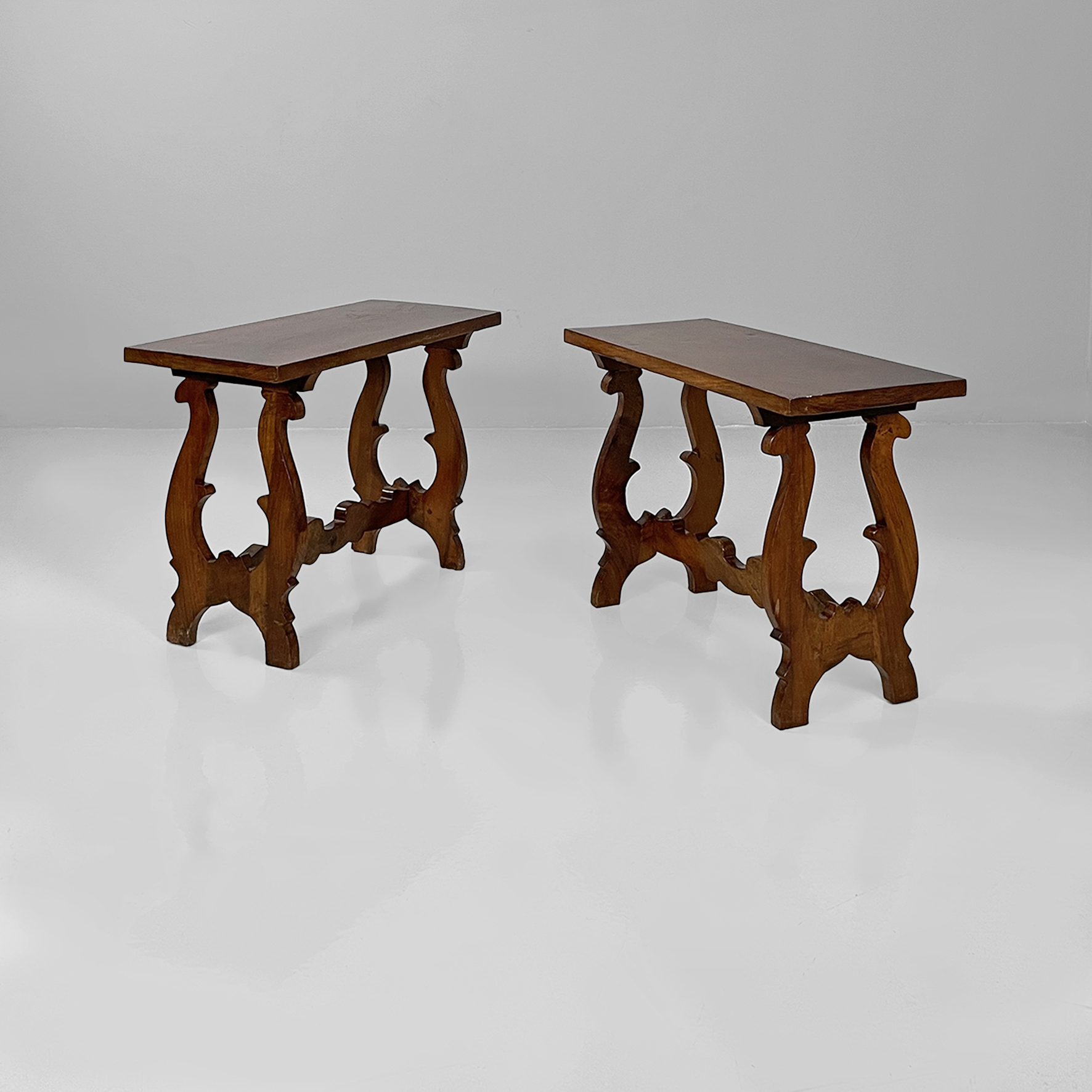 Coppia di tavoli da caffè interamente in legno. Il piano rettangolare è sostenuto da una coppia di zampe in legno finemente lavorato. In stile fine 1800. Utilizzabili anche come comodini.