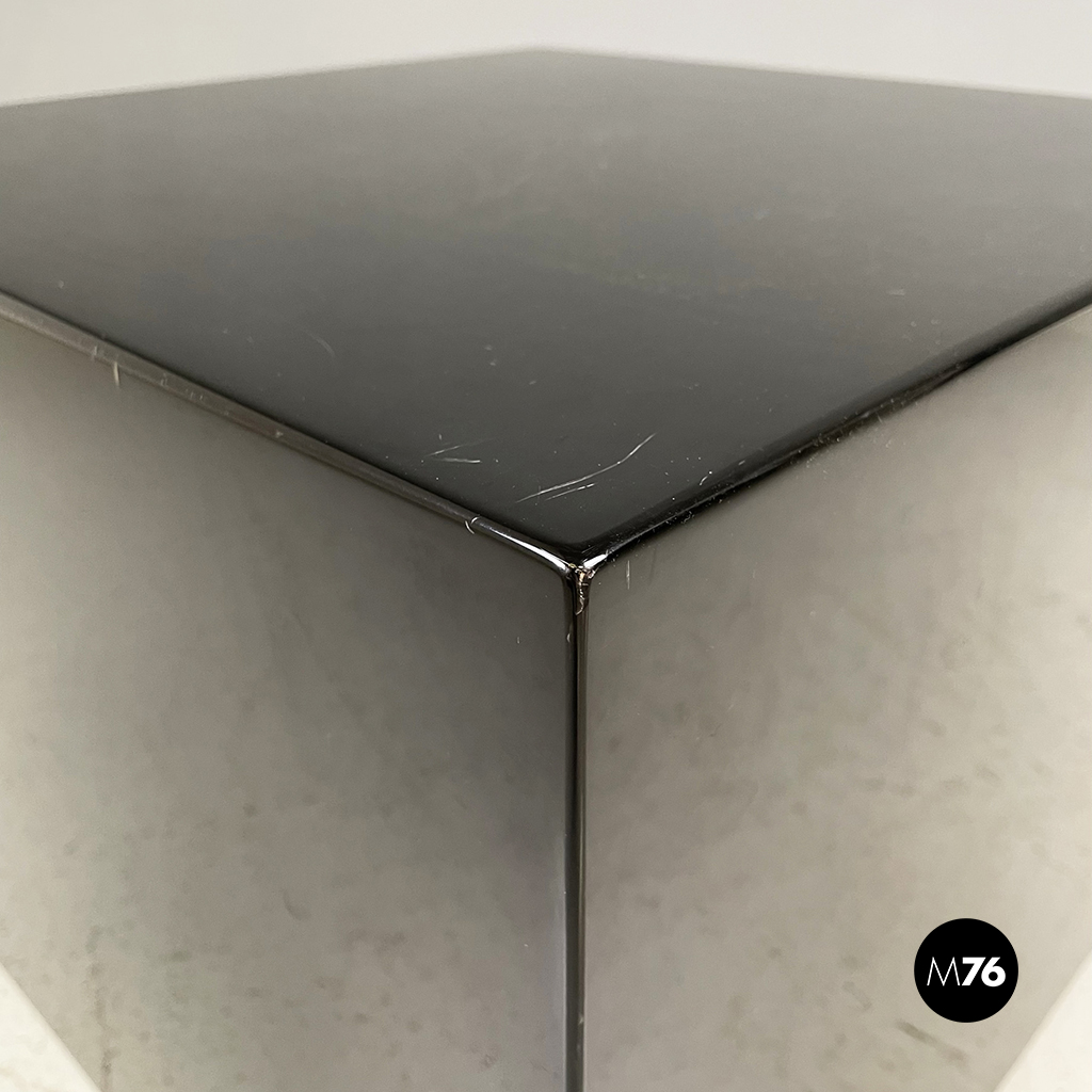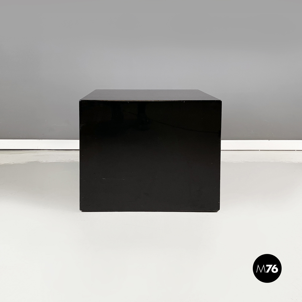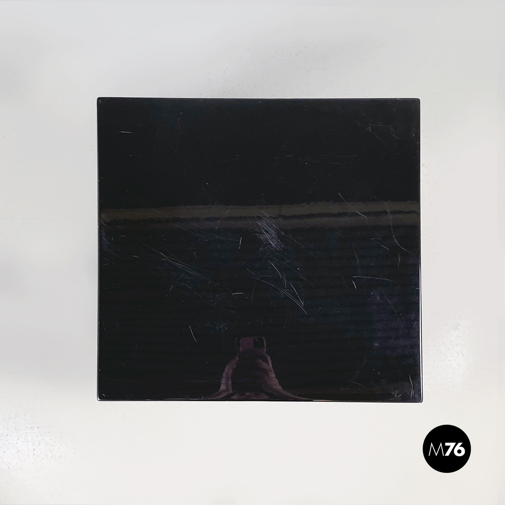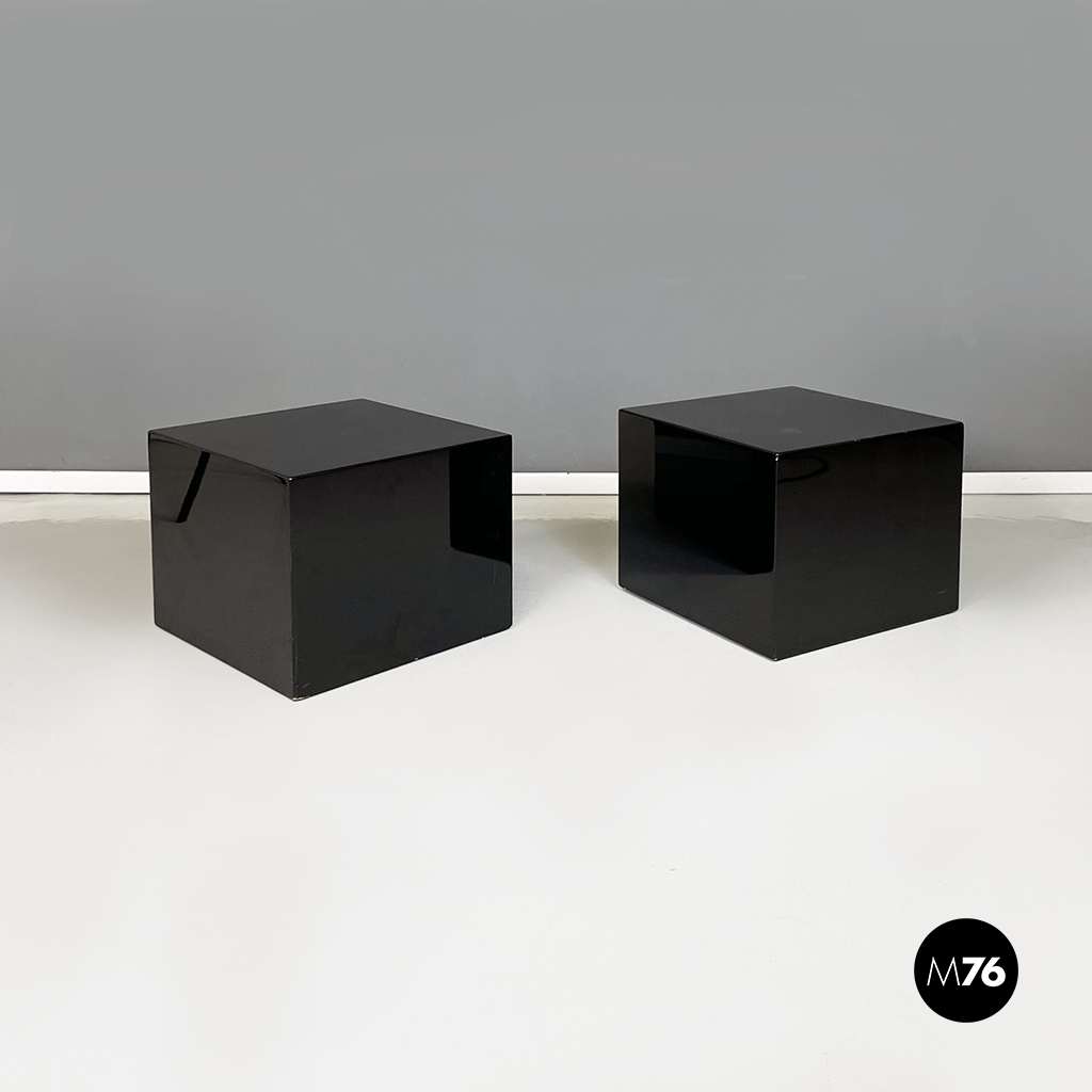 Coppia di tavoli da caffè con piano quadrato, interamente in legno laccato nero. I bordi del tavolo sono arrotondati. Alla base sono presenti delle ruote. Possono essere usati anche come comodini, espositori, piedistalli o tavoli laterali.