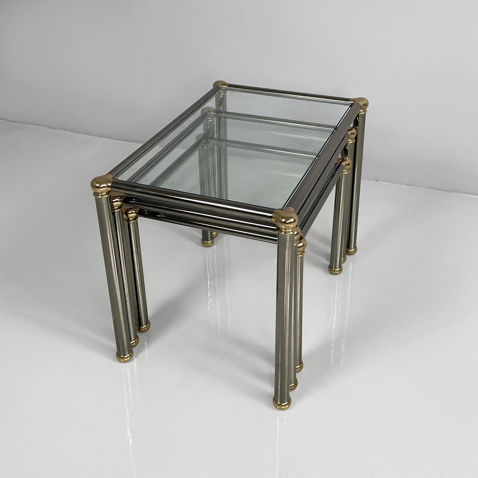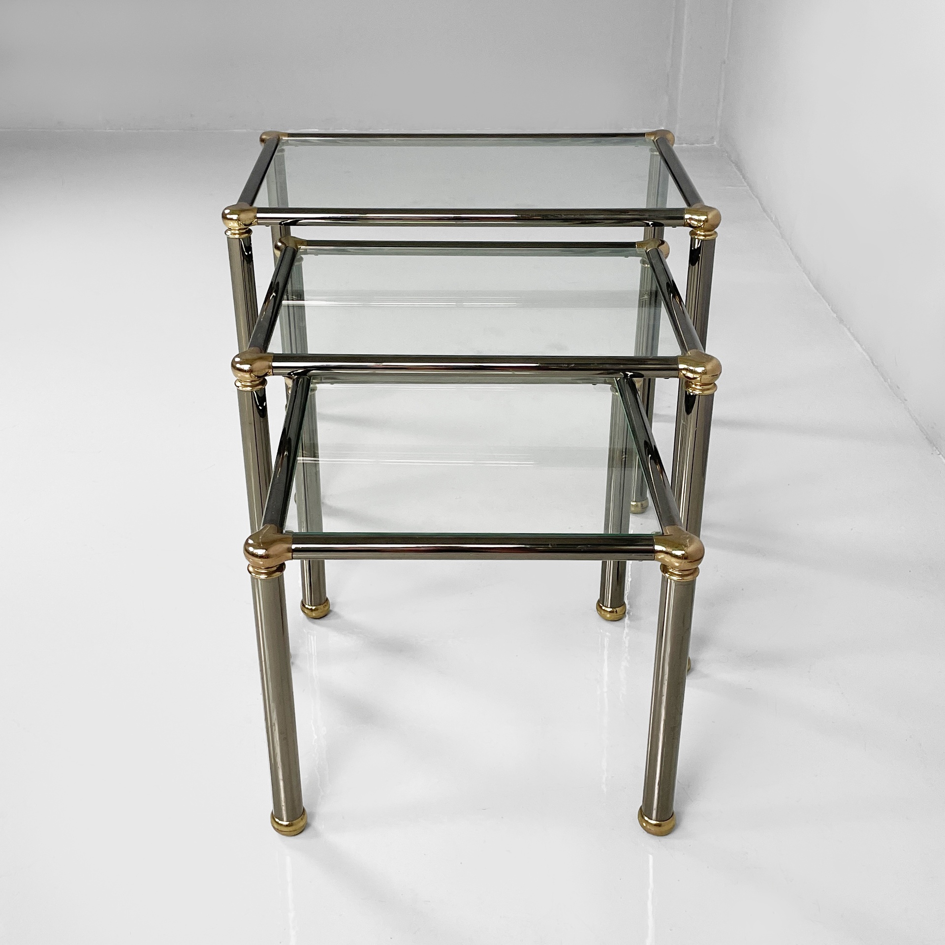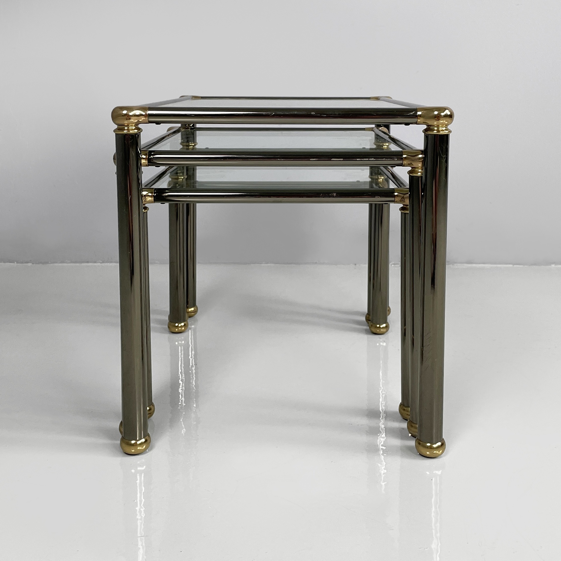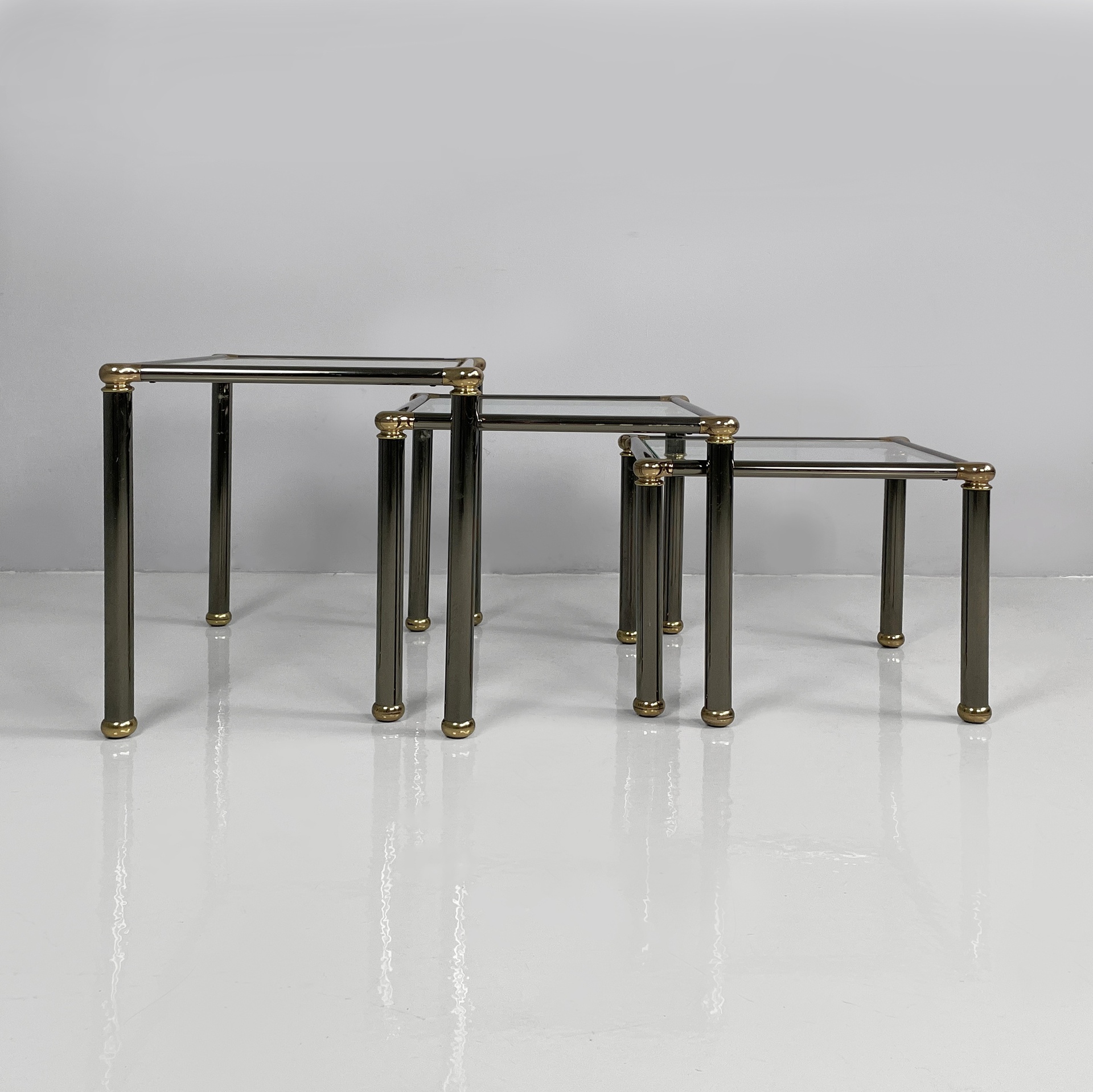 Set di tre tavoli da caffè con piano squadrato in vetro. La struttura e le zampe sono composte da tubolari di metallo anodizzato verniciato grigio con angoli in metallo dorato. Piedini sferici in metallo dorato. I tre tavoli presentano altezze differenti e possono essere inseriti uno dentro l’altro.