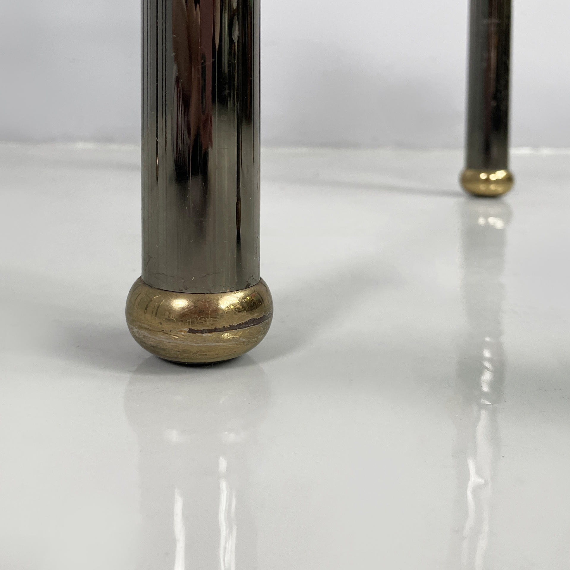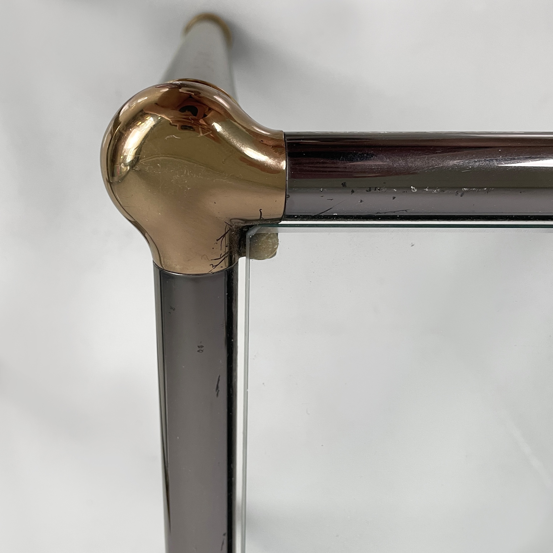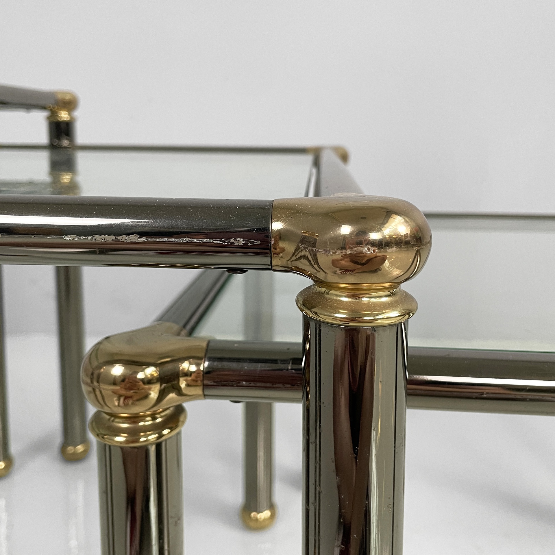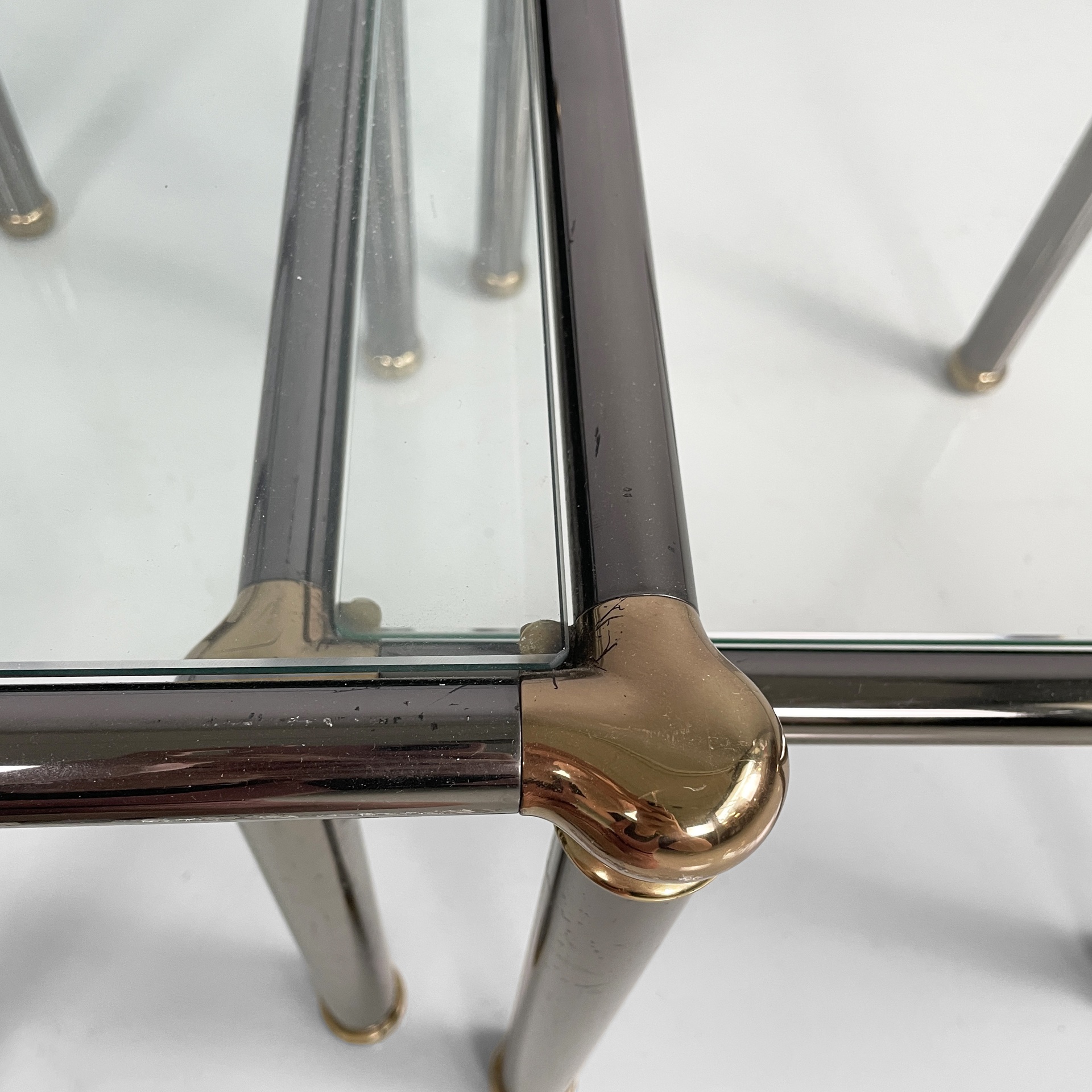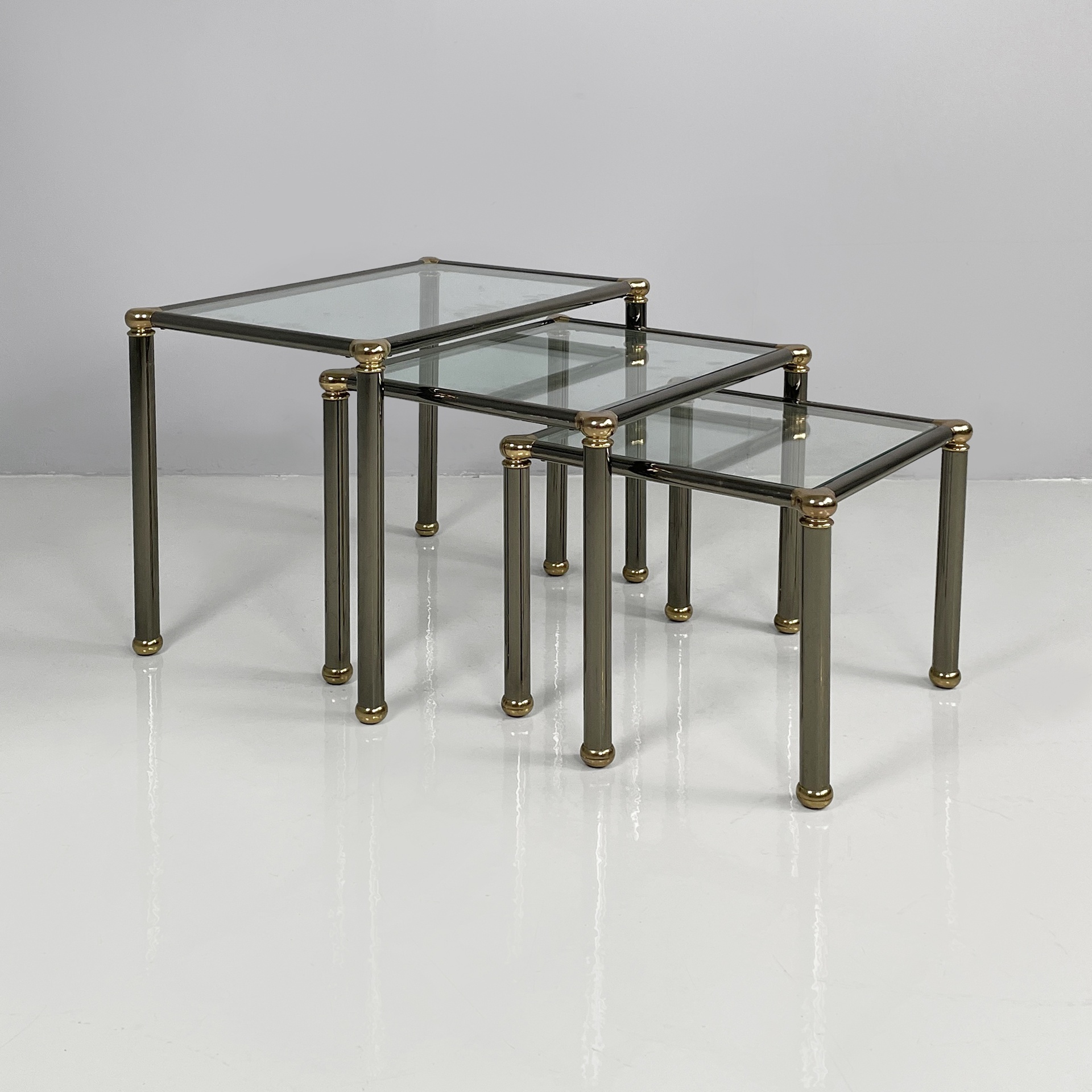 Set di tre tavoli da caffè con piano squadrato in vetro. La struttura e le zampe sono composte da tubolari di metallo anodizzato verniciato grigio con angoli in metallo dorato. Piedini sferici in metallo dorato. I tre tavoli presentano altezze differenti e possono essere inseriti uno dentro l’altro.