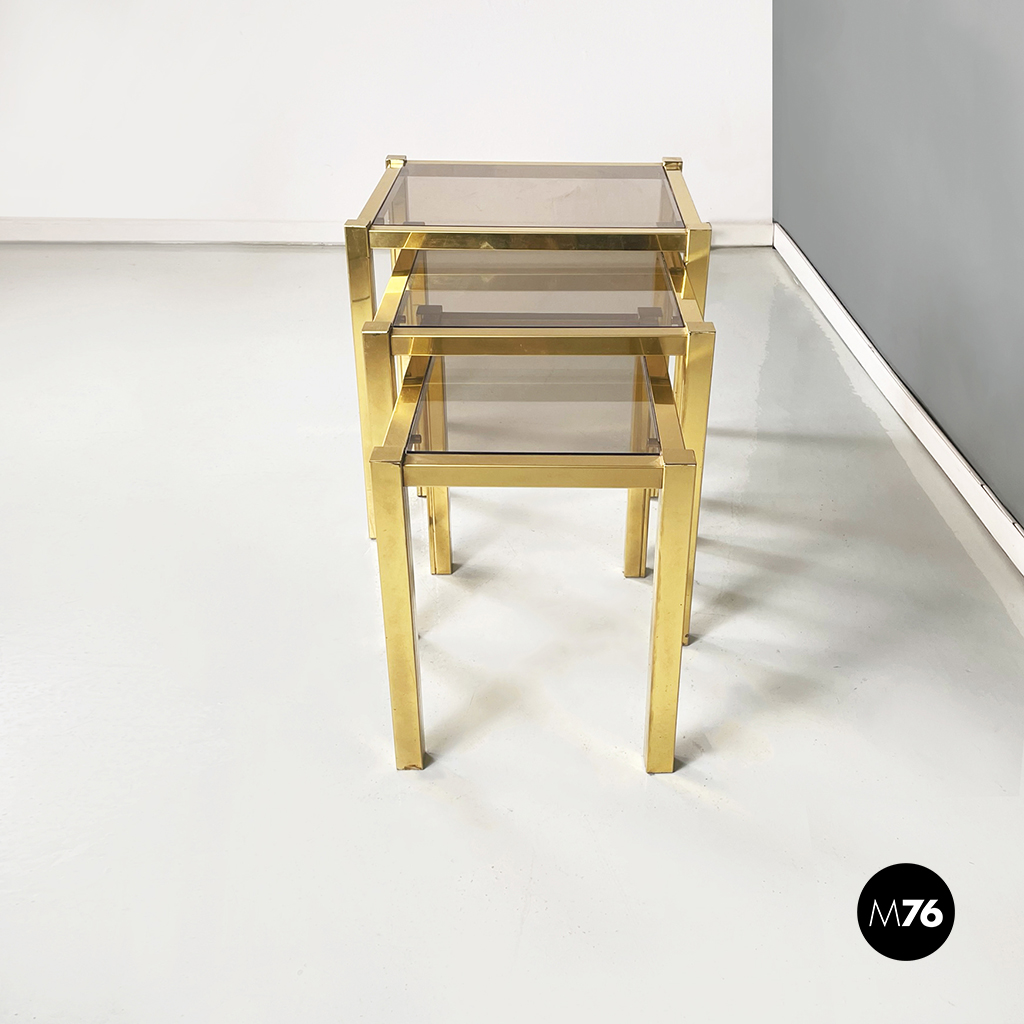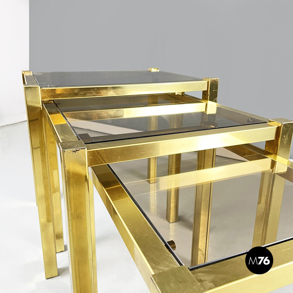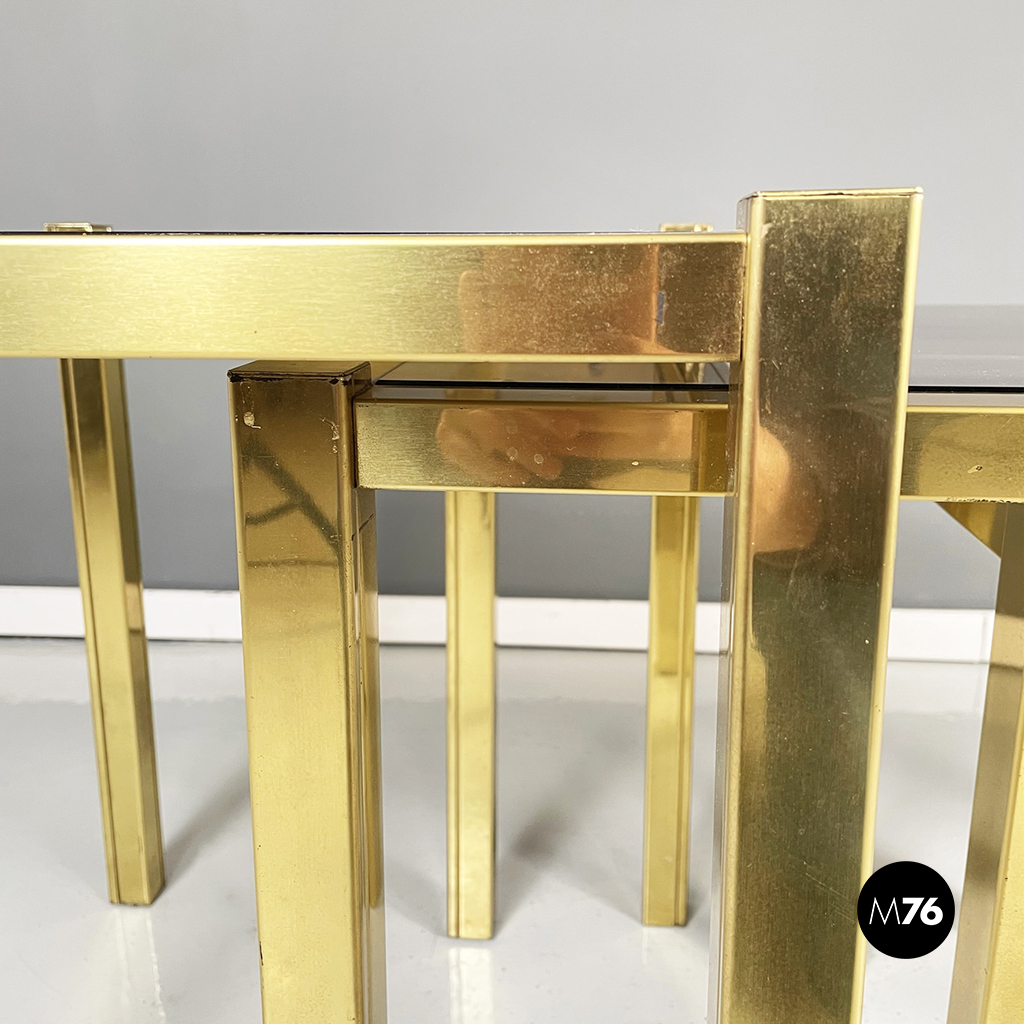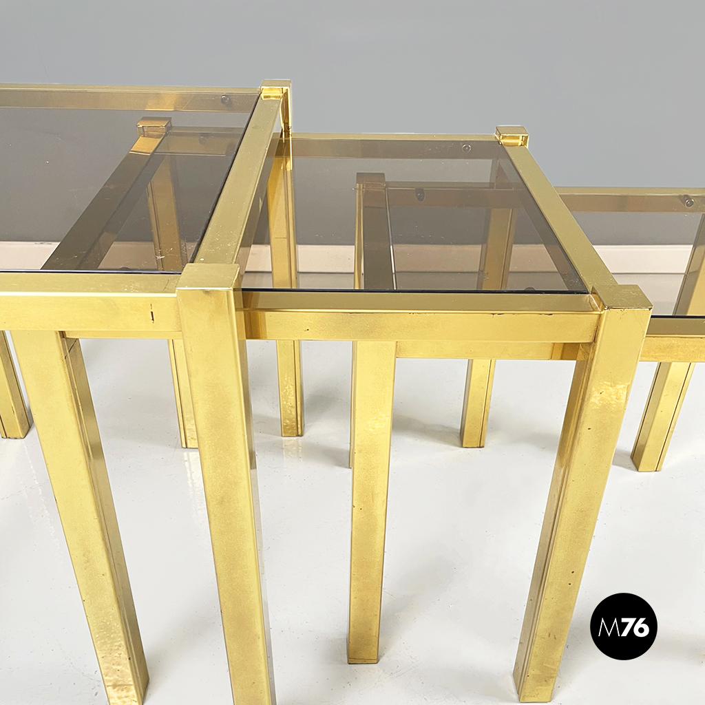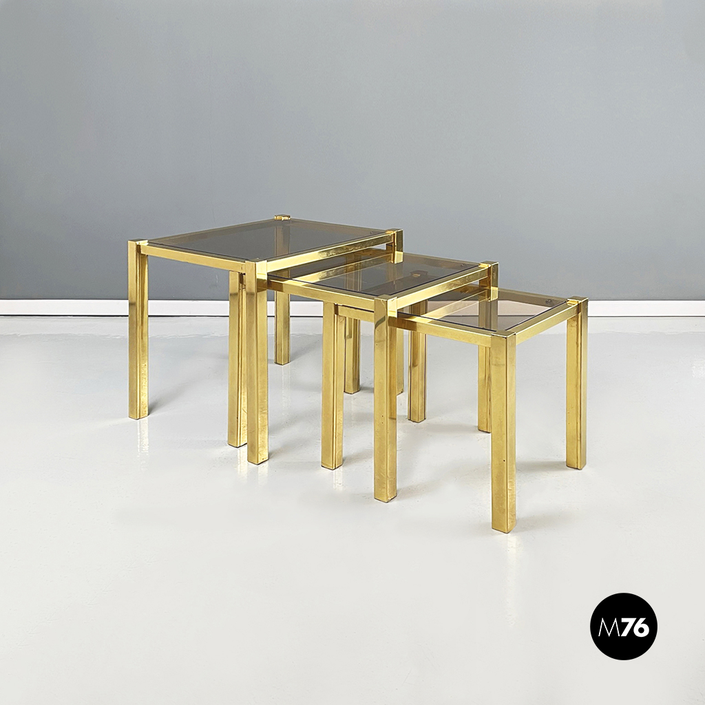Tris di tavoli da caffè con piani rettangolari in vetro fumé. La struttura del tavolo è a sezione quadrata, in ottone. I tavoli sono inseribili uno dentro l’altro.