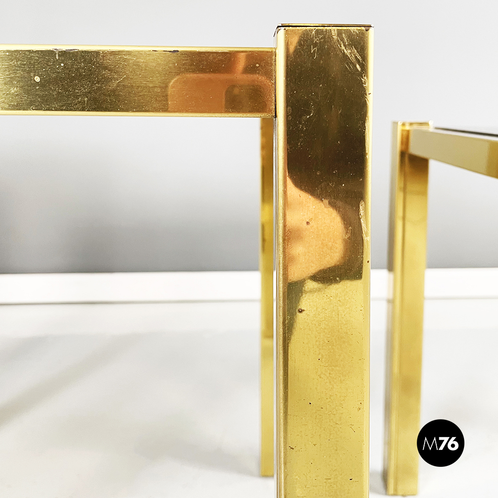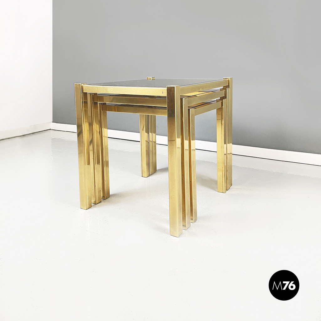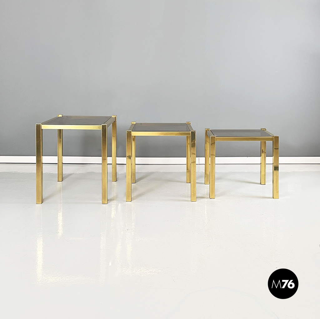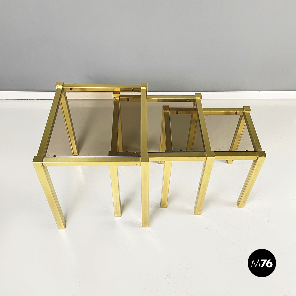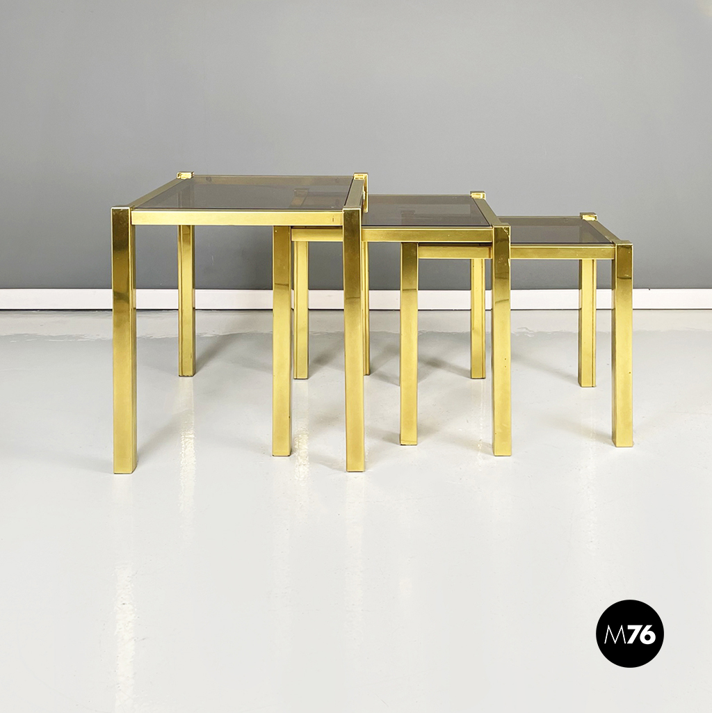 Tris di tavoli da caffè con piani rettangolari in vetro fumé. La struttura del tavolo è a sezione quadrata, in ottone. I tavoli sono inseribili uno dentro l’altro.