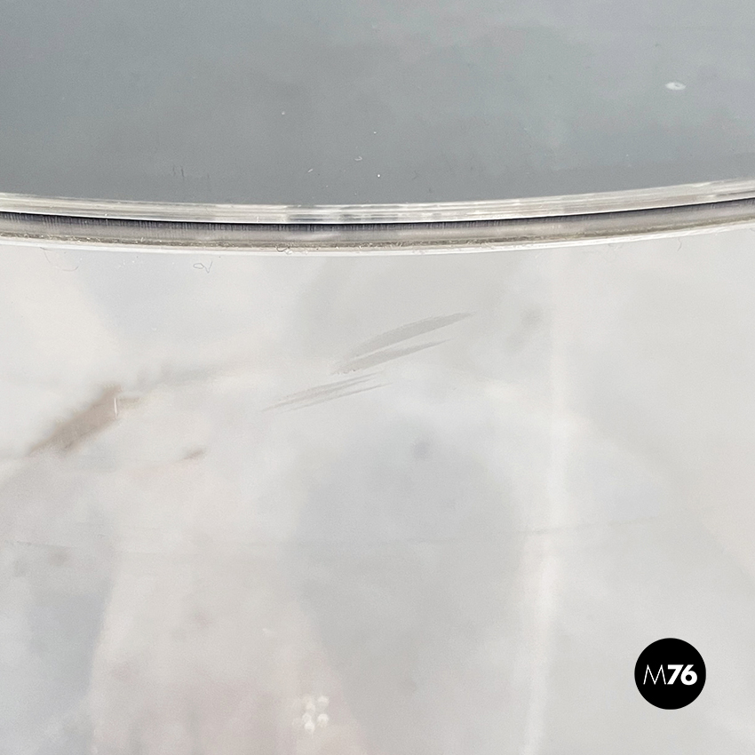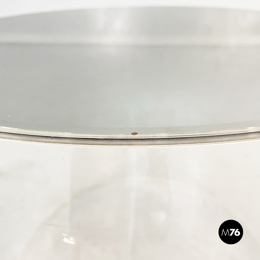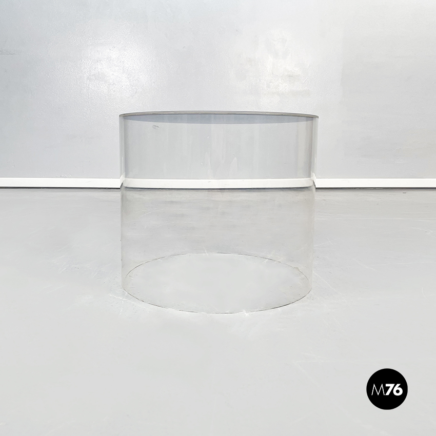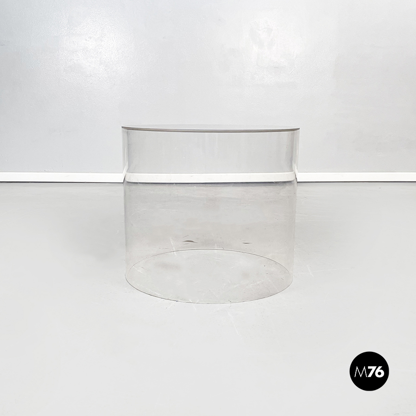 Coppia di tavoli da caffè di forma cilindrica, in plexiglass. Il tavolo più grande presenta un piano tondo sul grigio, mentre il più piccolo in blu. I lati sono in plexiglass trasparente. I due tavoli possono essere usate separati o uno dentro l’altro. La particolarità di questi tavoli sta nel fatto che, quando sono inseriti uno dentro l’altro, ruotando il colore dei piani cambia.