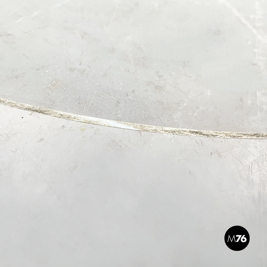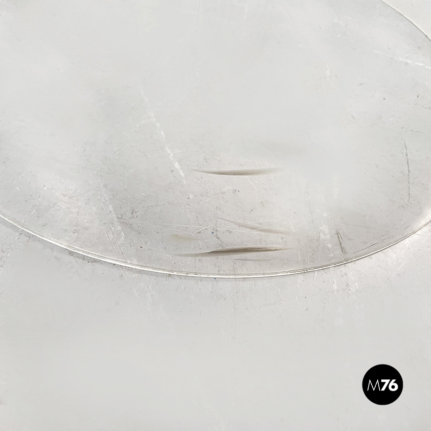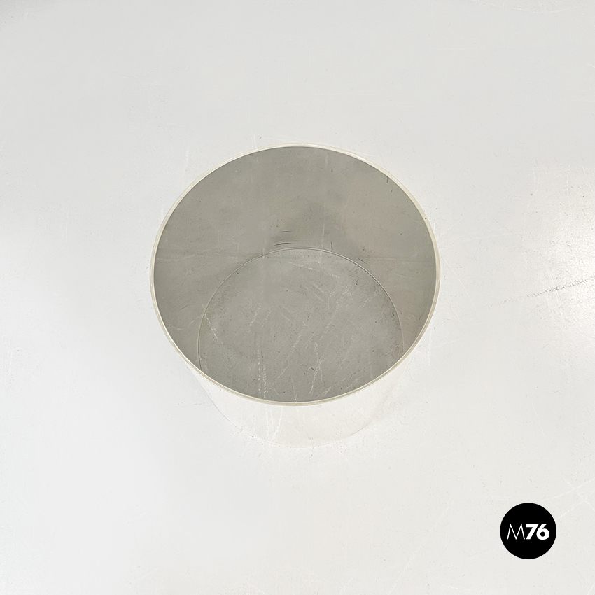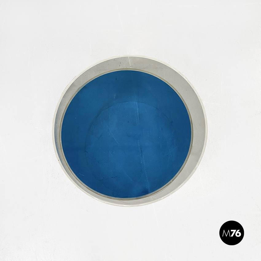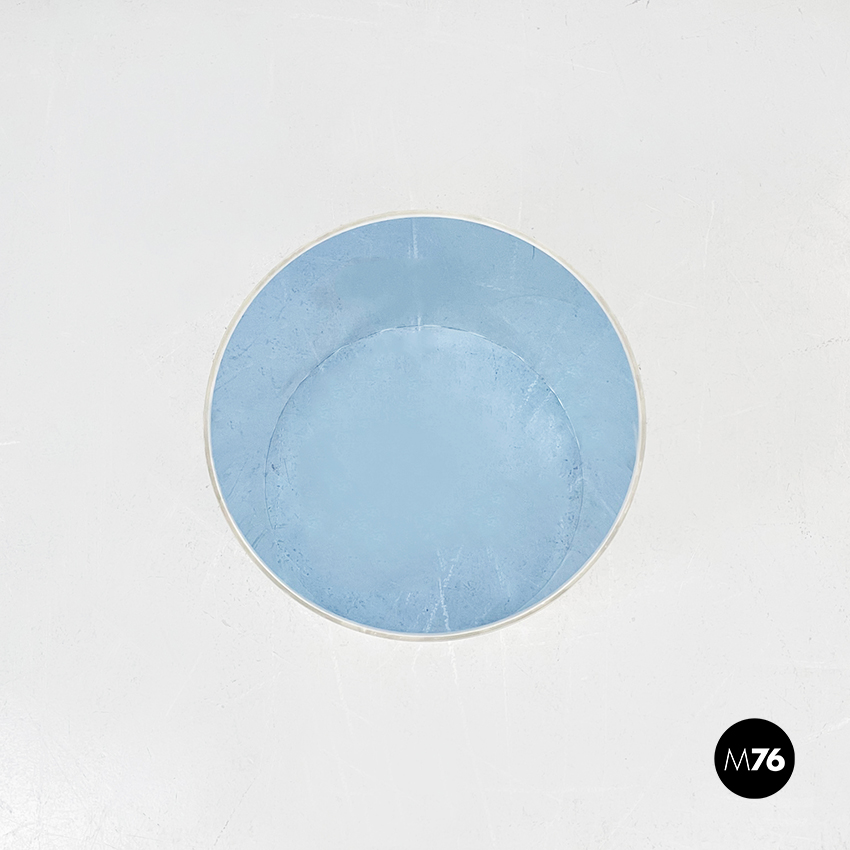 Coppia di tavoli da caffè di forma cilindrica, in plexiglass. Il tavolo più grande presenta un piano tondo sul grigio, mentre il più piccolo in blu. I lati sono in plexiglass trasparente. I due tavoli possono essere usate separati o uno dentro l’altro. La particolarità di questi tavoli sta nel fatto che, quando sono inseriti uno dentro l’altro, ruotando il colore dei piani cambia.