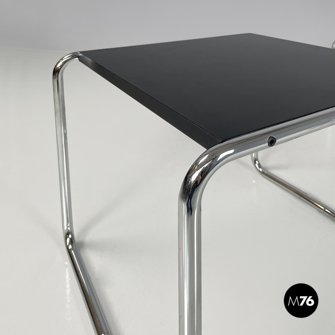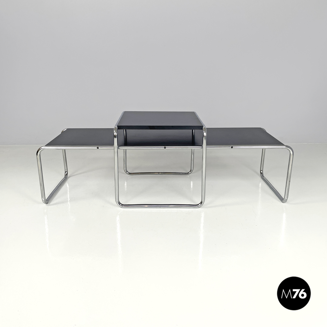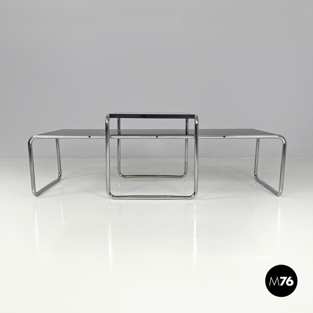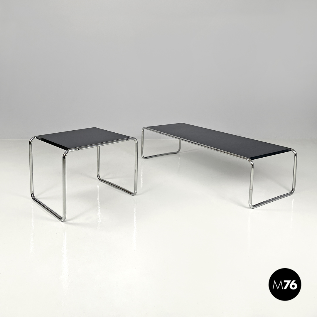 Tavoli da caffè modello Laccio in legno e metallo. Le strutture sono in tubolare di acciaio cromato, e formano le gambe e la struttura portante. I piani sono di due altezze e due lunghezze diverse: quello con il piano più piccolo è quadrato ed è più alto, quello con il piano rettangolare allungato è più basso. Entrambi i piani sono di legno rivestiti di laminato nero. Questi tavoli possono essere utilizzati divisi o uno sopra l’altro.