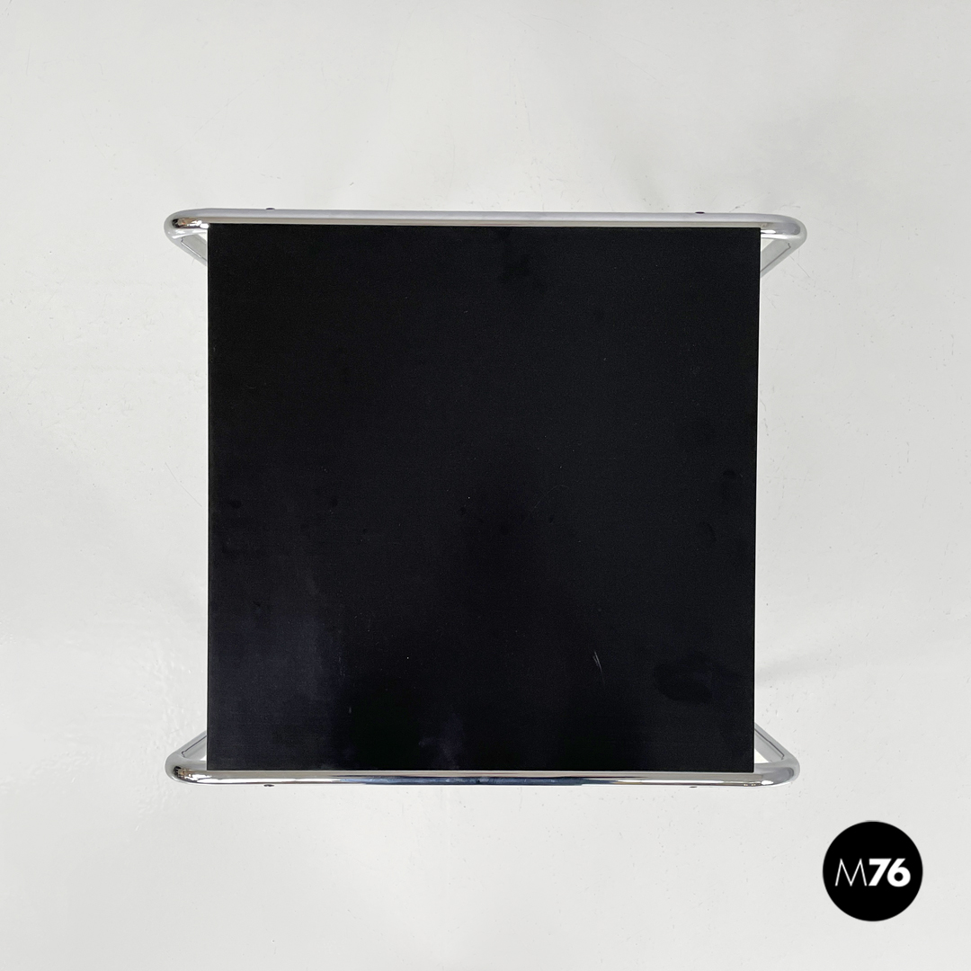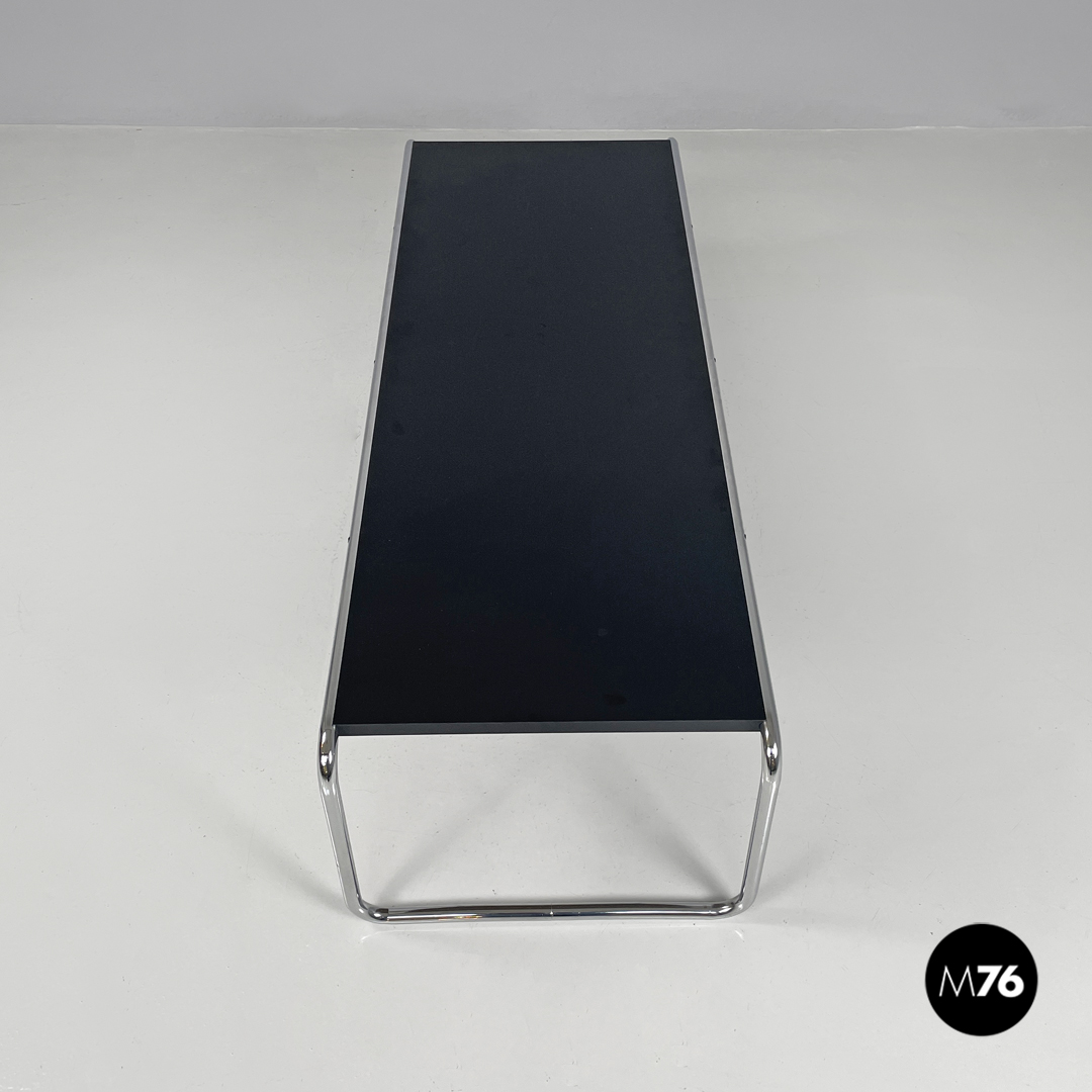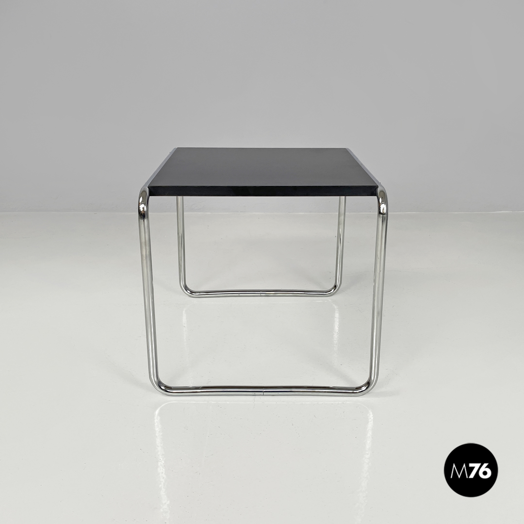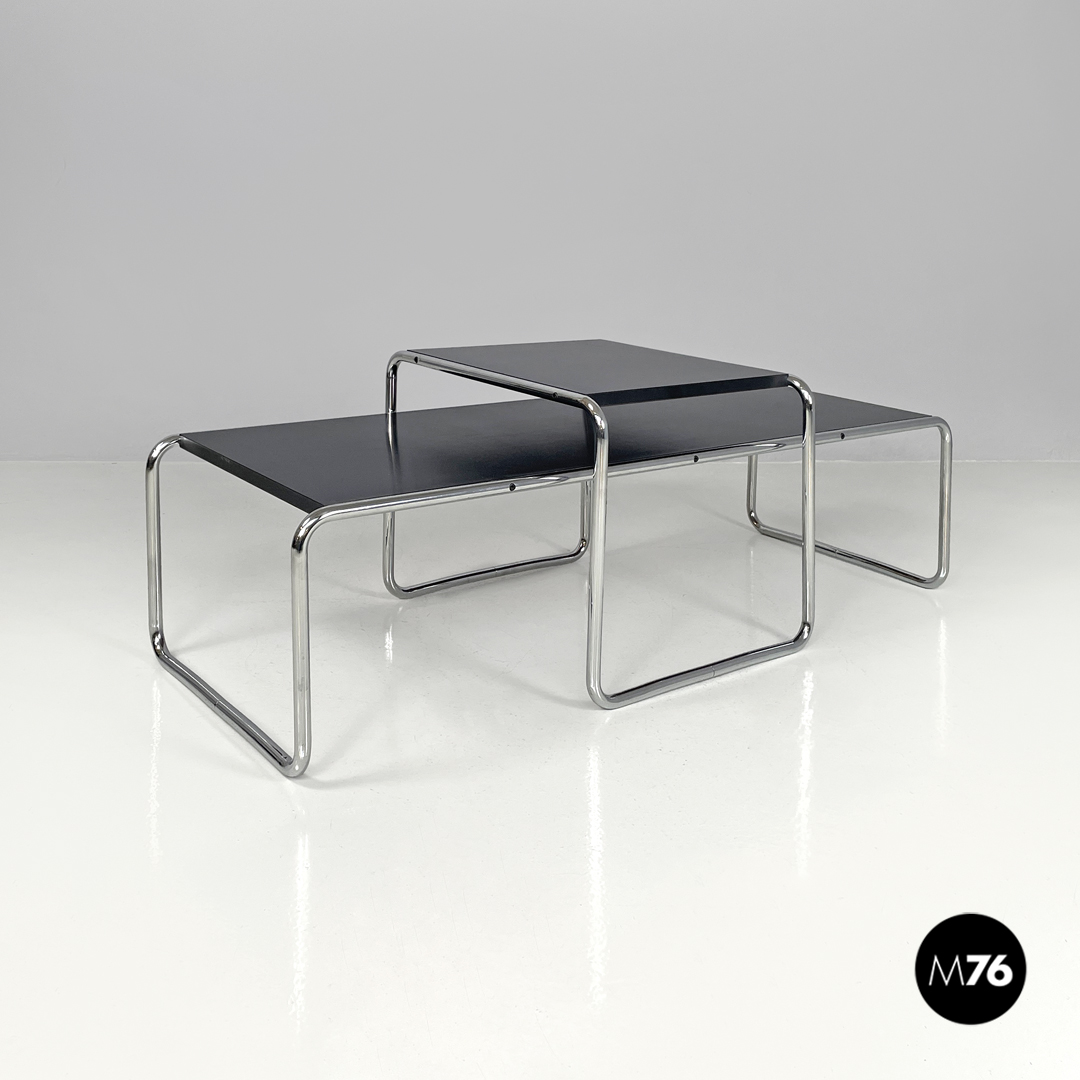 Tavoli da caffè modello Laccio in legno e metallo. Le strutture sono in tubolare di acciaio cromato, e formano le gambe e la struttura portante. I piani sono di due altezze e due lunghezze diverse: quello con il piano più piccolo è quadrato ed è più alto, quello con il piano rettangolare allungato è più basso. Entrambi i piani sono di legno rivestiti di laminato nero. Questi tavoli possono essere utilizzati divisi o uno sopra l’altro.