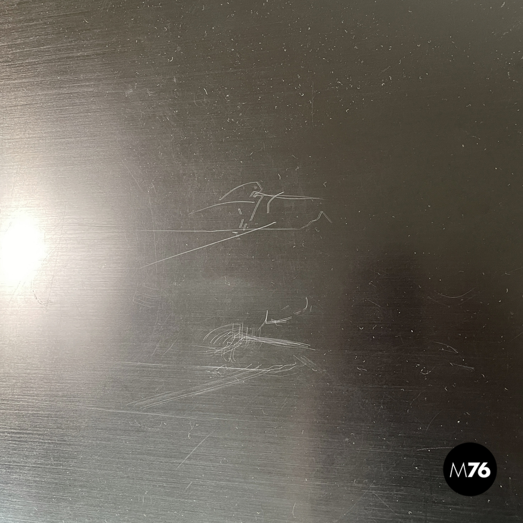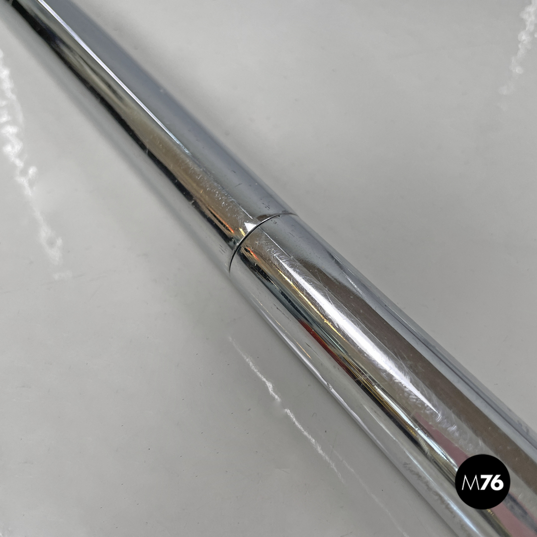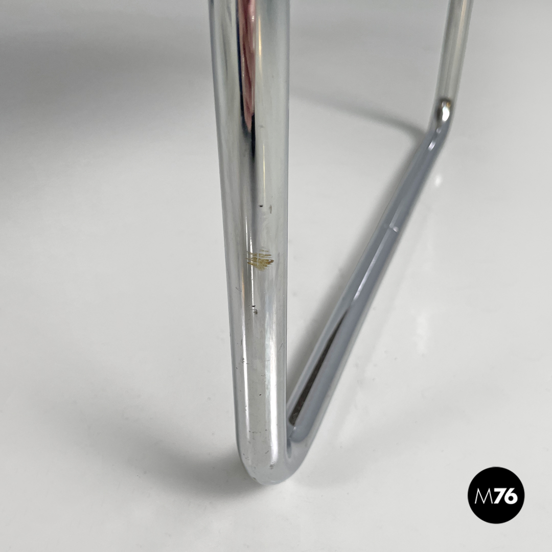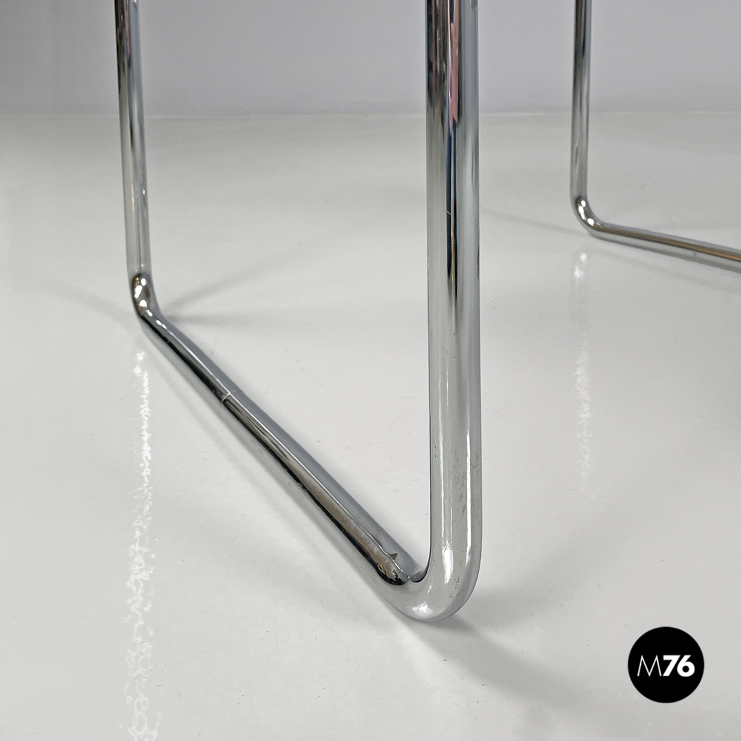Tavoli da caffè modello Laccio in legno e metallo. Le strutture sono in tubolare di acciaio cromato, e formano le gambe e la struttura portante. I piani sono di due altezze e due lunghezze diverse: quello con il piano più piccolo è quadrato ed è più alto, quello con il piano rettangolare allungato è più basso. Entrambi i piani sono di legno rivestiti di laminato nero. Questi tavoli possono essere utilizzati divisi o uno sopra l’altro.