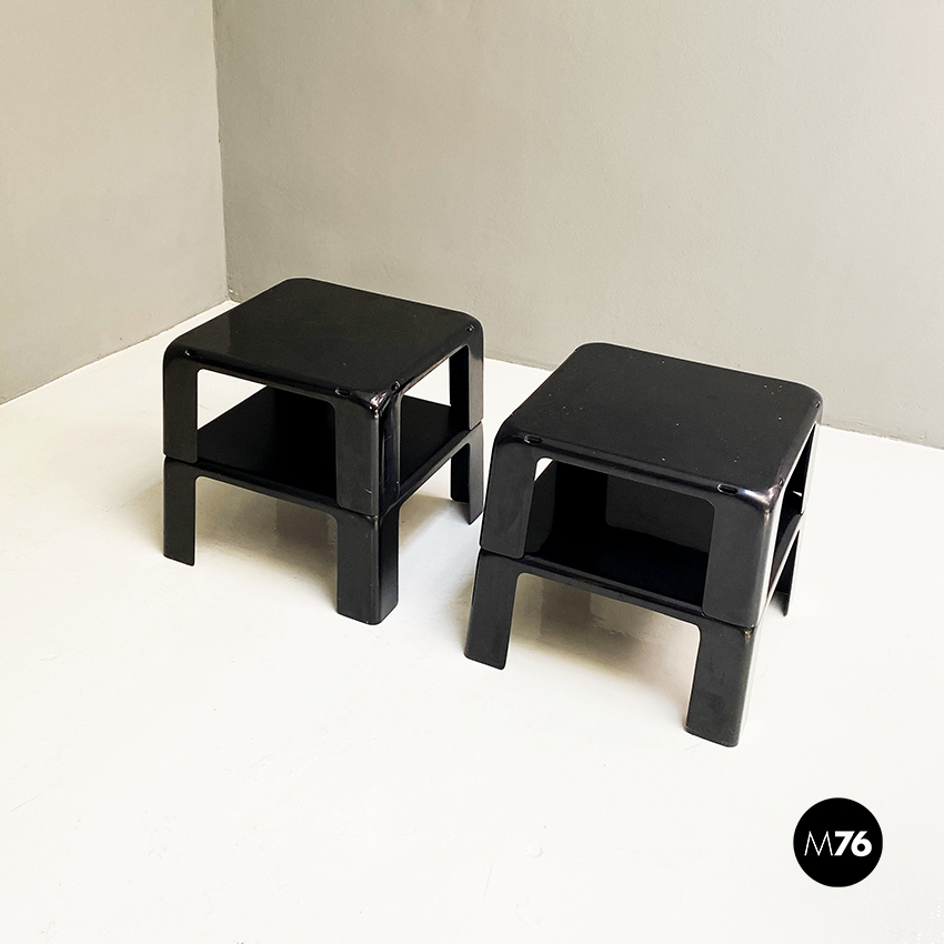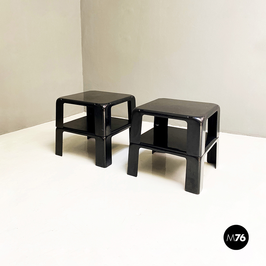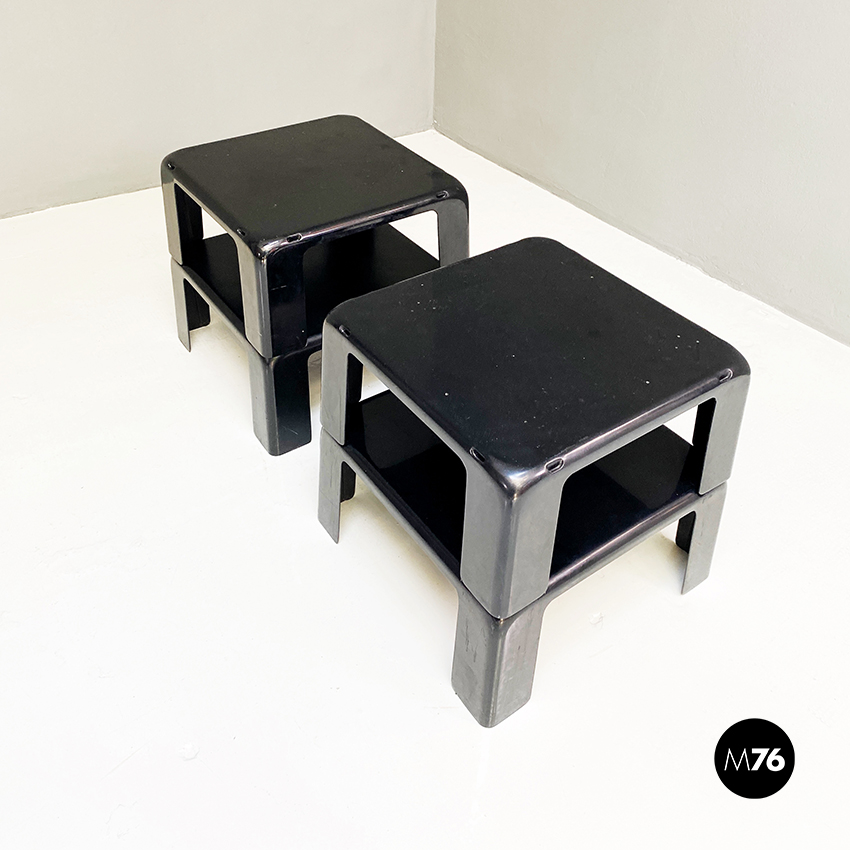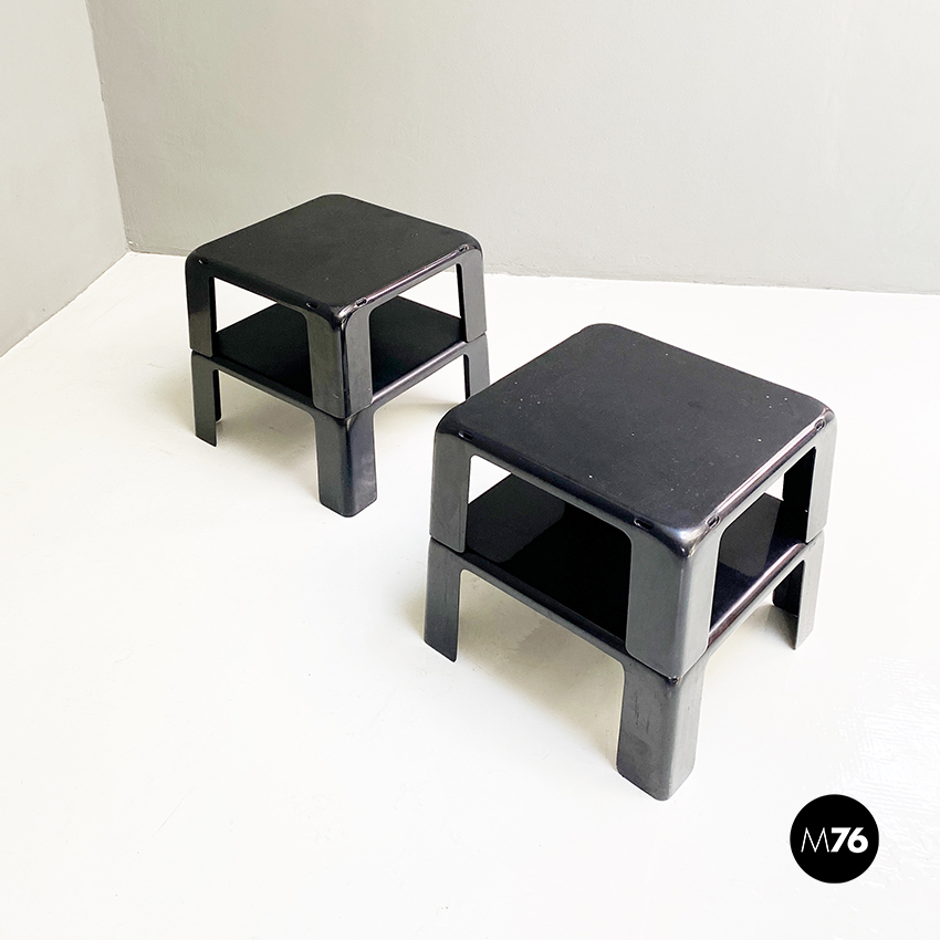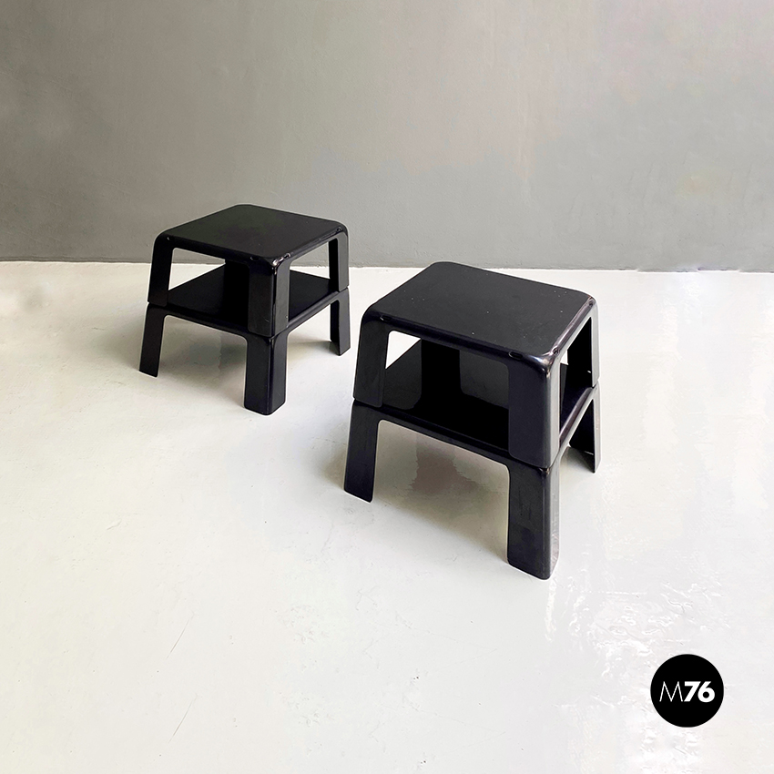 Coppia di tavoli da caffè Quattro Gatti di forma quadrata in plastica nera, impilabili attraverso dei fori presenti sul perimetro del piano.