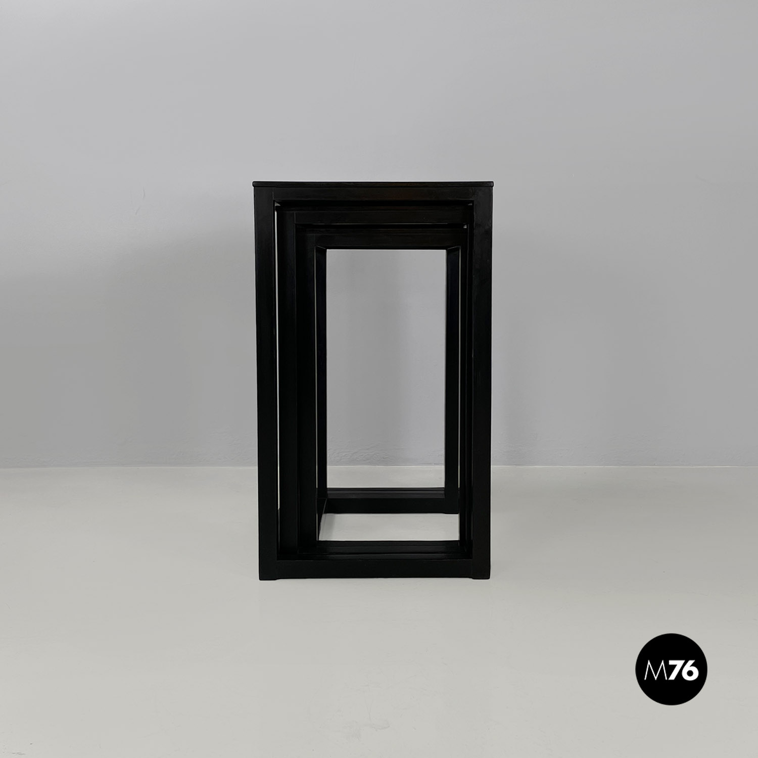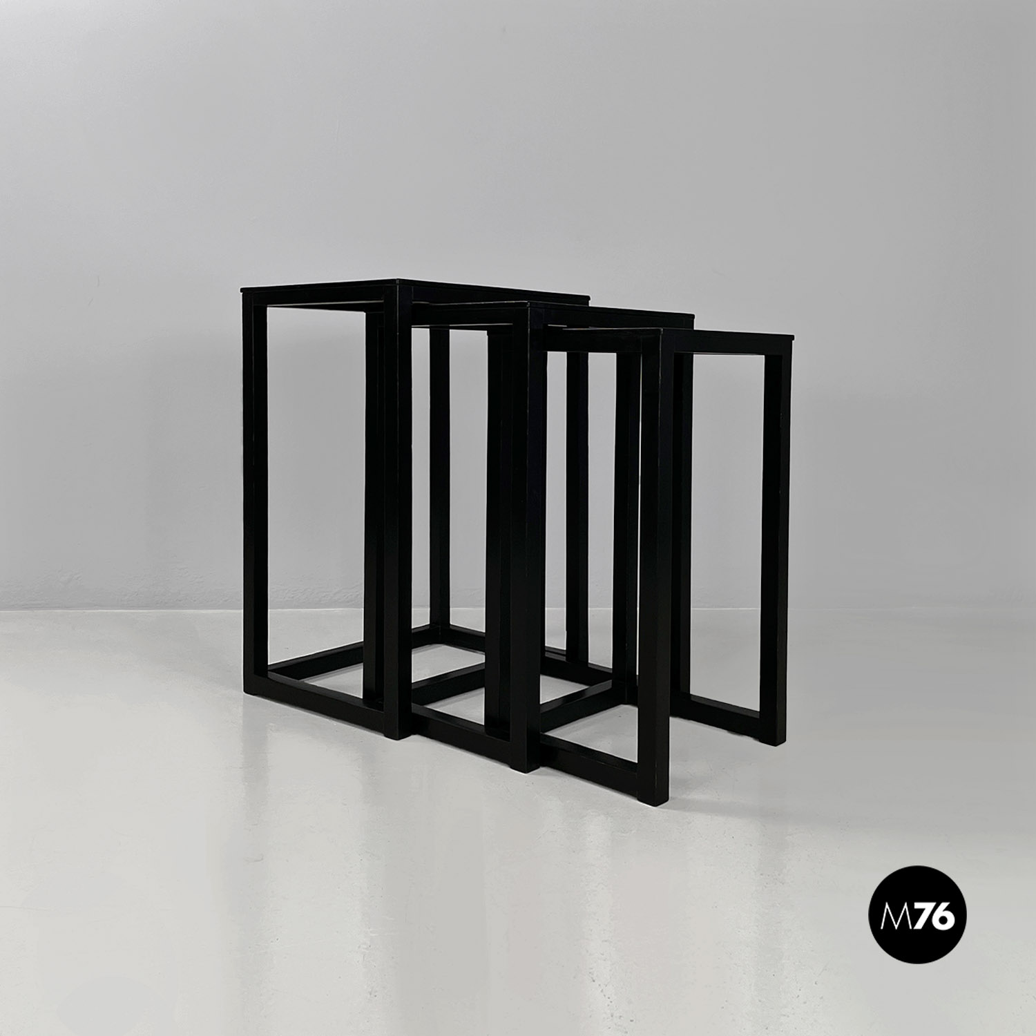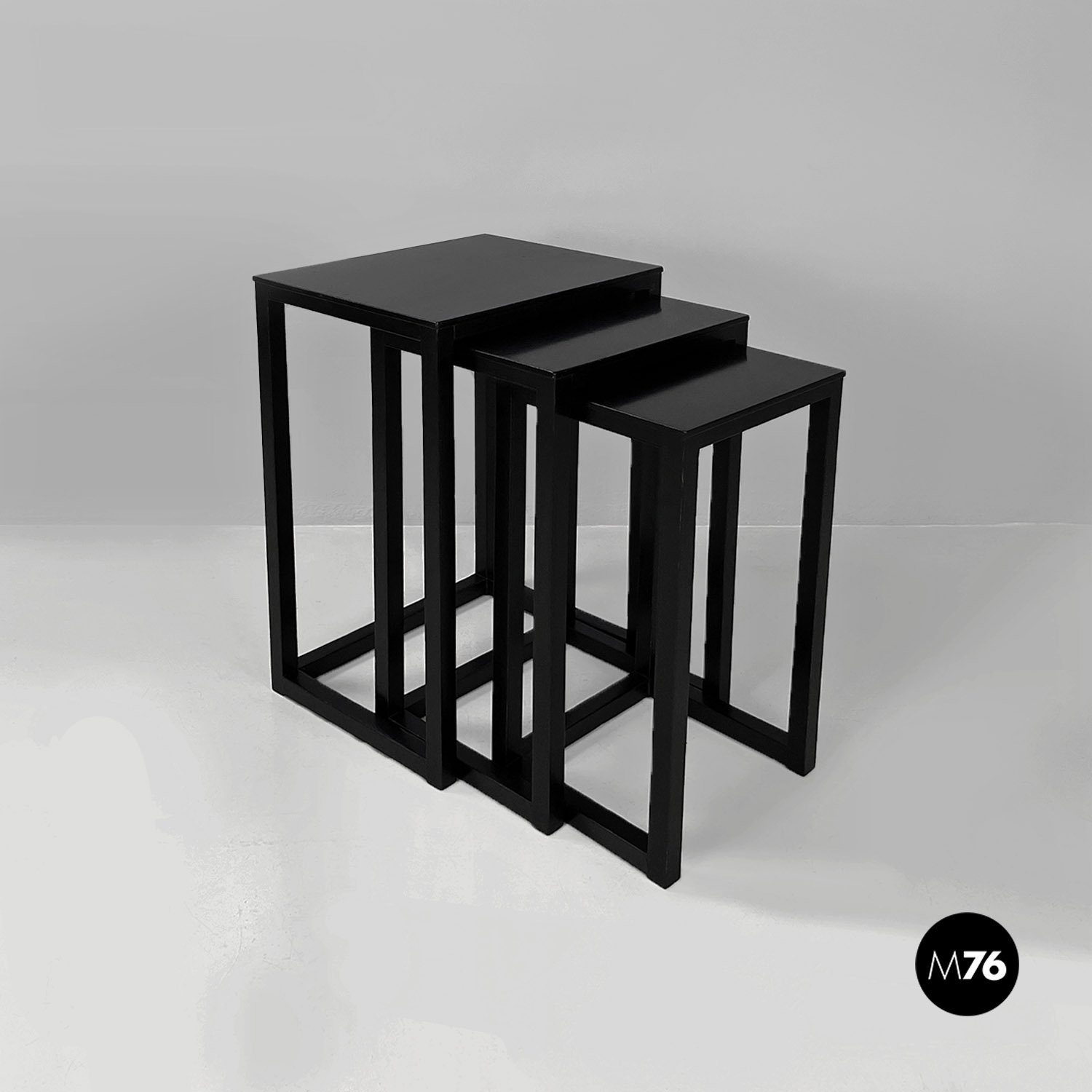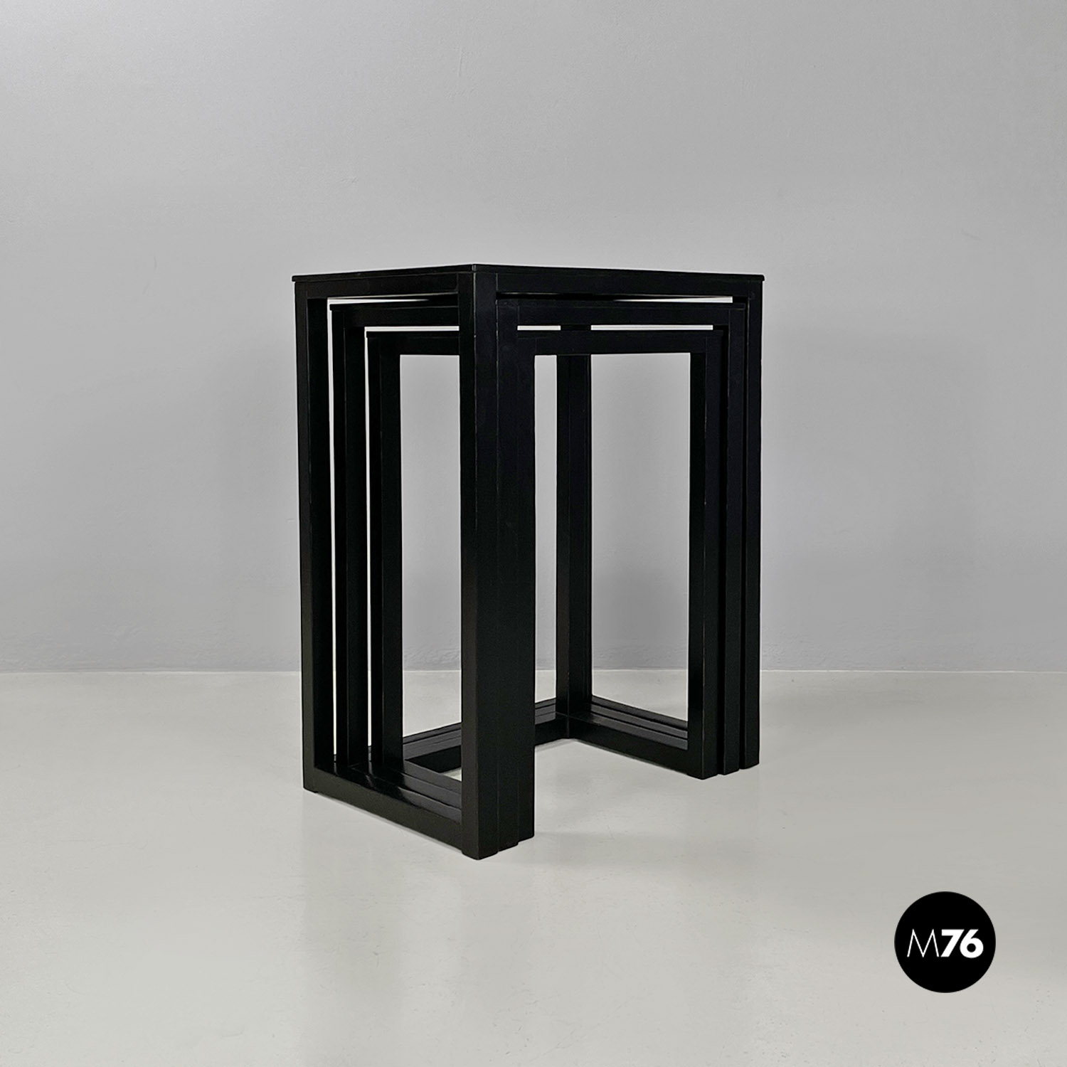 Set di tavoli da caffè modello Satztische, con struttura in legno massello di frassino tinto in color nero e piano con impiallacciatura di frassino nero, sovrapponibili, infatti si incastrano perfettamente uno all’interno dell’altro. Il piano dei tavolini è quasi un quadrato e la zampa è a sezione quadrata così da creare un gioco di geometrie quando i tavolini sono uno dentro l’altro.