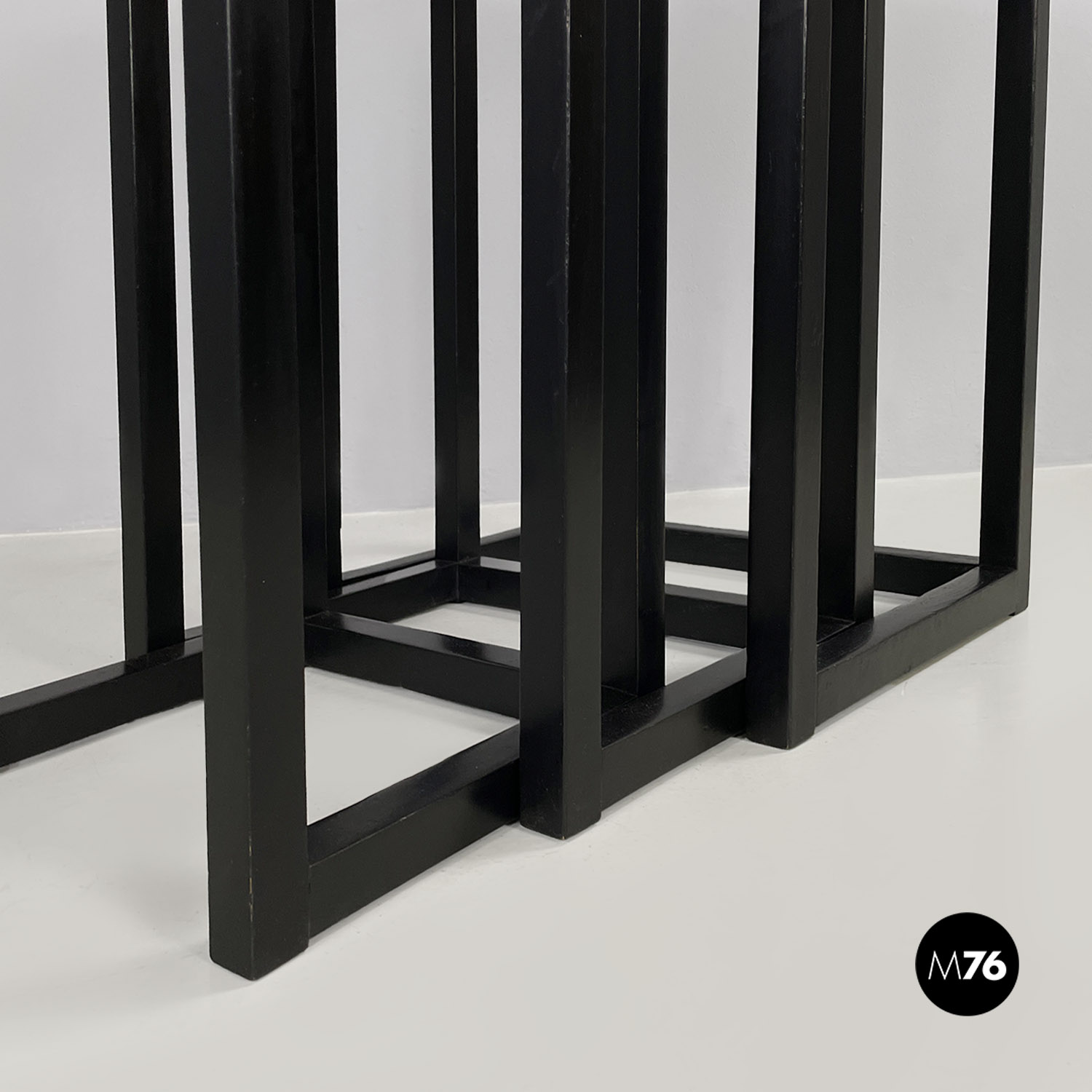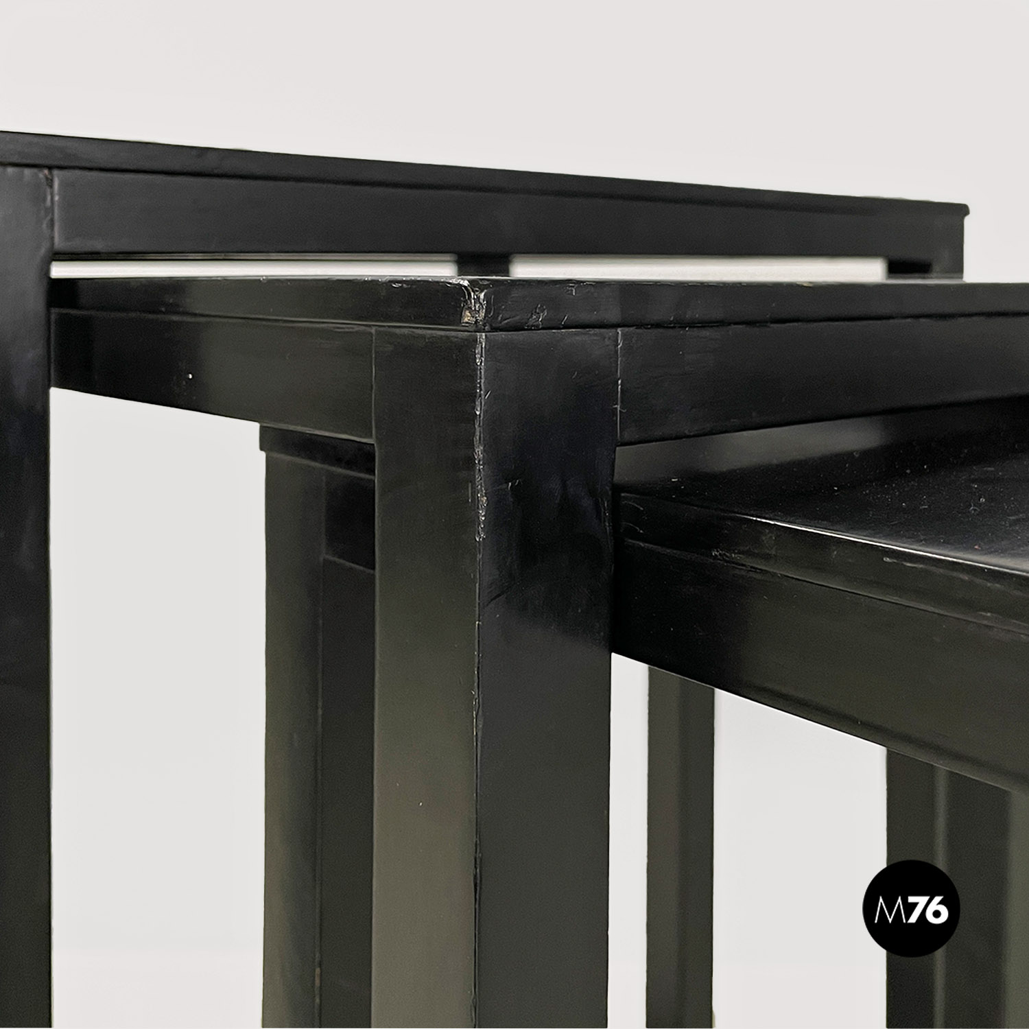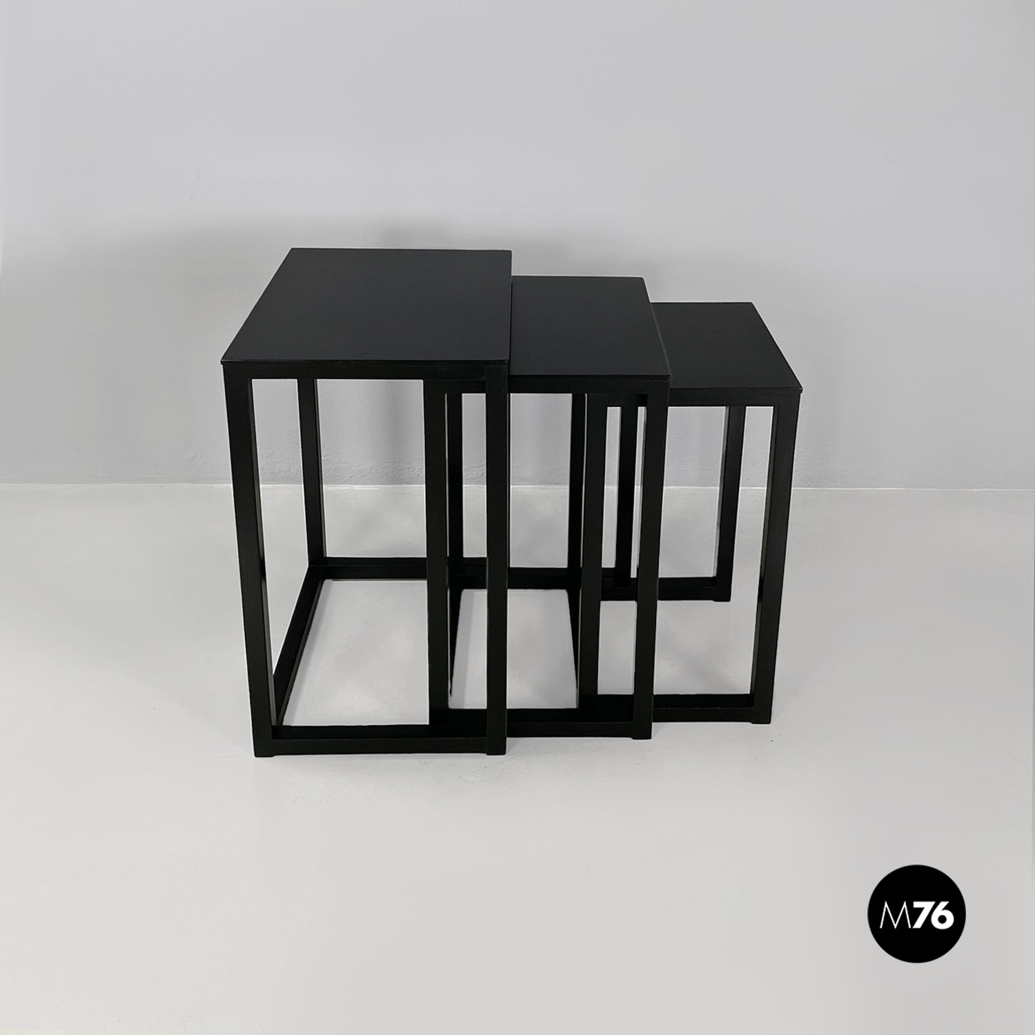 Set di tavoli da caffè modello Satztische, con struttura in legno massello di frassino tinto in color nero e piano con impiallacciatura di frassino nero, sovrapponibili, infatti si incastrano perfettamente uno all’interno dell’altro. Il piano dei tavolini è quasi un quadrato e la zampa è a sezione quadrata così da creare un gioco di geometrie quando i tavolini sono uno dentro l’altro.