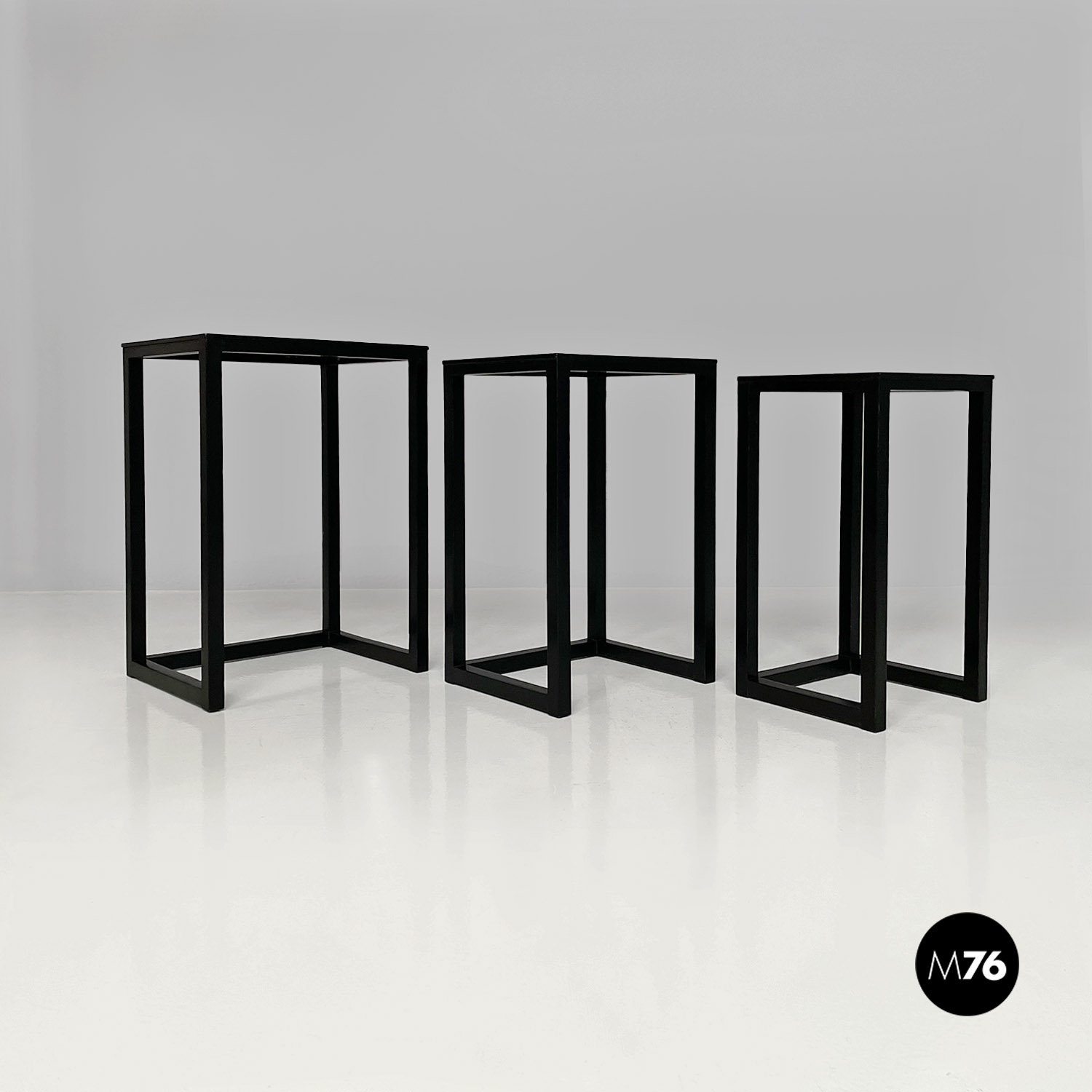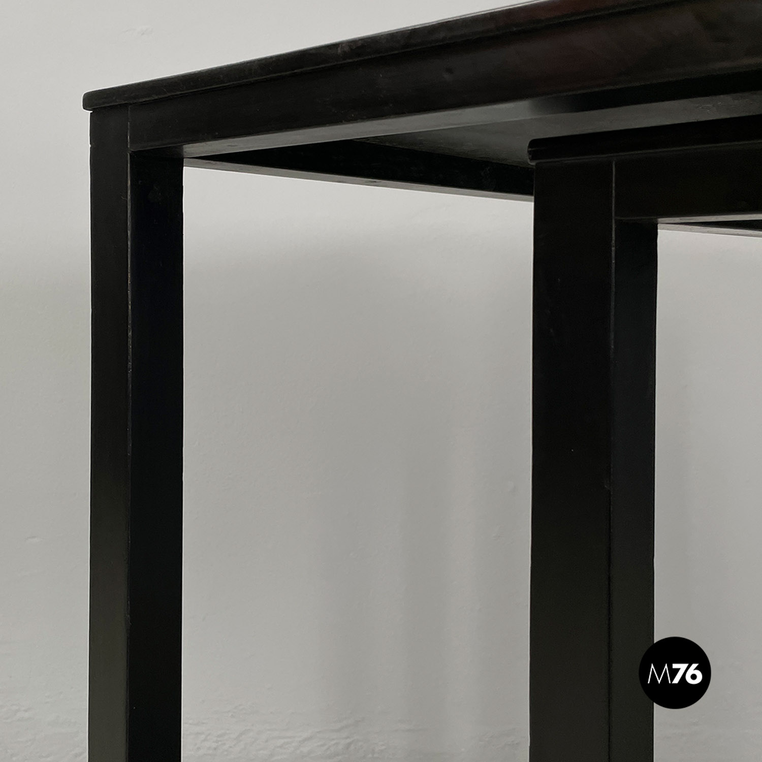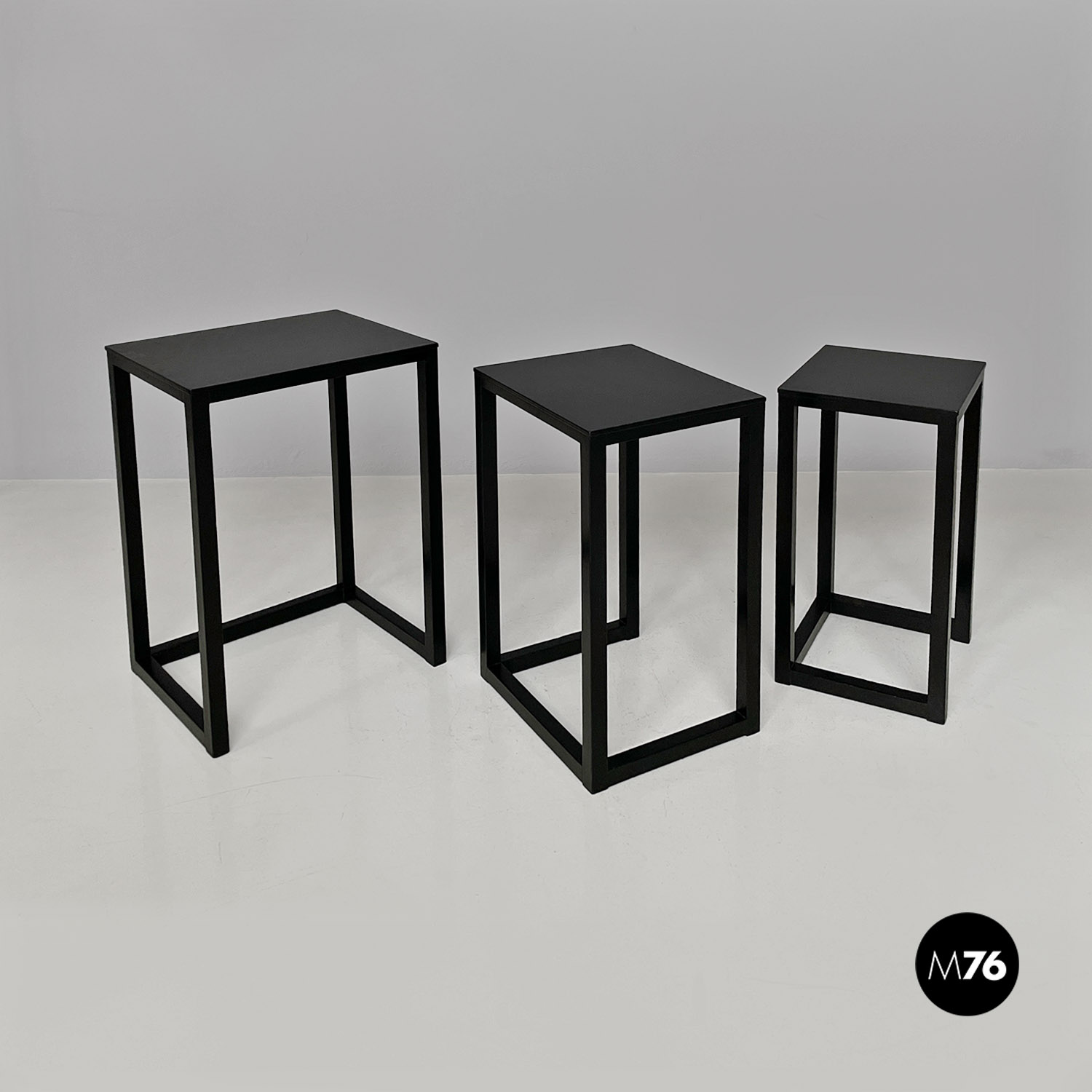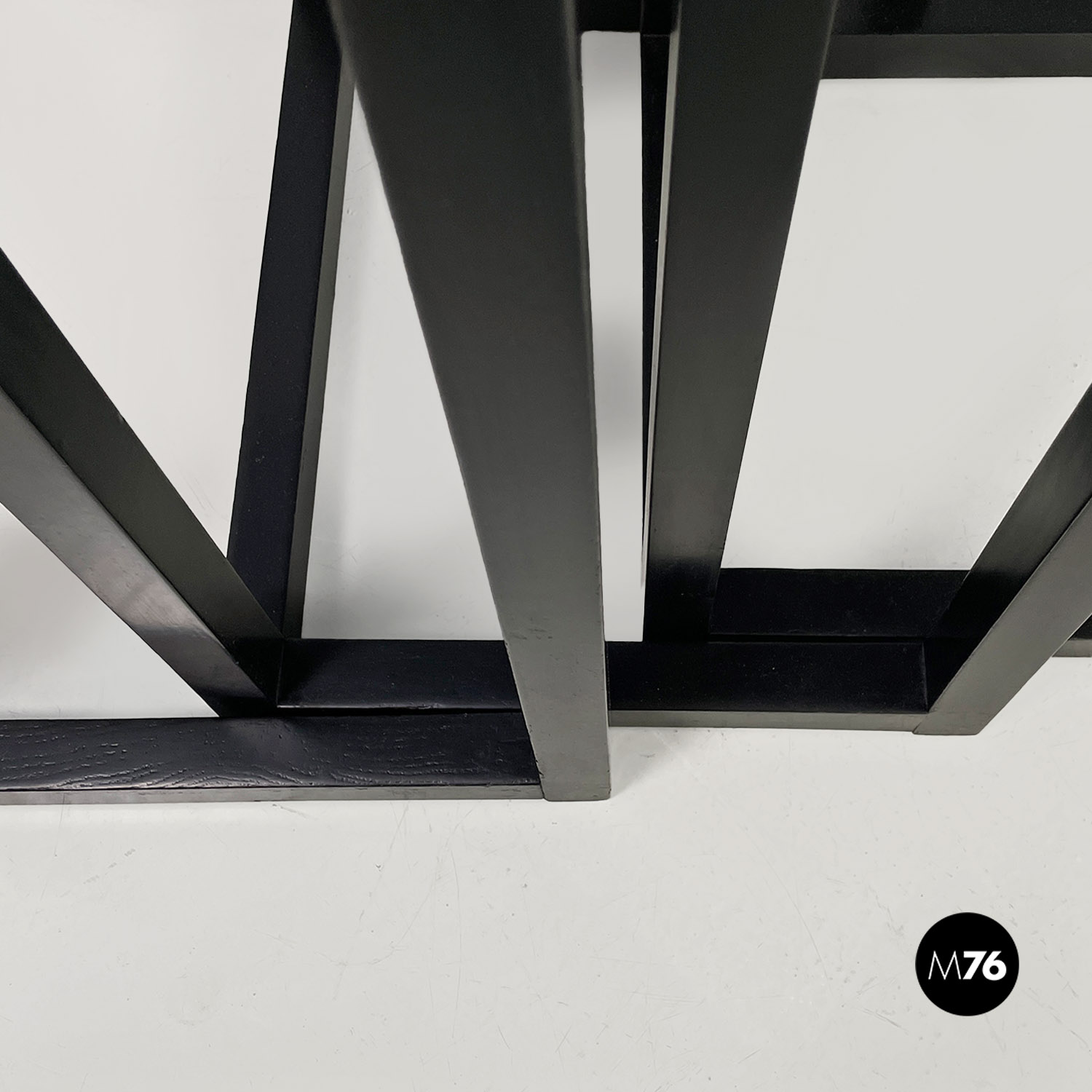 Set di tavoli da caffè modello Satztische, con struttura in legno massello di frassino tinto in color nero e piano con impiallacciatura di frassino nero, sovrapponibili, infatti si incastrano perfettamente uno all’interno dell’altro. Il piano dei tavolini è quasi un quadrato e la zampa è a sezione quadrata così da creare un gioco di geometrie quando i tavolini sono uno dentro l’altro.