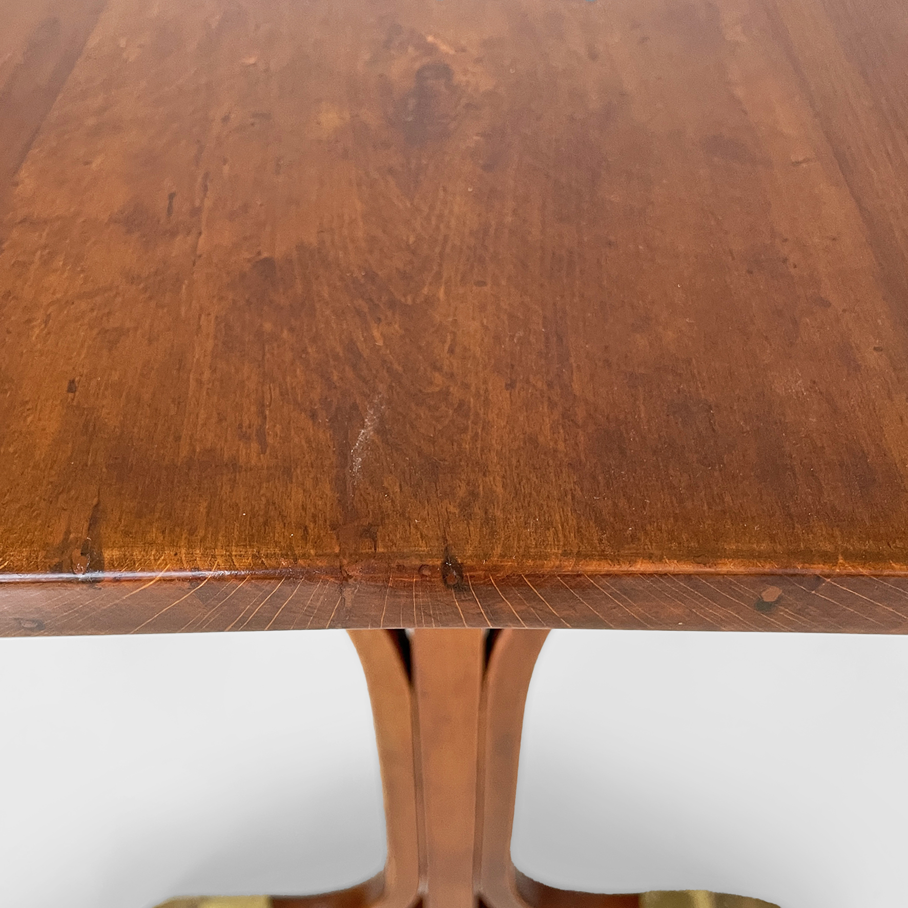 Coppia di tavoli da pranzo o da bistrot con piano rettangolare in legno. Le zampe in legno presentano dettagli in ottone sui piedini. Tondino di ottone alla base. Utilizzabile come scrivania o tavolo da bar.