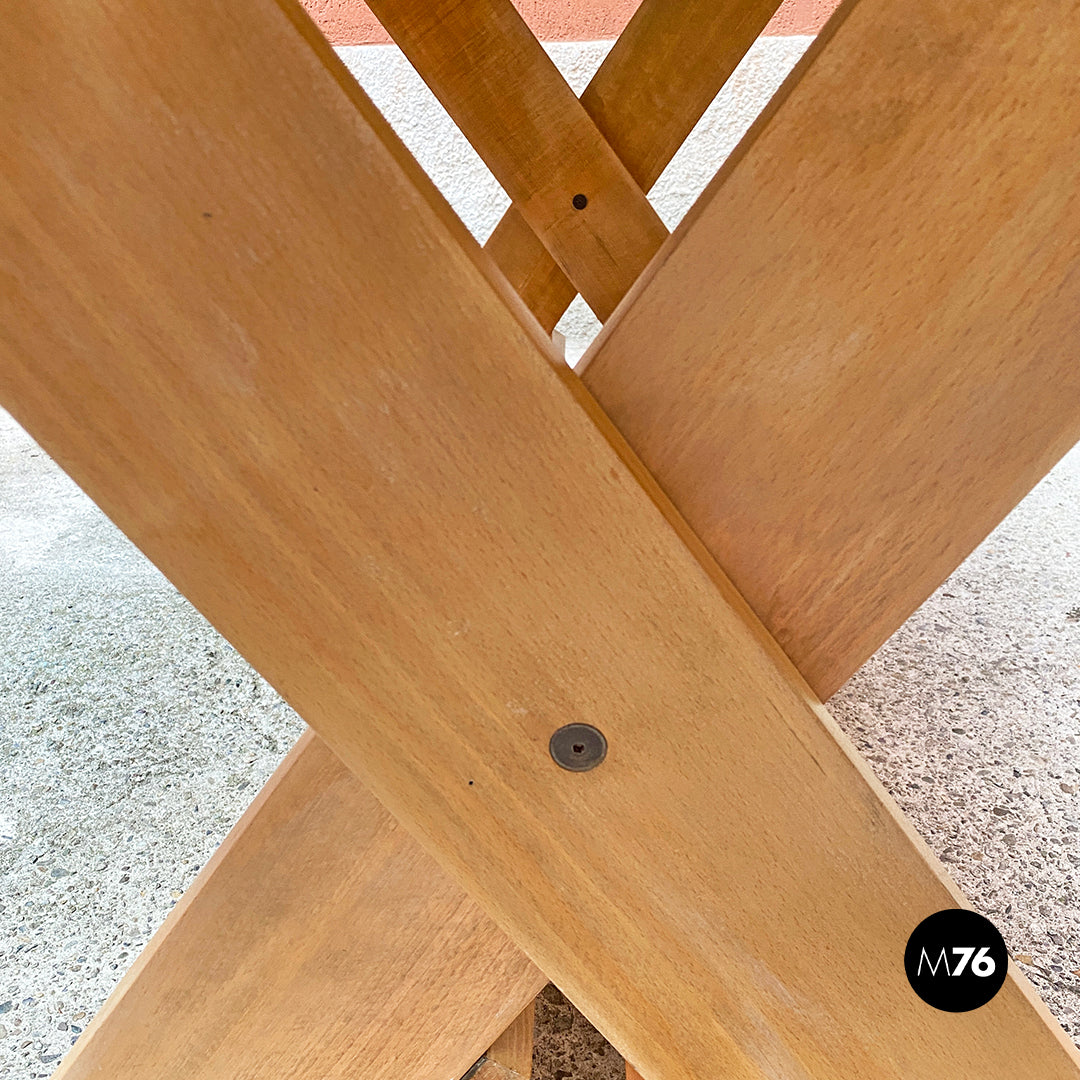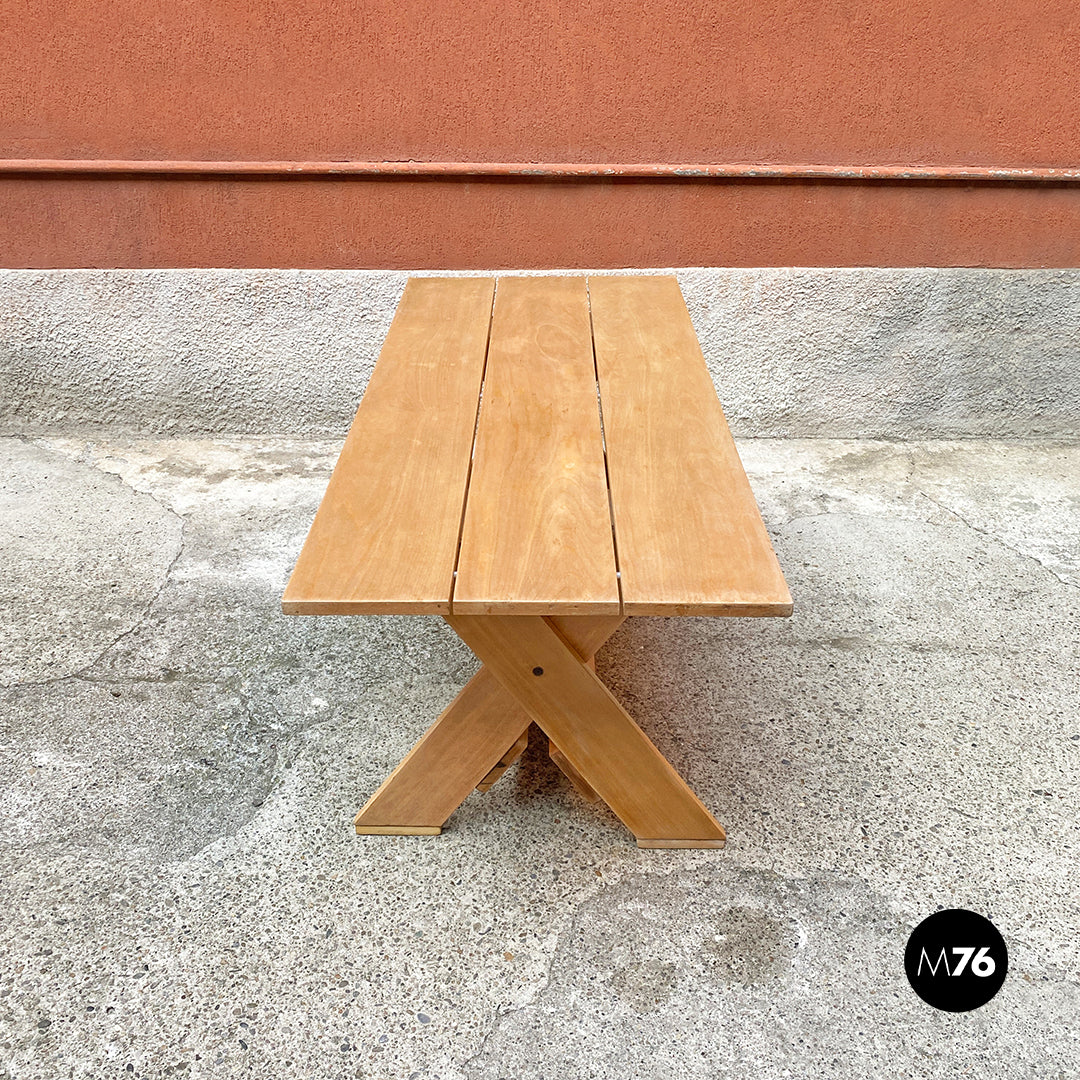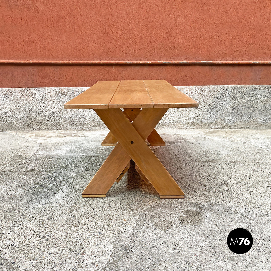 Tavolo da pranzo della serie Crate, con piano formato da tavole parallele in massello e con zampe incrociate a formare una X.