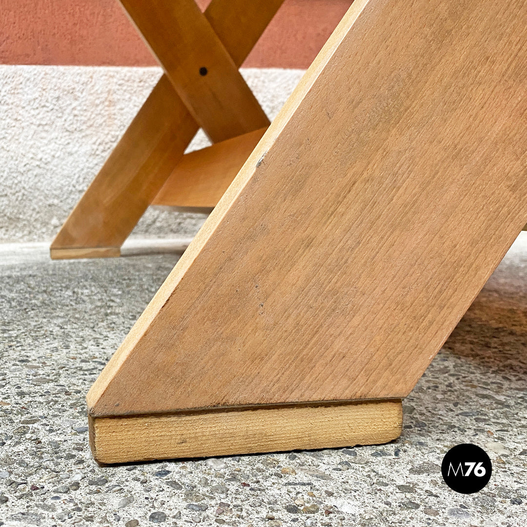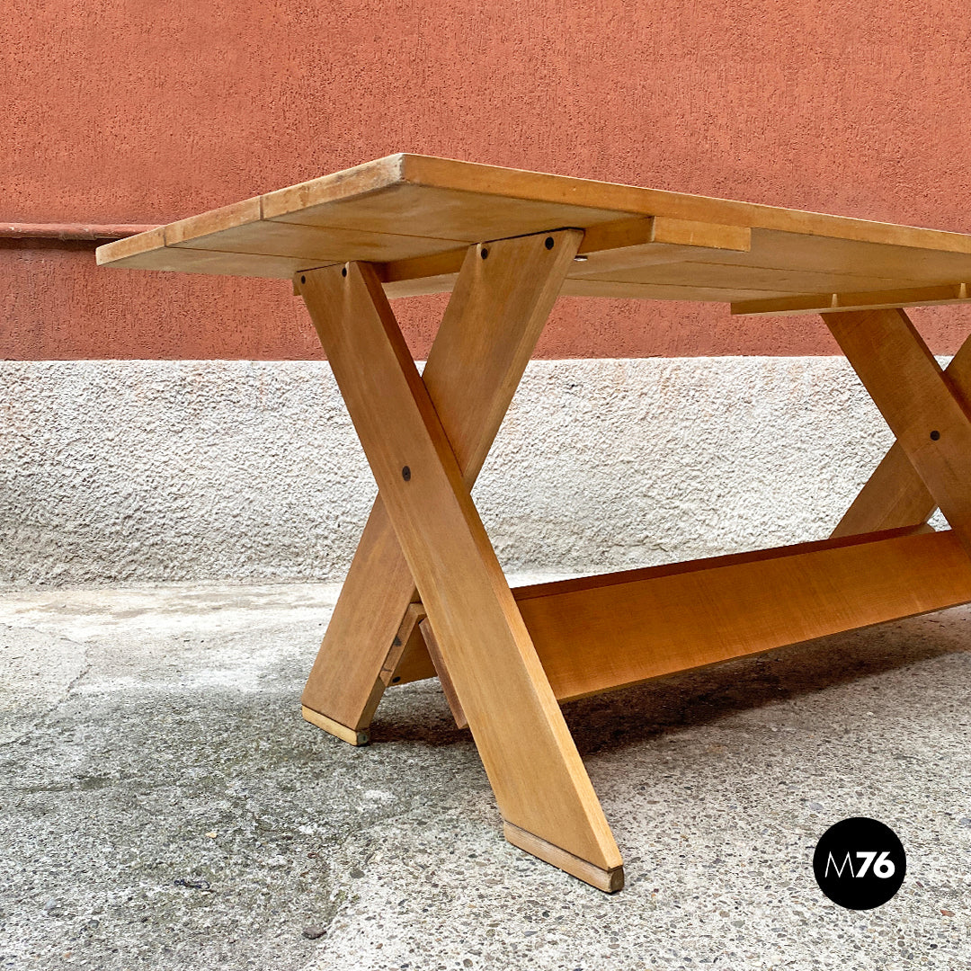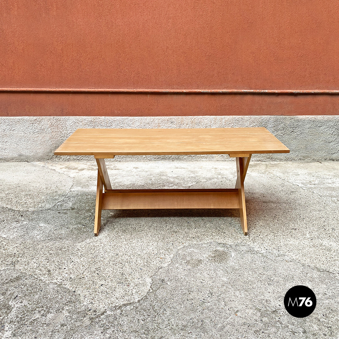 Tavolo da pranzo della serie Crate, con piano formato da tavole parallele in massello e con zampe incrociate a formare una X.