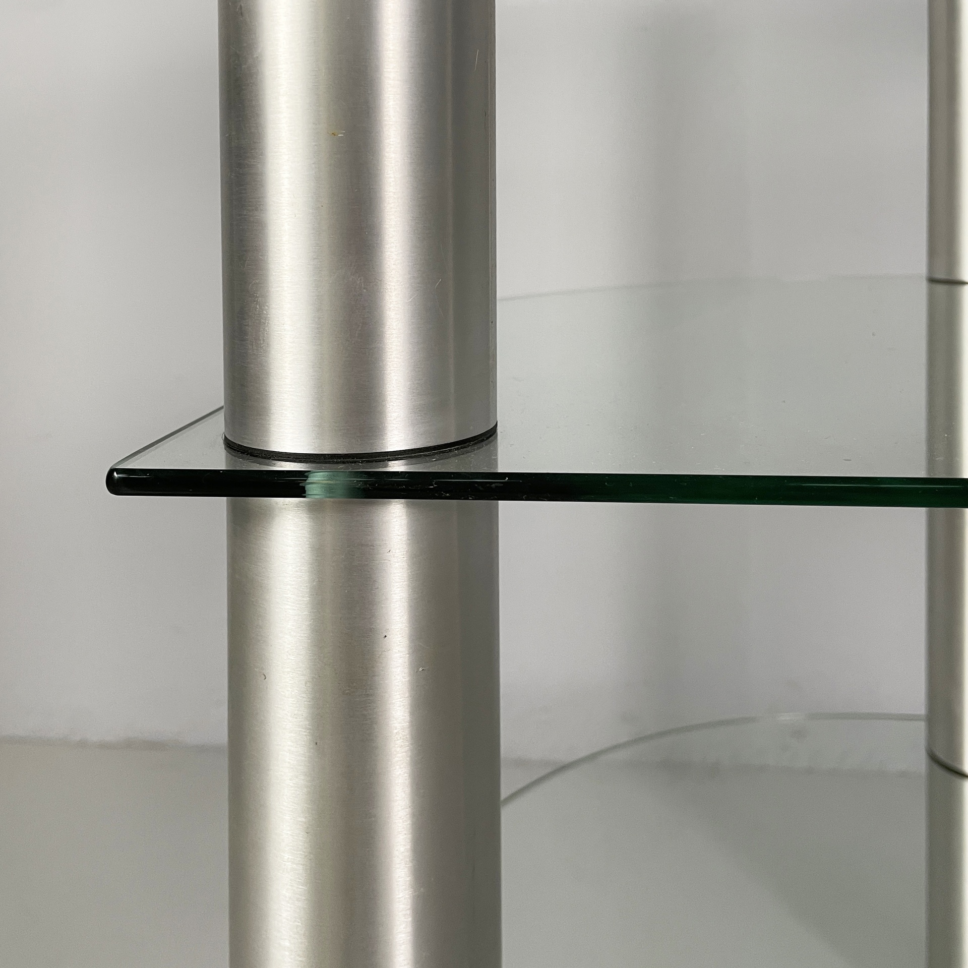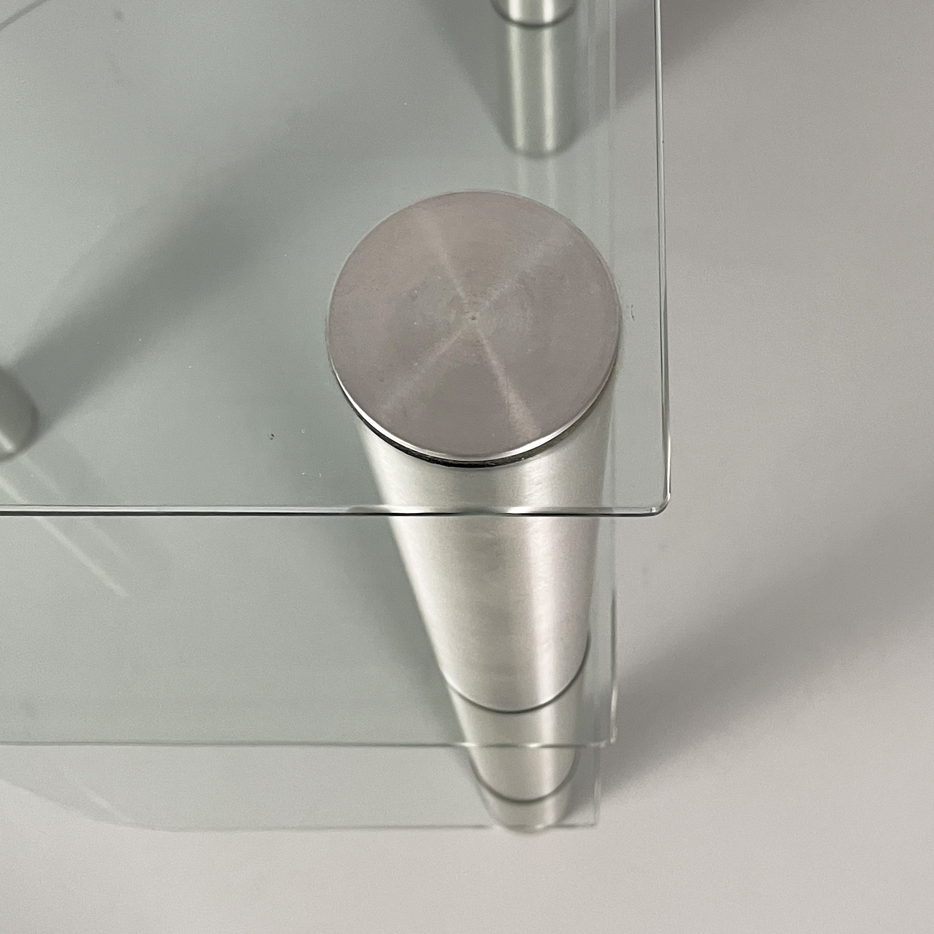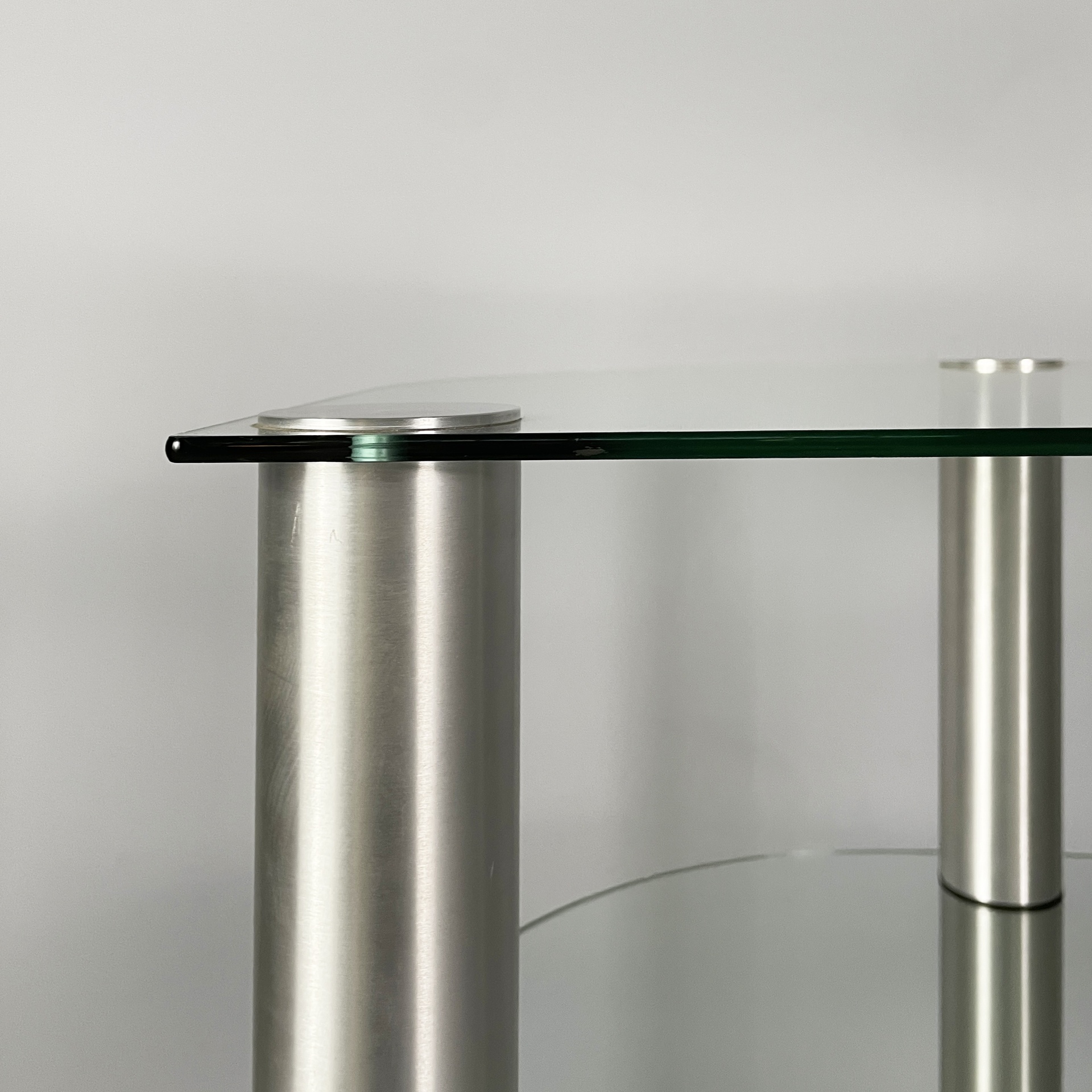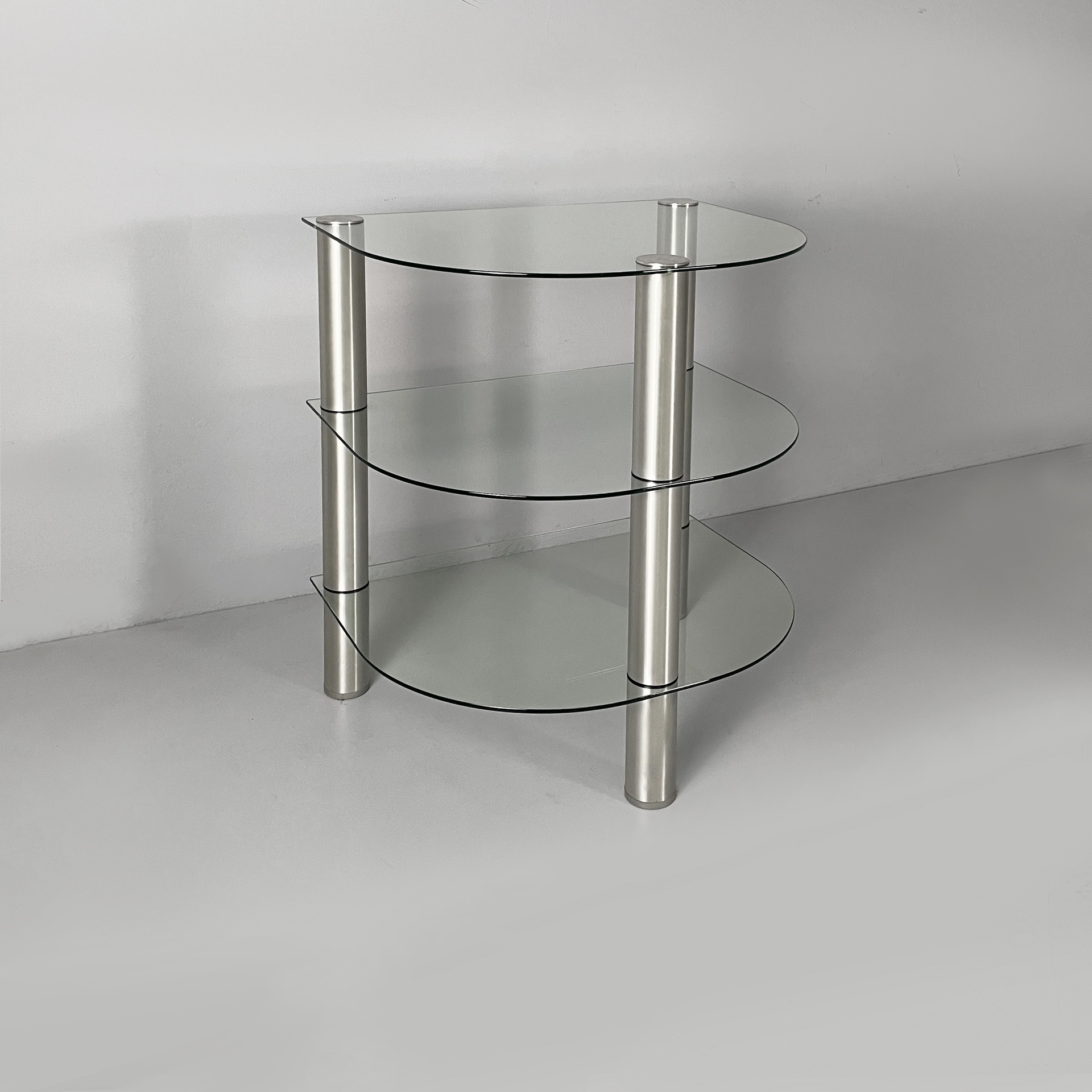 Tavolo da caffè a tre piani a semicerchio in vetro. I piani sono divisi da tre strutture cilindriche in acciaio. Zampe cilindriche in acciaio. Utilizzabile come tavolo per giradischi o per impianto stereo.