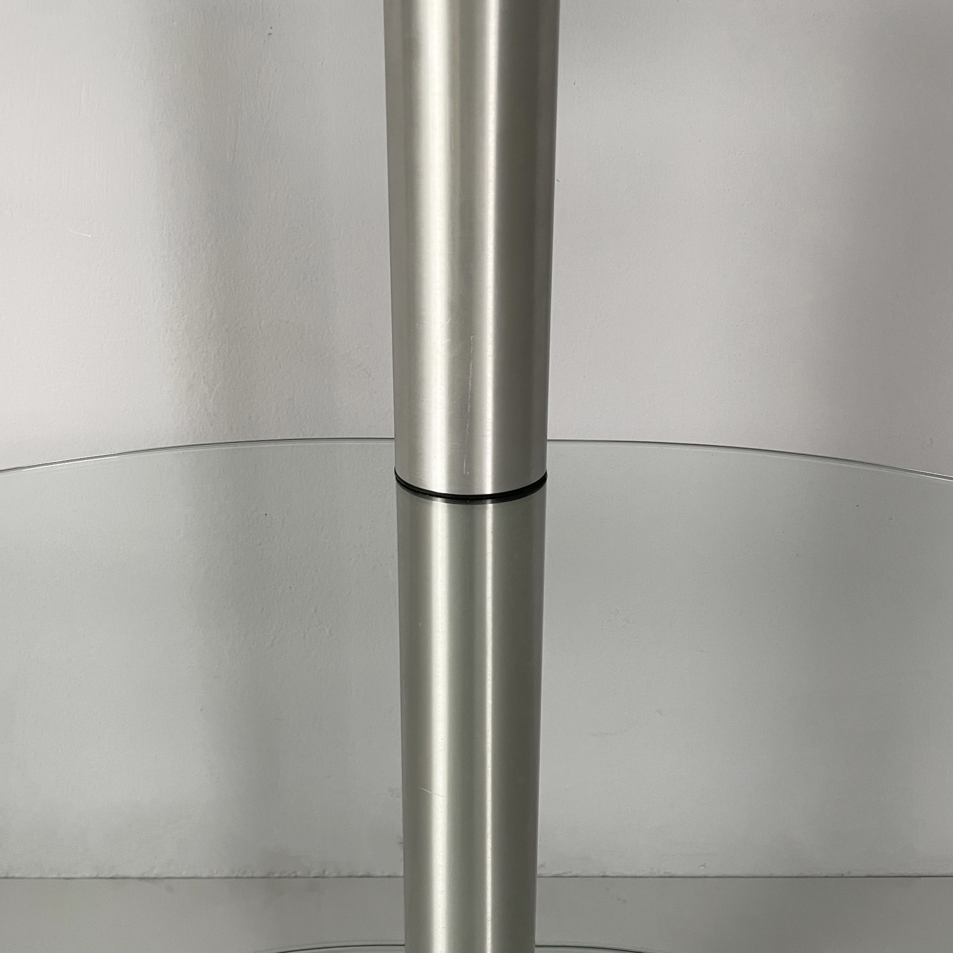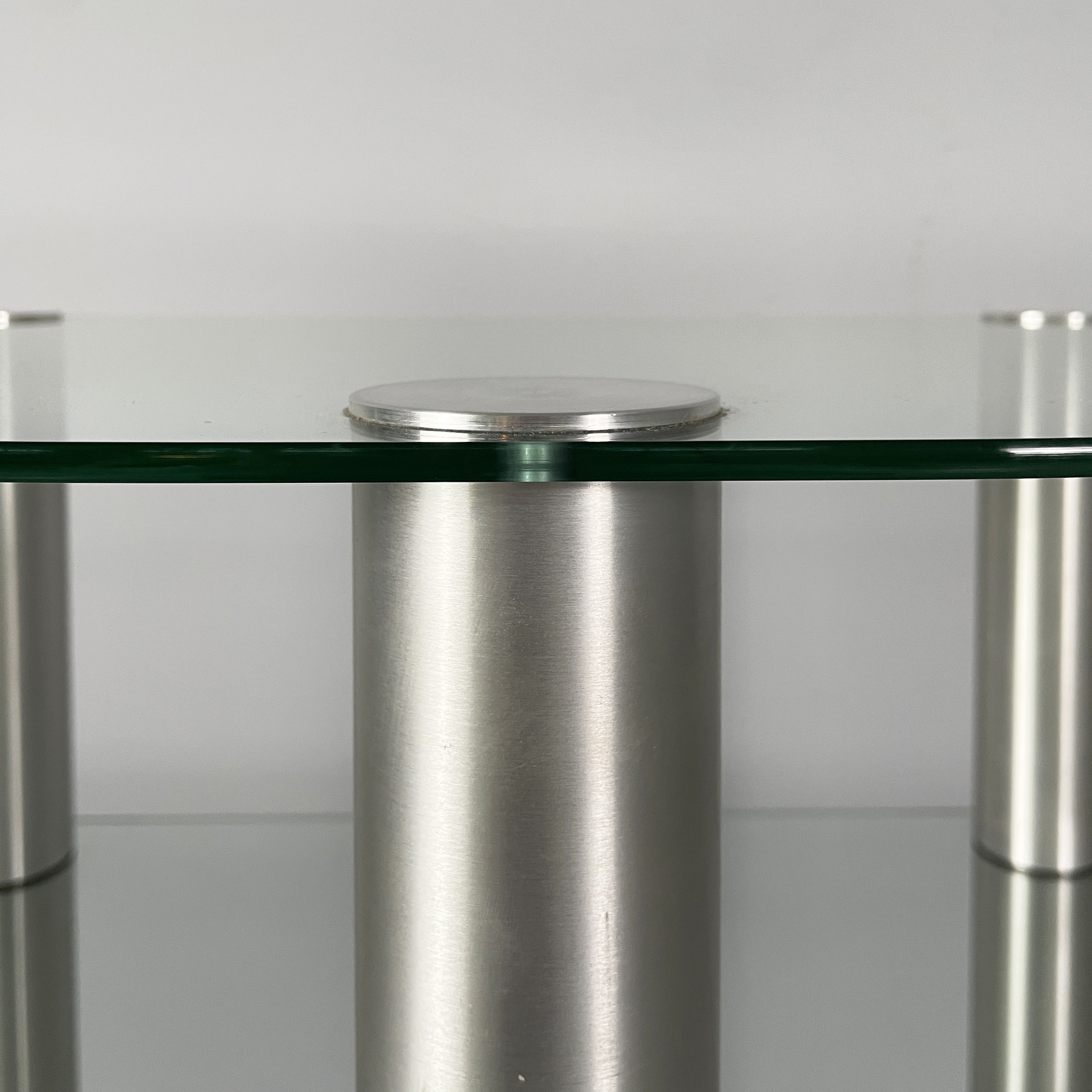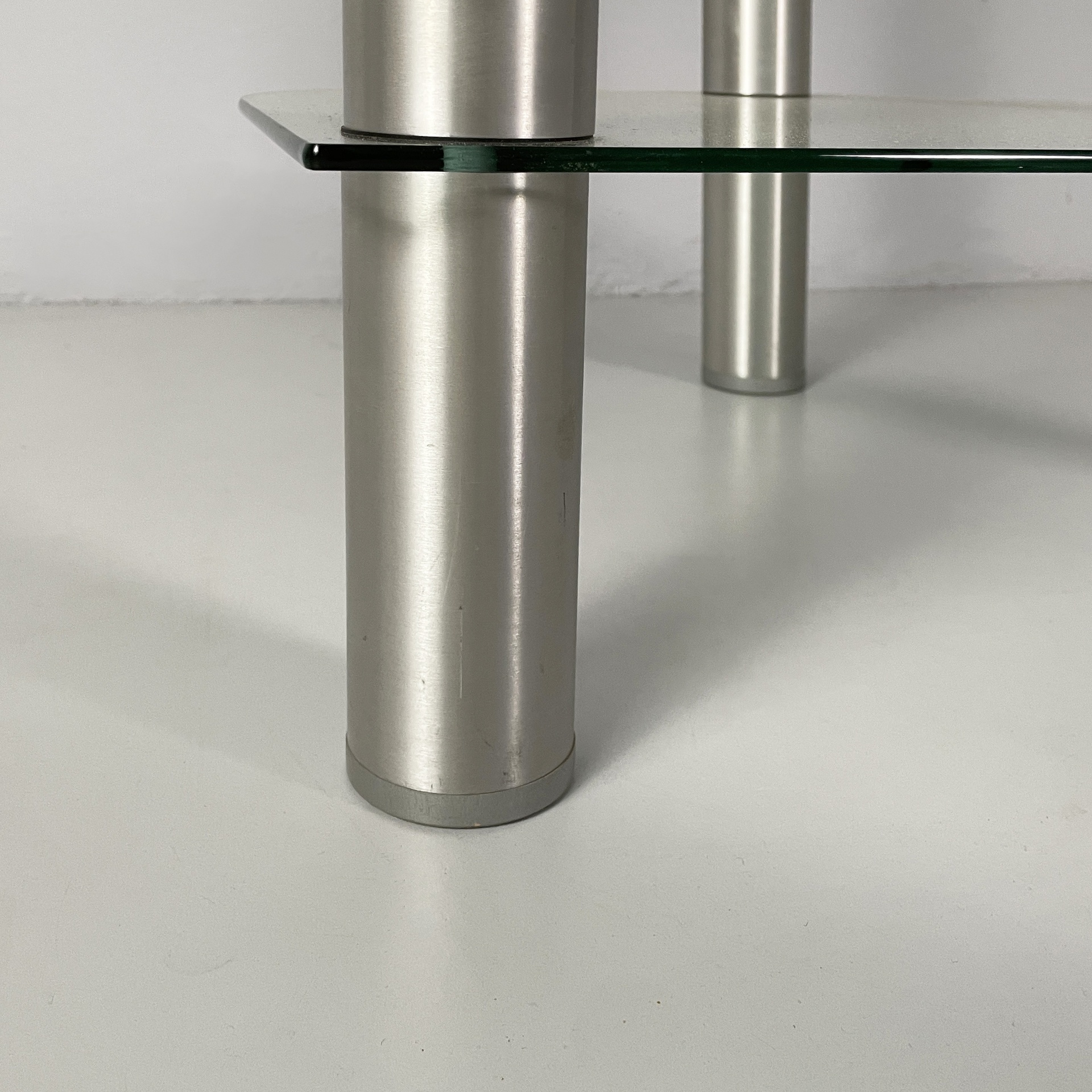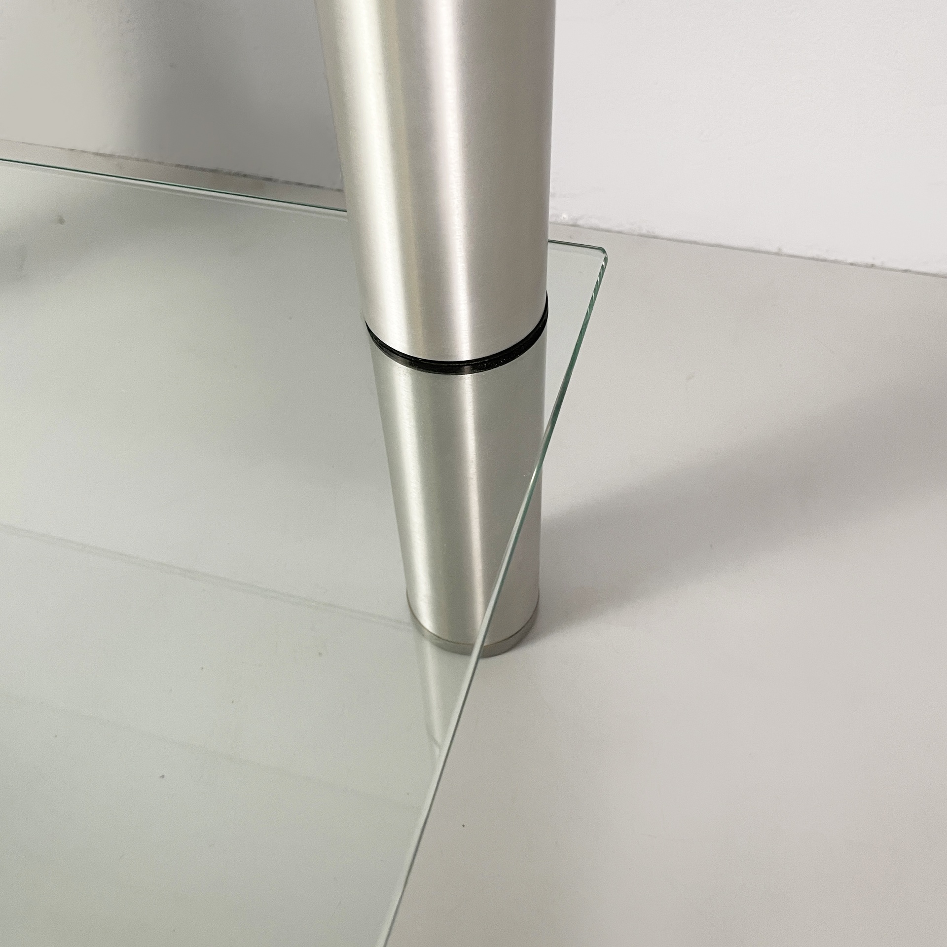 Tavolo da caffè a tre piani a semicerchio in vetro. I piani sono divisi da tre strutture cilindriche in acciaio. Zampe cilindriche in acciaio. Utilizzabile come tavolo per giradischi o per impianto stereo.