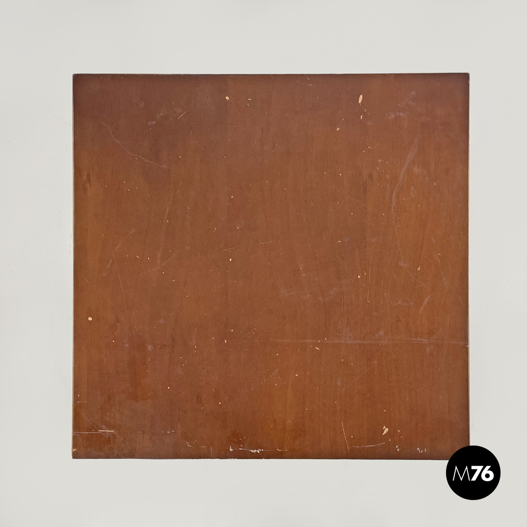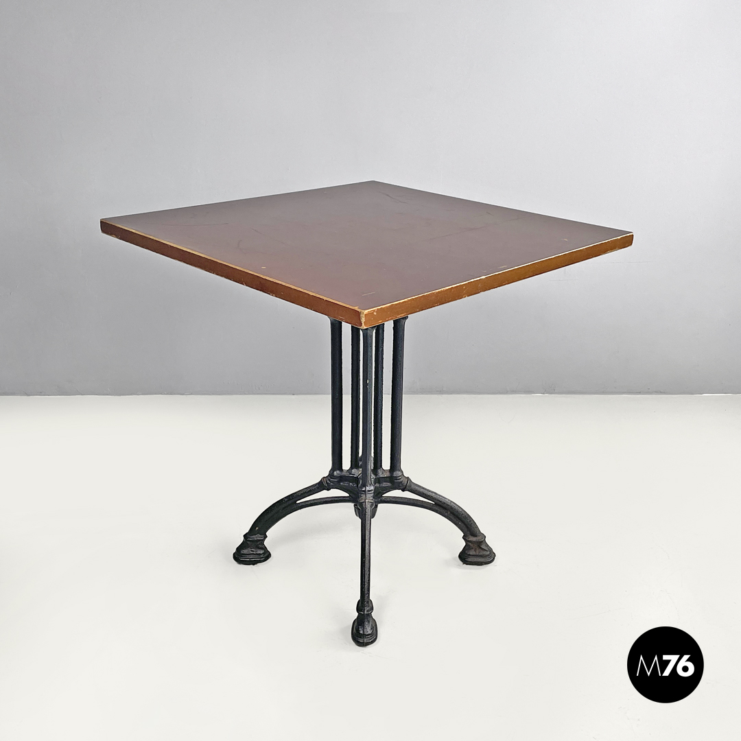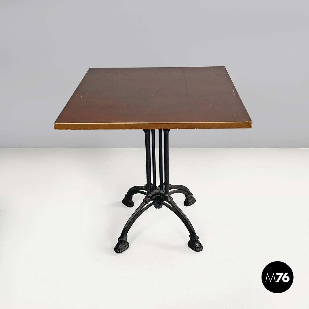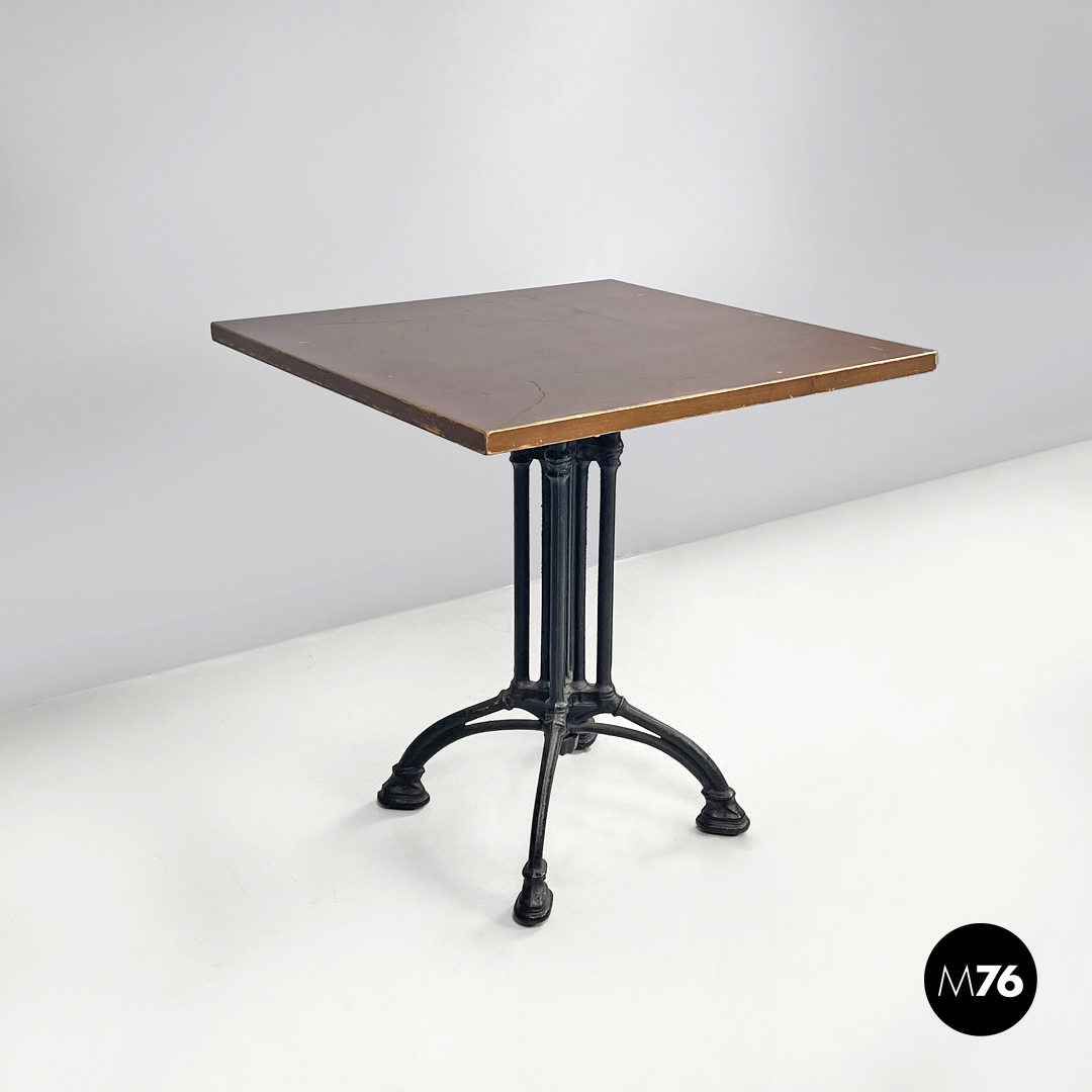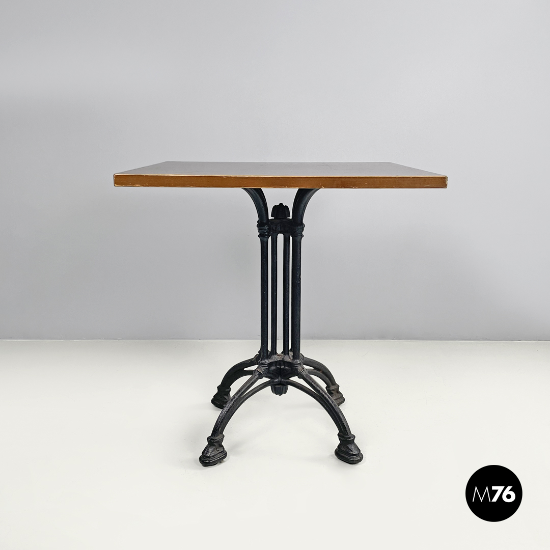 Tavolo da bar, da caffè o da pranzo con piano in legno quadrato. La struttura è in ghisa verniciata nera ed è composta da quattro tubolari interni e quattro esterni che partono curvando da sotto il piano, si uniscono nella parte centrale alta e bassa creando un elemento decorativo, per poi aprirsi all’appoggio a terra in quattro razze stondate con piedino lavorato. Utilizzabile anche come piccolo tavolo da pranzo.