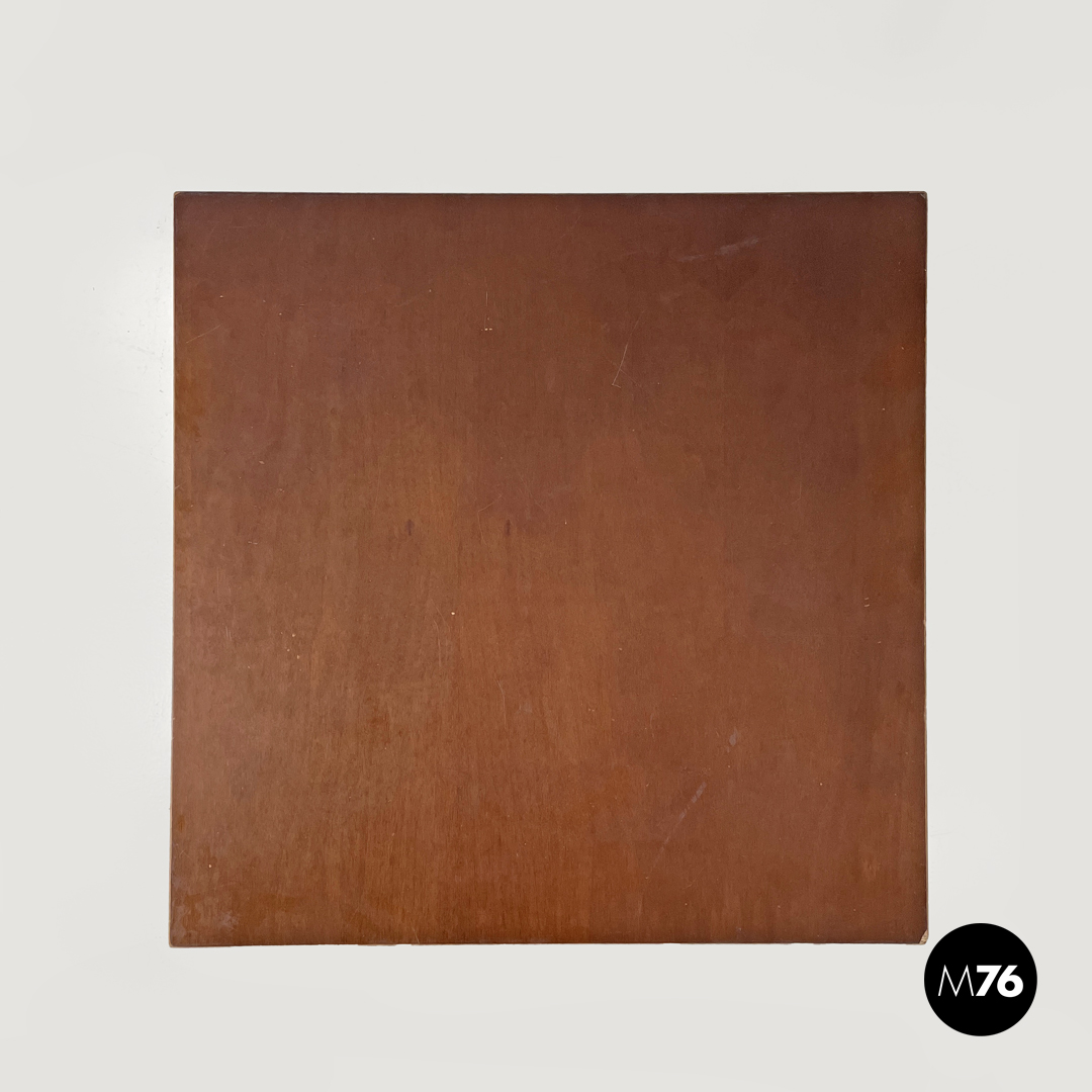 Tavolo da bar, da caffè o da bistrot con piano in legno quadrato. La struttura è in ghisa verniciata nera ed è composta da quattro tubolari interni e quattro esterni che partono curvando da sotto il piano, si uniscono nella parte centrale alta e bassa creando un elemento decorativo, per poi aprirsi all’appoggio a terra in quattro razze stondate con piedino lavorato. Utilizzabile anche come piccolo tavolo da pranzo.