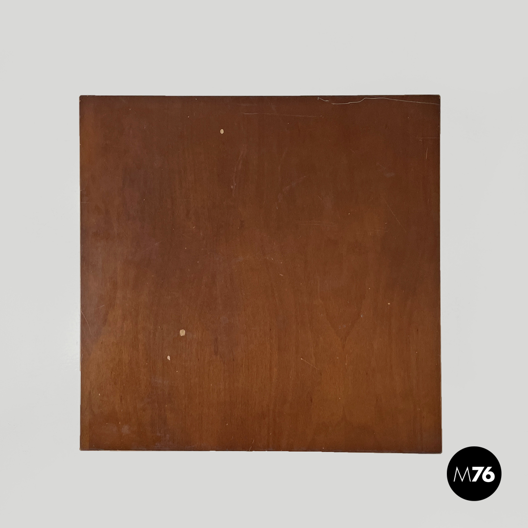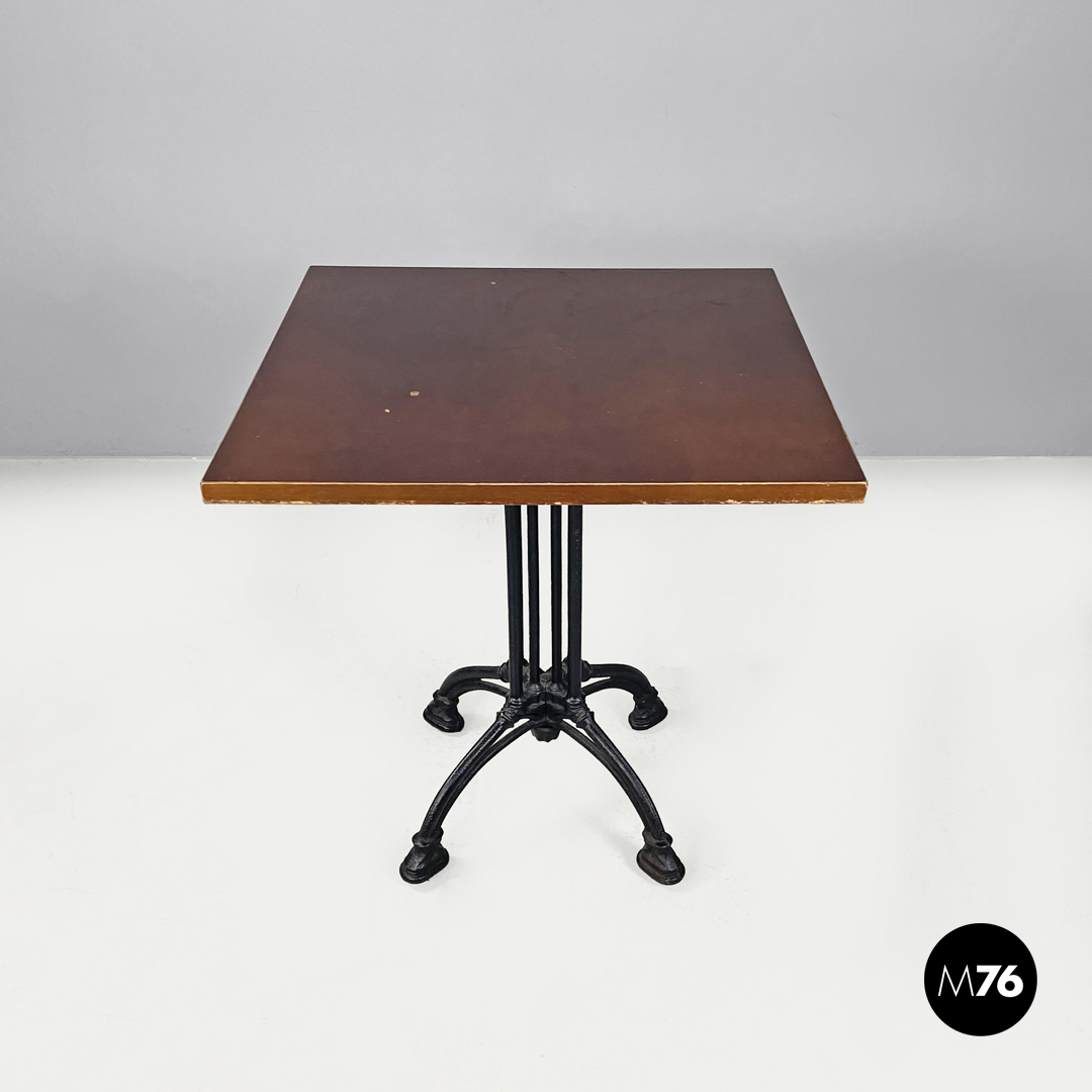 Tavolo da bar, da caffè o da pranzo con piano in legno quadrato. La struttura è in ghisa verniciata nera ed è composta da quattro tubolari interni e quattro esterni che partono curvando da sotto il piano, si uniscono nella parte centrale alta e bassa creando un elemento decorativo, per poi aprirsi all’appoggio a terra in quattro razze stondate con piedino lavorato. Utilizzabile anche come piccolo tavolo da pranzo.