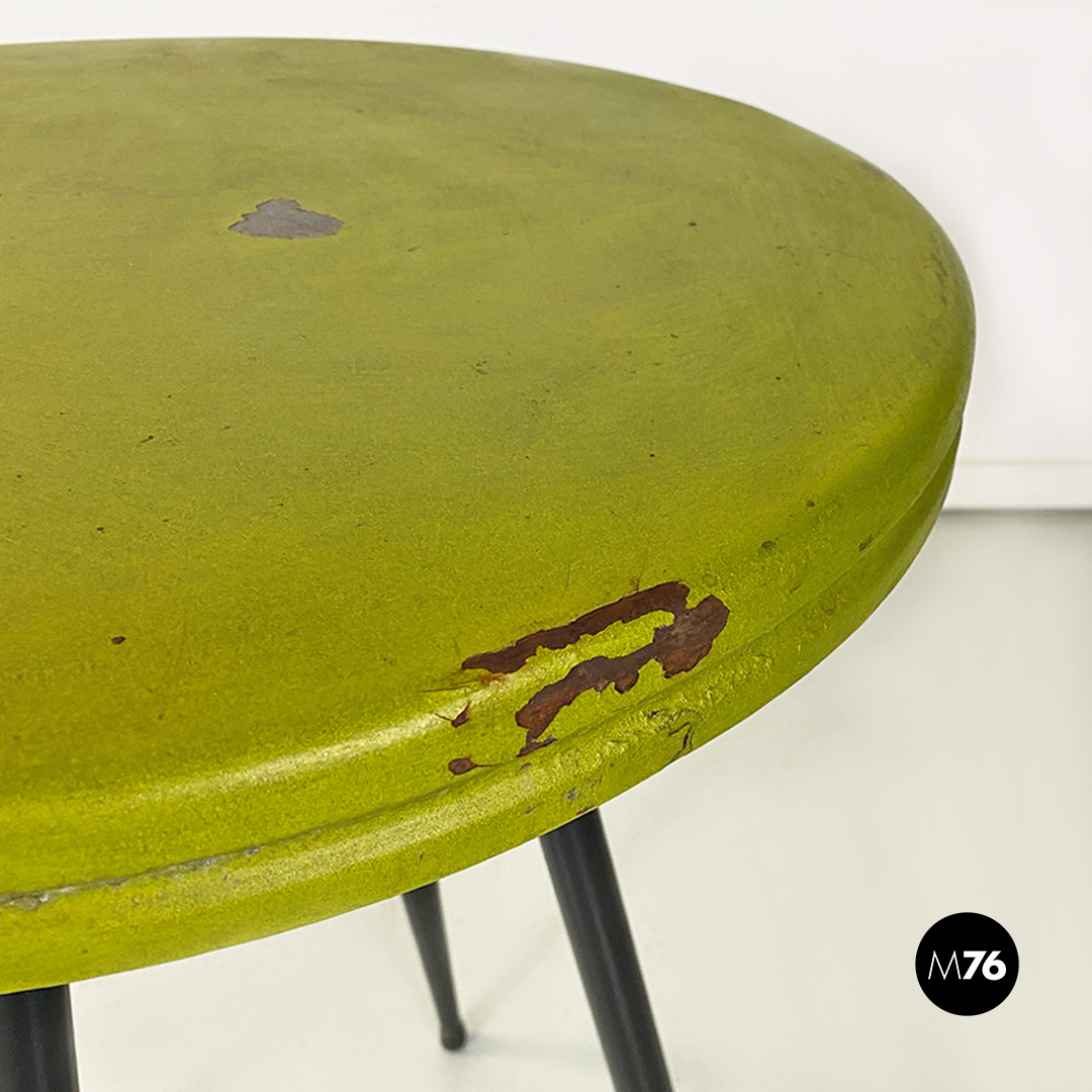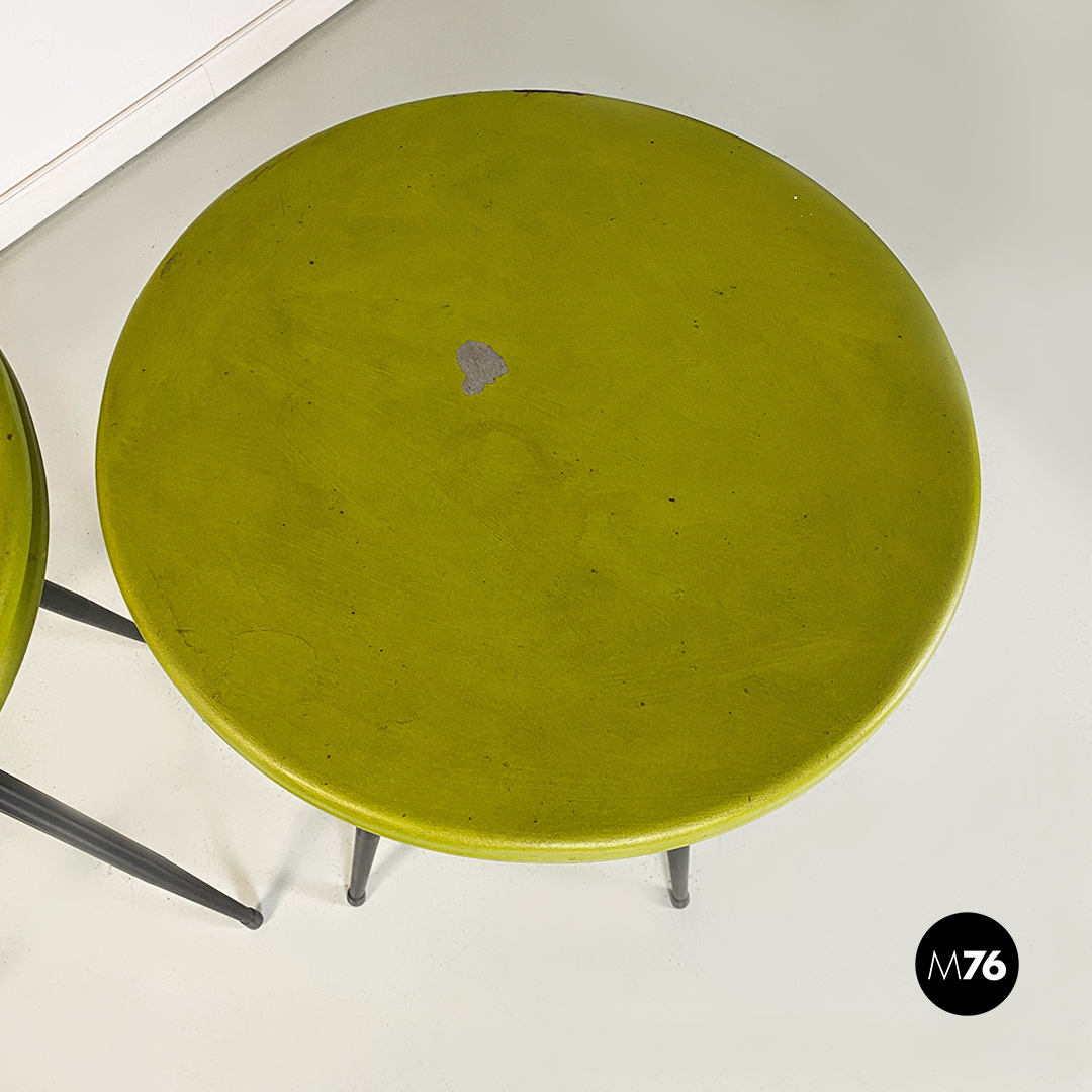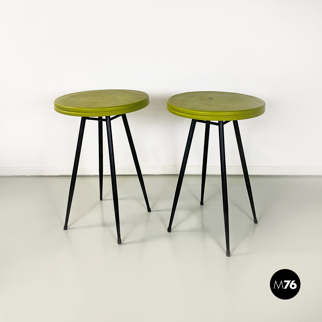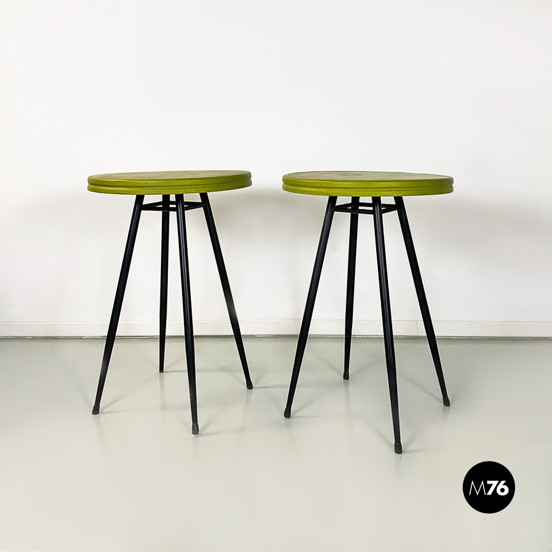Coppia di tavoli da bar o da pranzo con piano in metallo verniciato color verde acido di forma tonda e zampe in metallo nero.