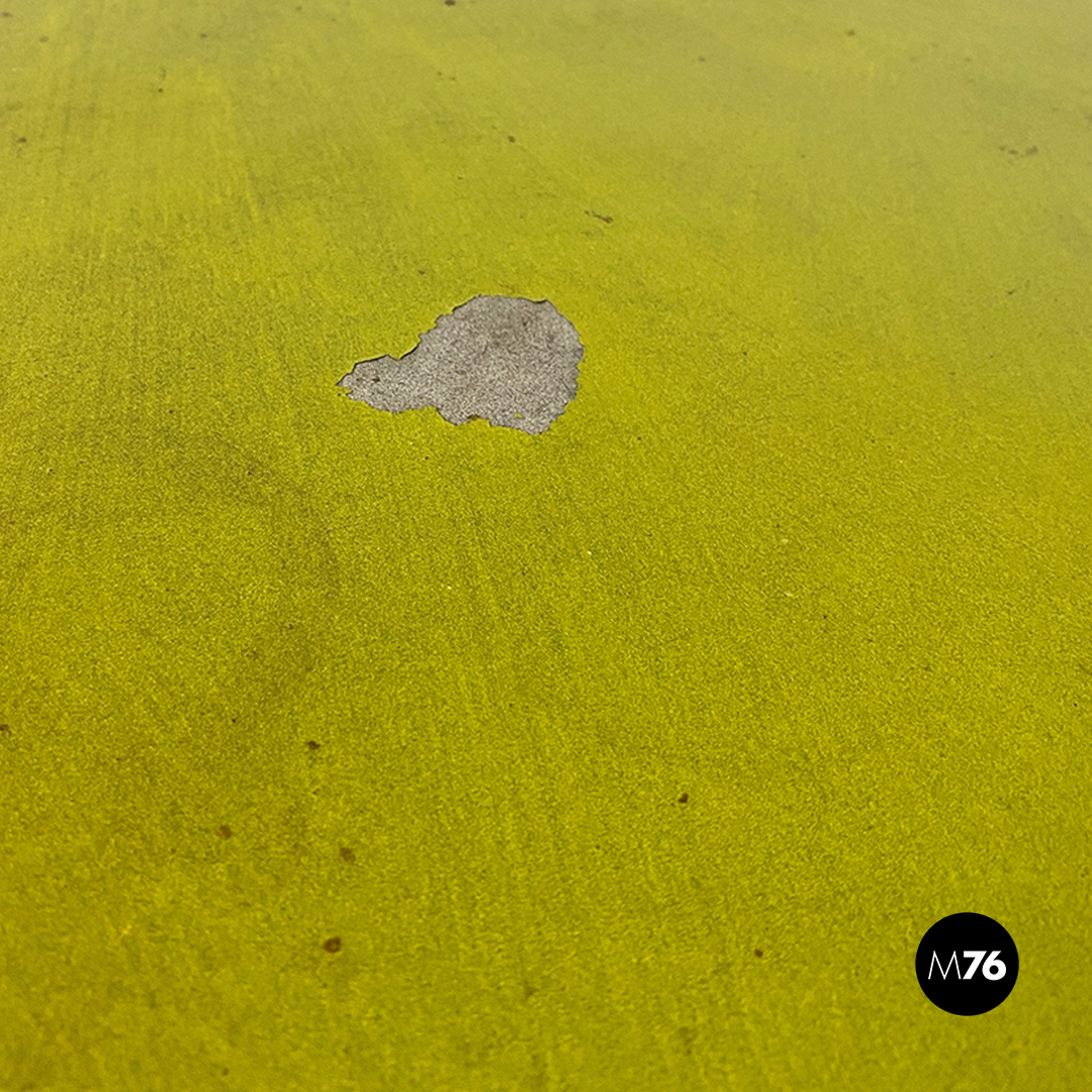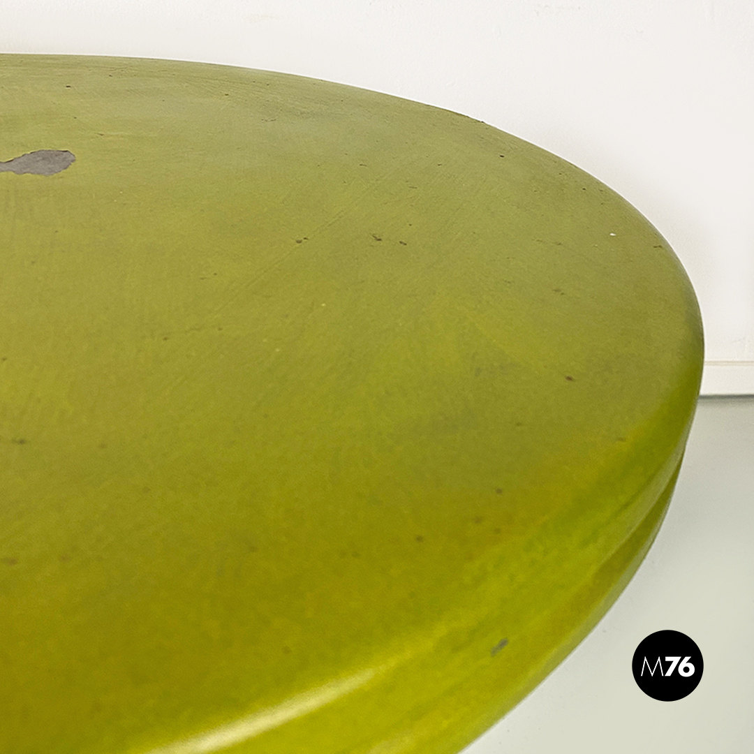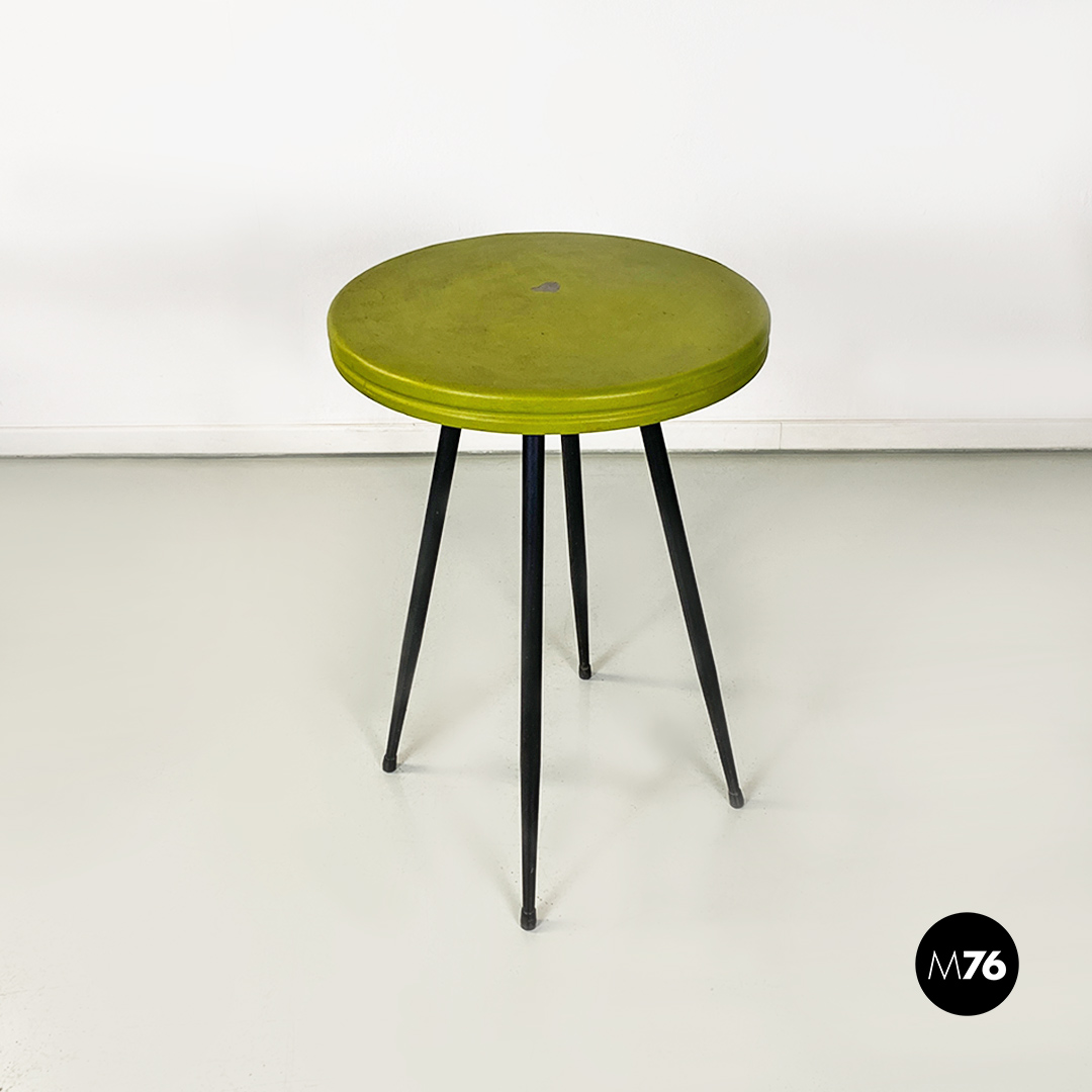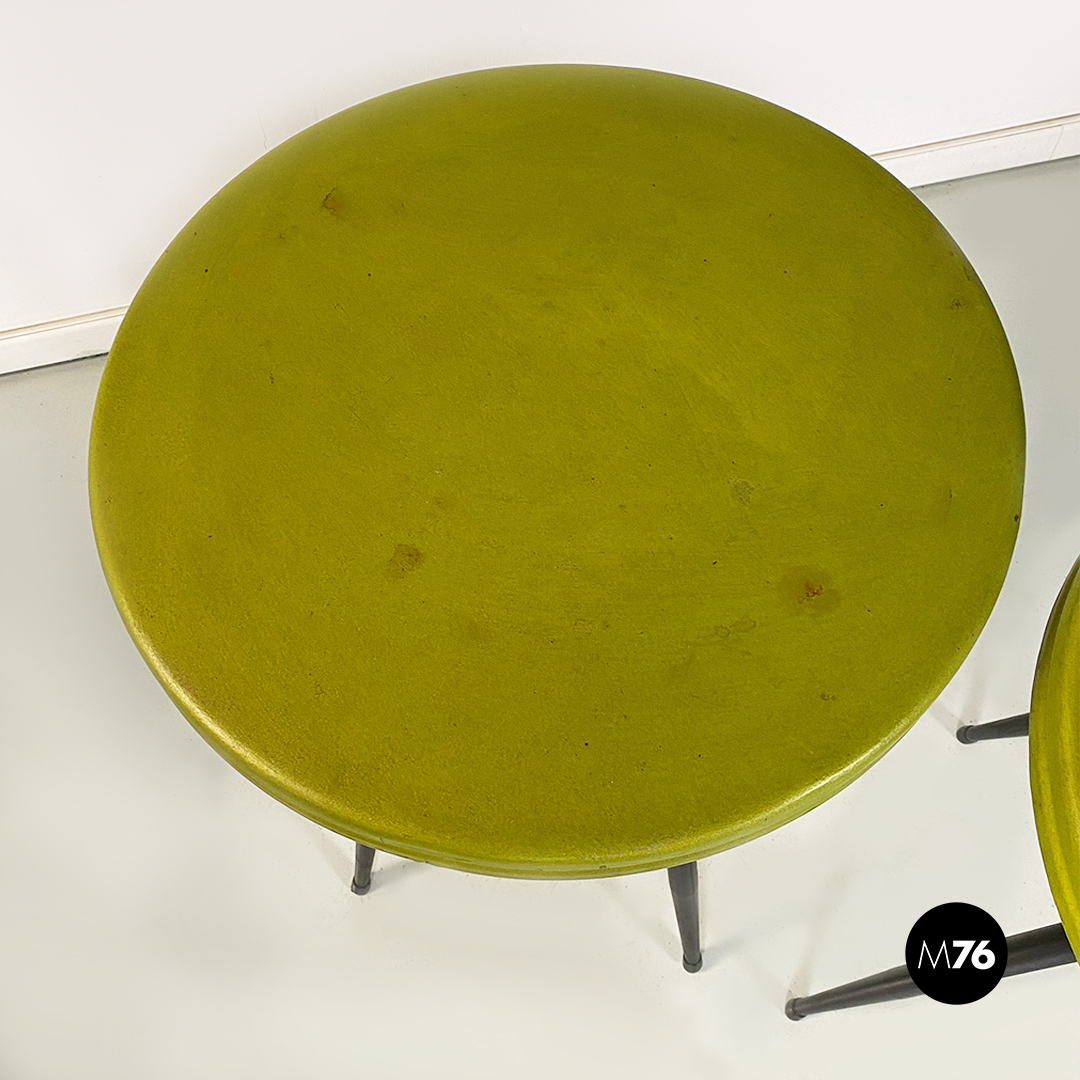 Coppia di tavoli da bar o da pranzo con piano in metallo verniciato color verde acido di forma tonda e zampe in metallo nero.