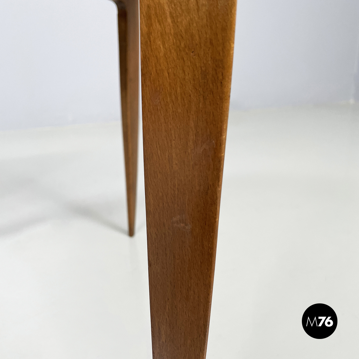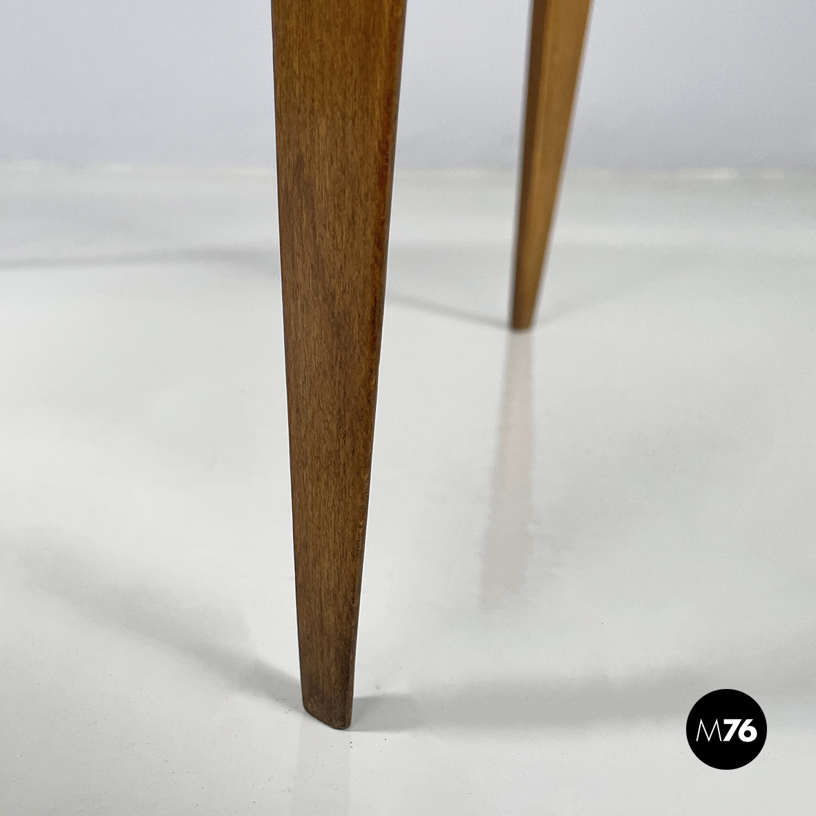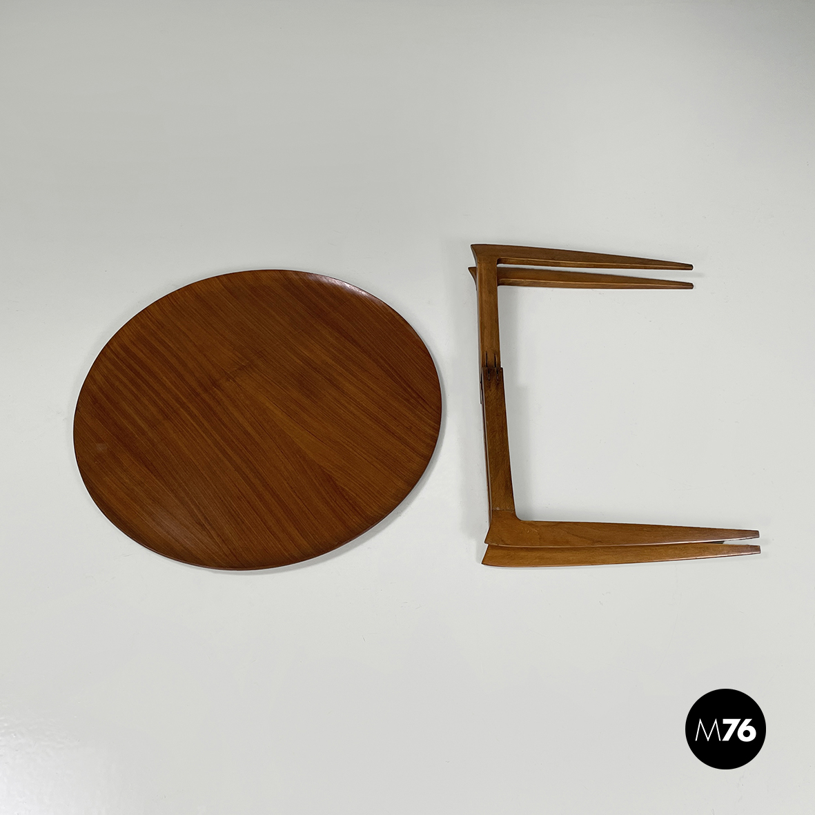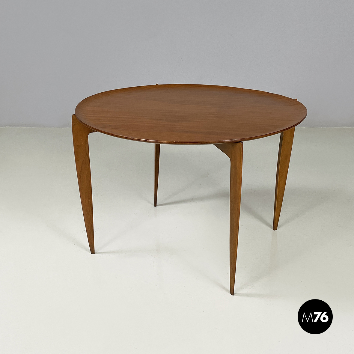 Tavolo da caffè modello 4508 con piano a vassoio tondo, interamente in teak. La zampe si tendono a stringere verso il piedino. Le zampe possono essere chiuse e il piano estratto e usato come vassoio.