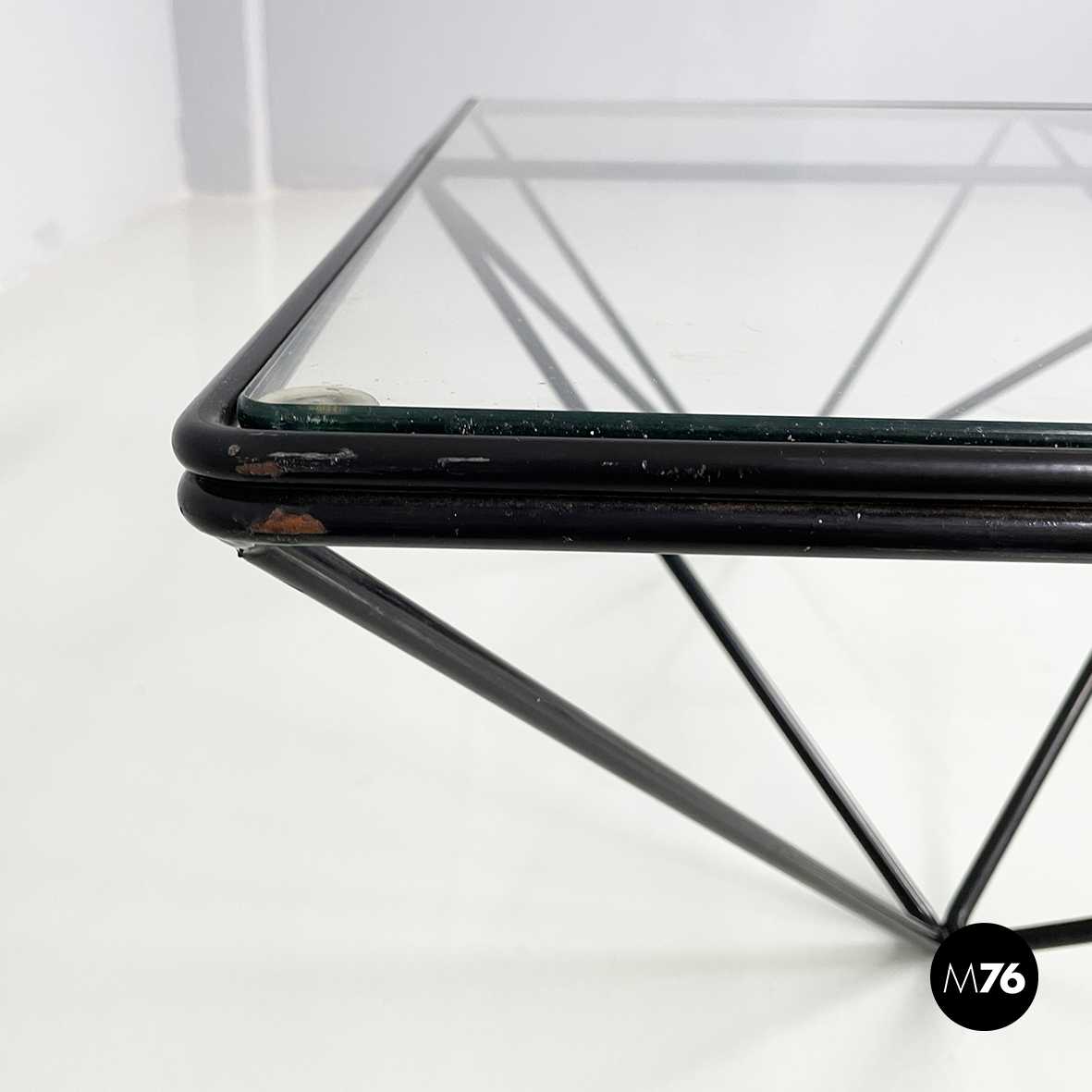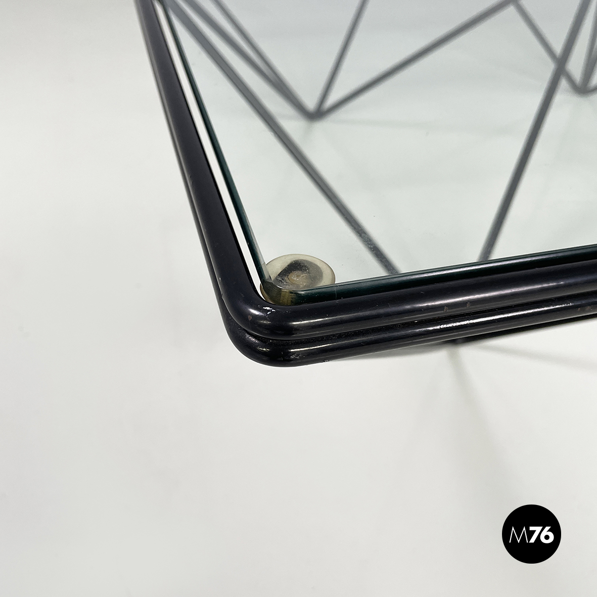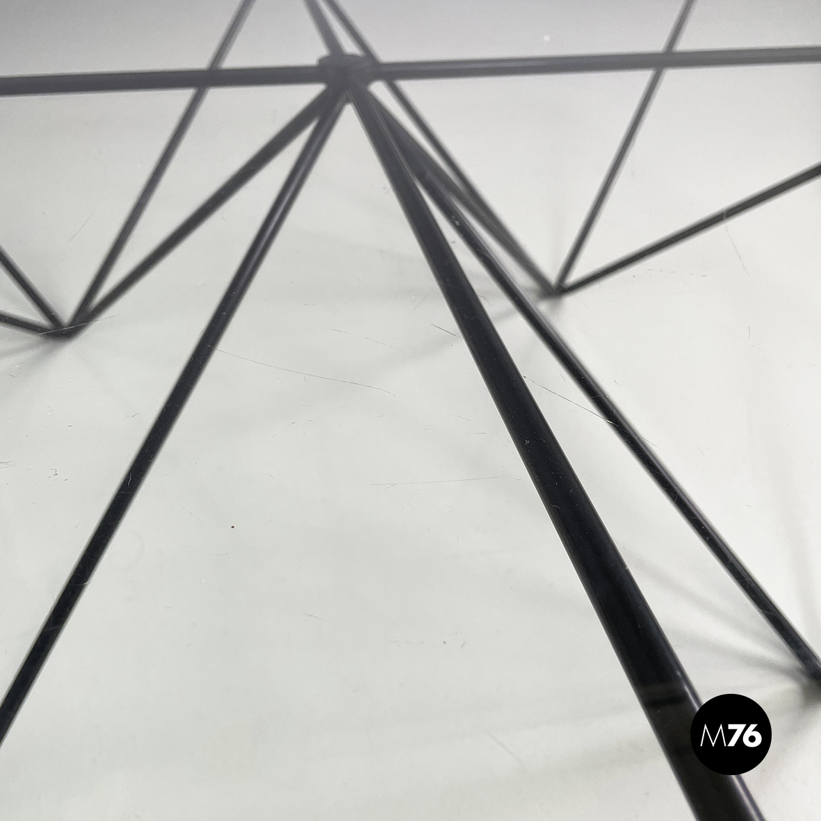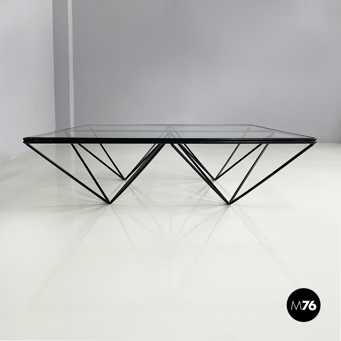 Tavolo da caffè modello Alanda con piano in vetro quadrato. La struttura in tondino di metallo verniciato nero è composta da quattro piramidi rovesciate che fanno al contempo da piedistallo e da supporto del piano.