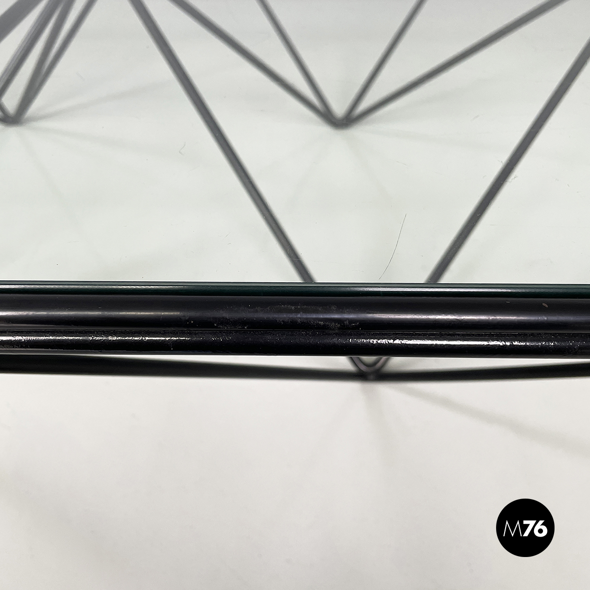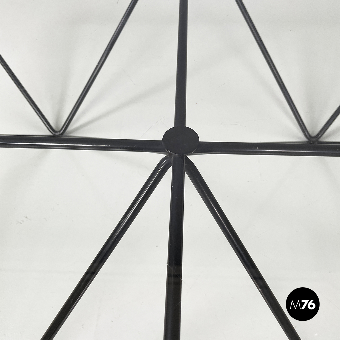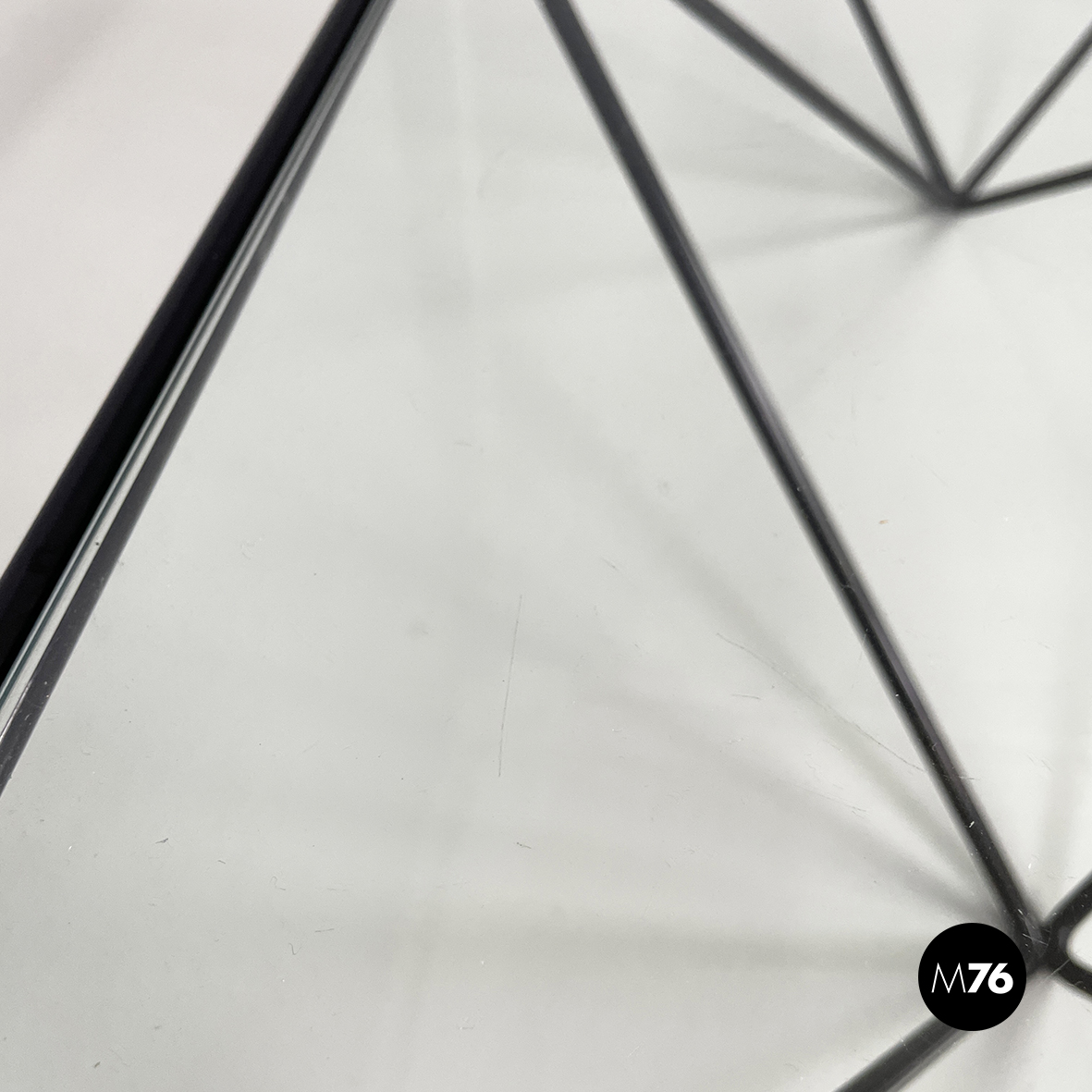 Tavolo da caffè modello Alanda con piano in vetro quadrato. La struttura in tondino di metallo verniciato nero è composta da quattro piramidi rovesciate che fanno al contempo da piedistallo e da supporto del piano.