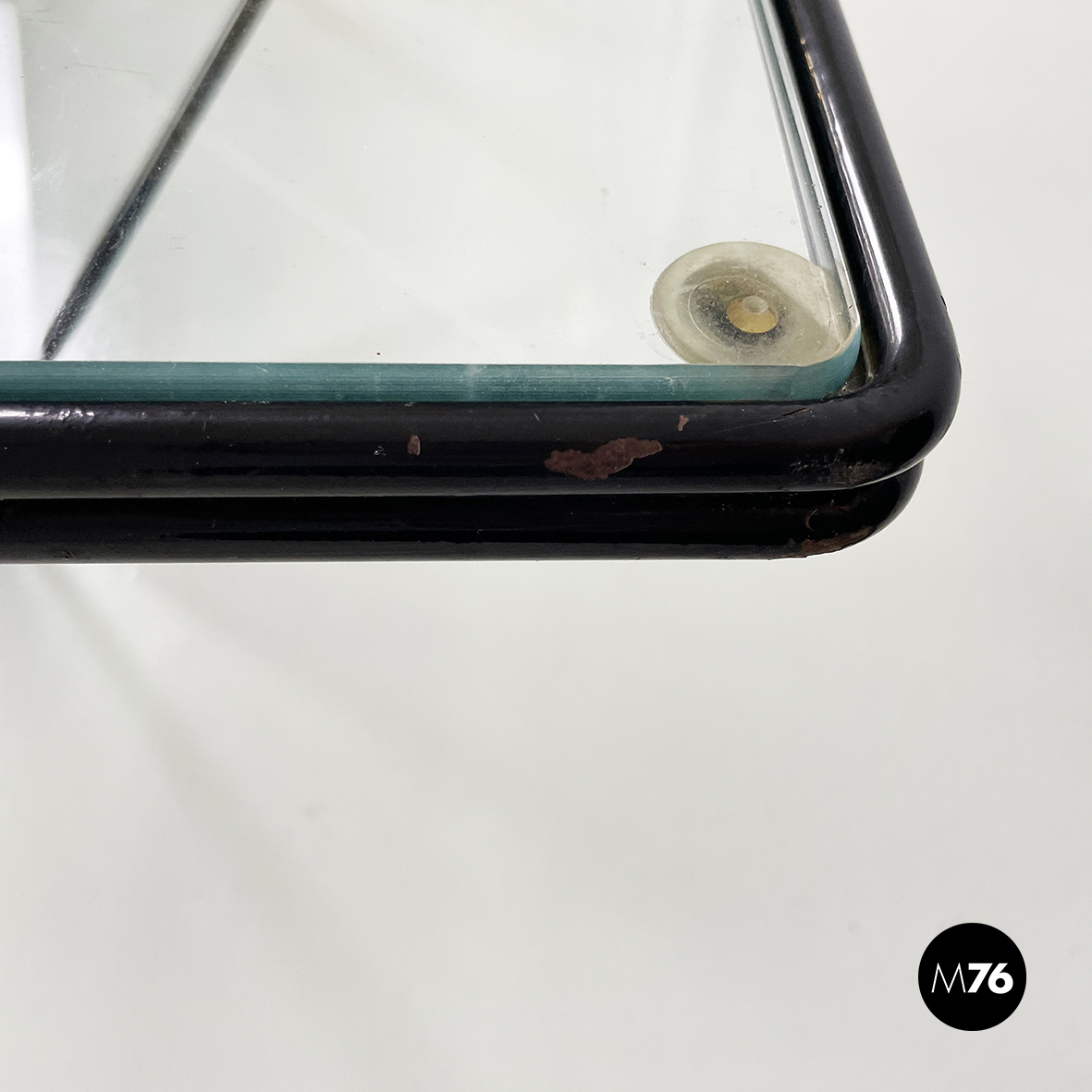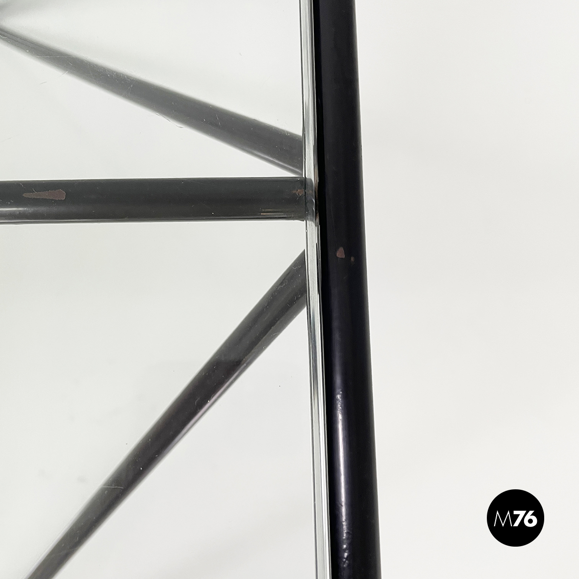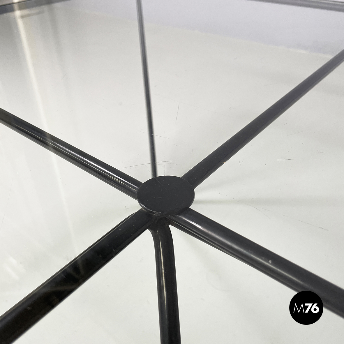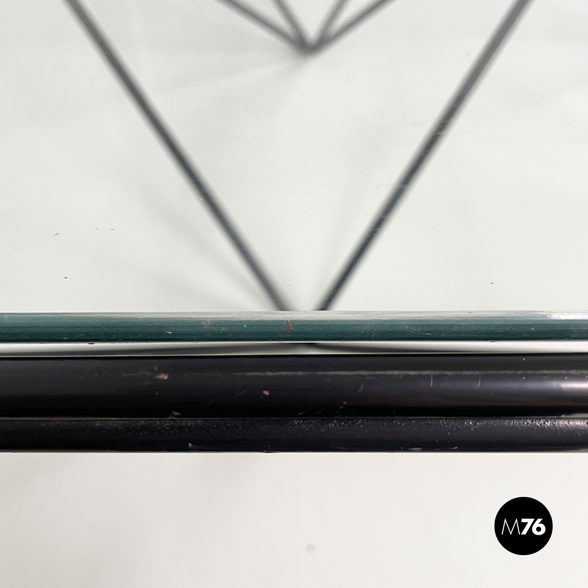 Tavolo da caffè modello Alanda con piano in vetro quadrato. La struttura in tondino di metallo verniciato nero è composta da quattro piramidi rovesciate che fanno al contempo da piedistallo e da supporto del piano.