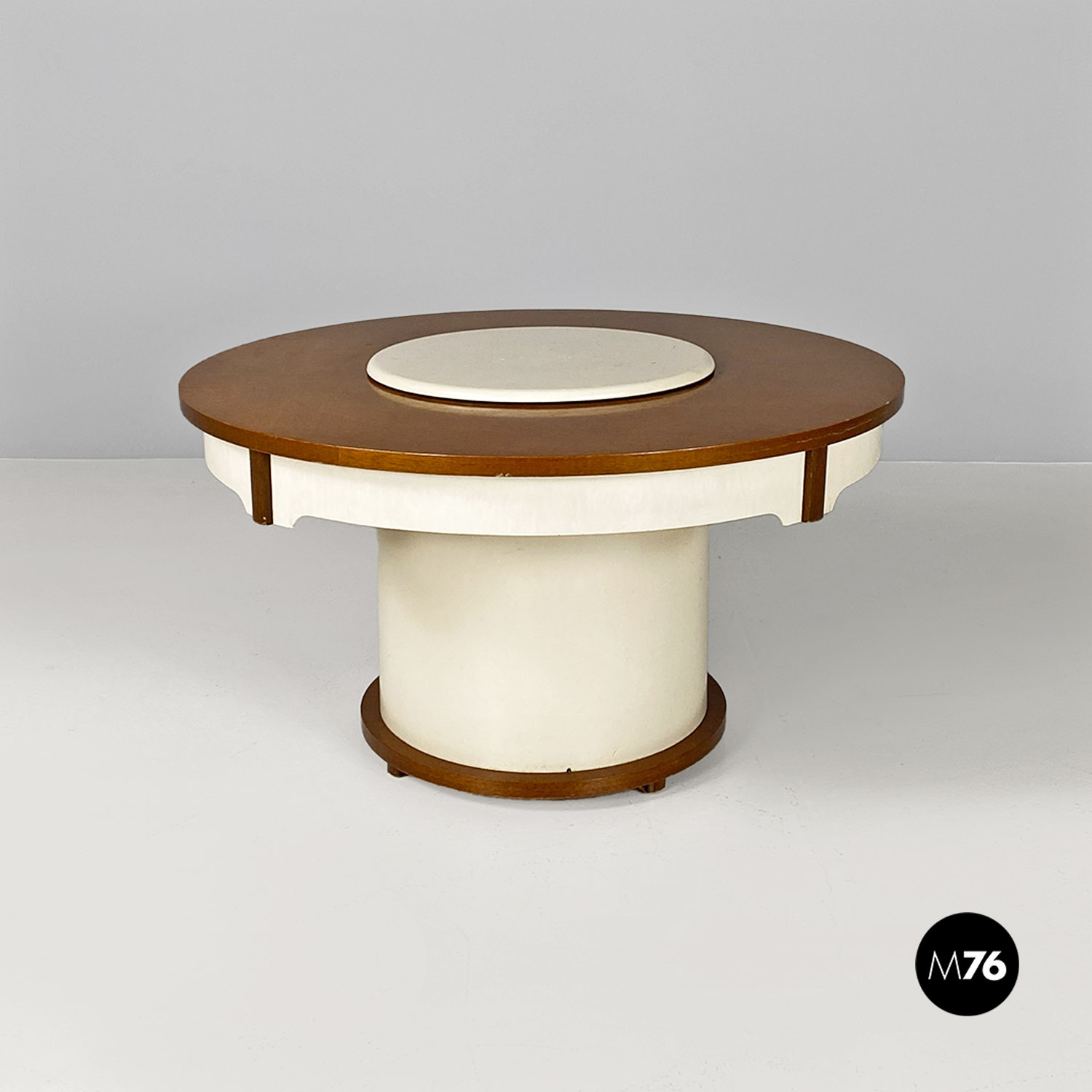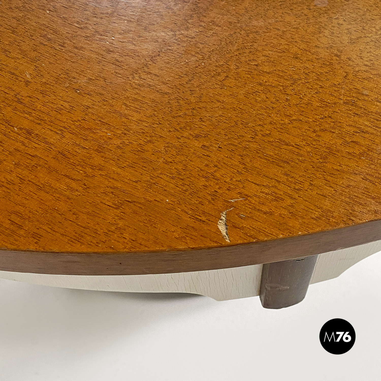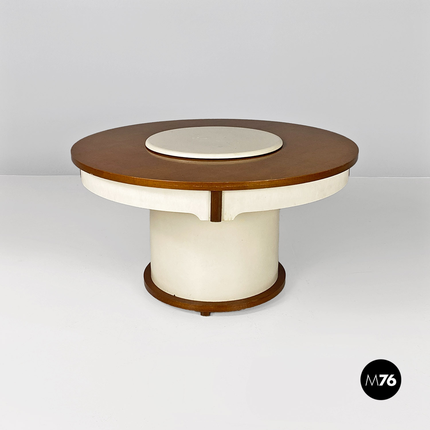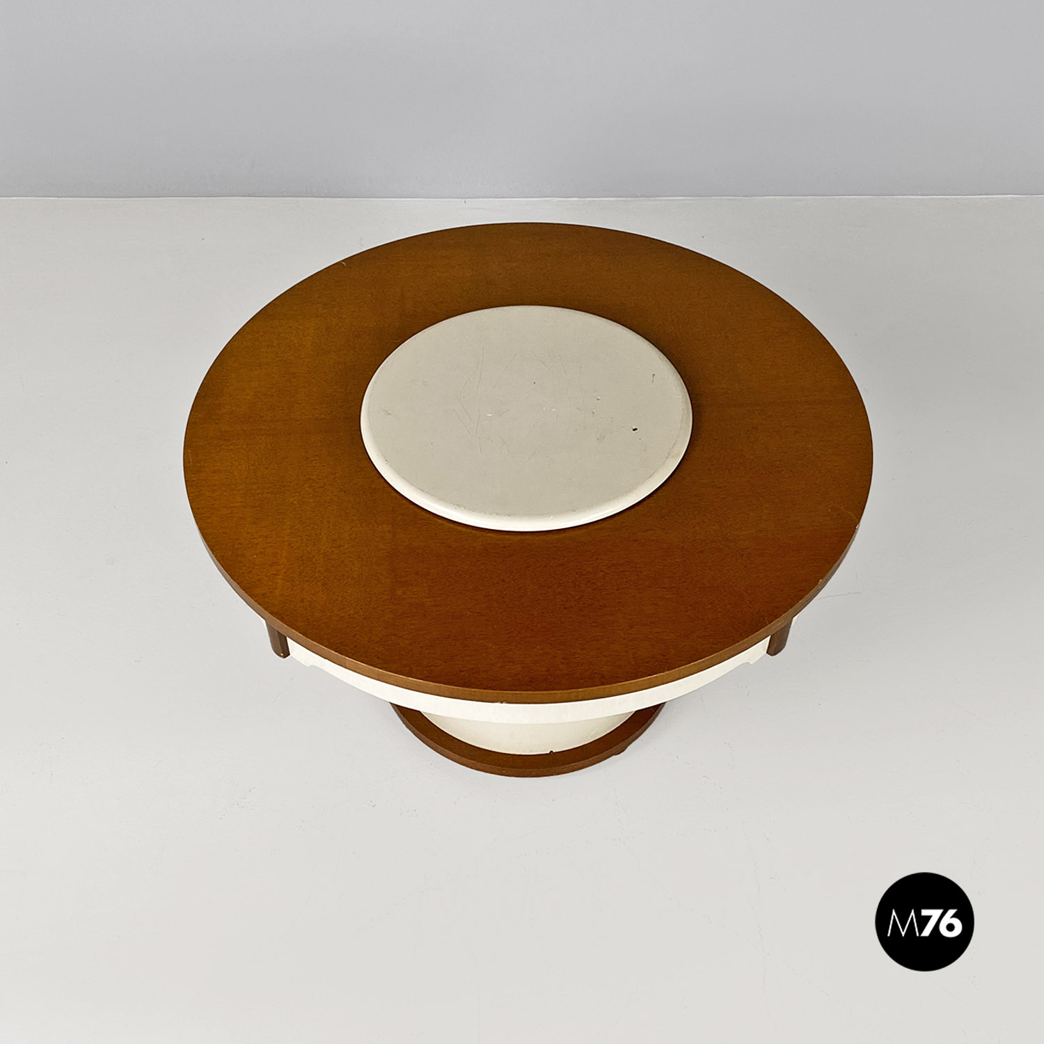 Tavolo da caffè, noto anche come tavolo Gervasino, con struttura in legno in colore naturale, con parti verniciate in bianco. Il disco bianco posto al centro del piano nasconde un vano bar portabottiglie, che viene su in automatico spostando una leva metallica, posta sotto lo stesso piano.