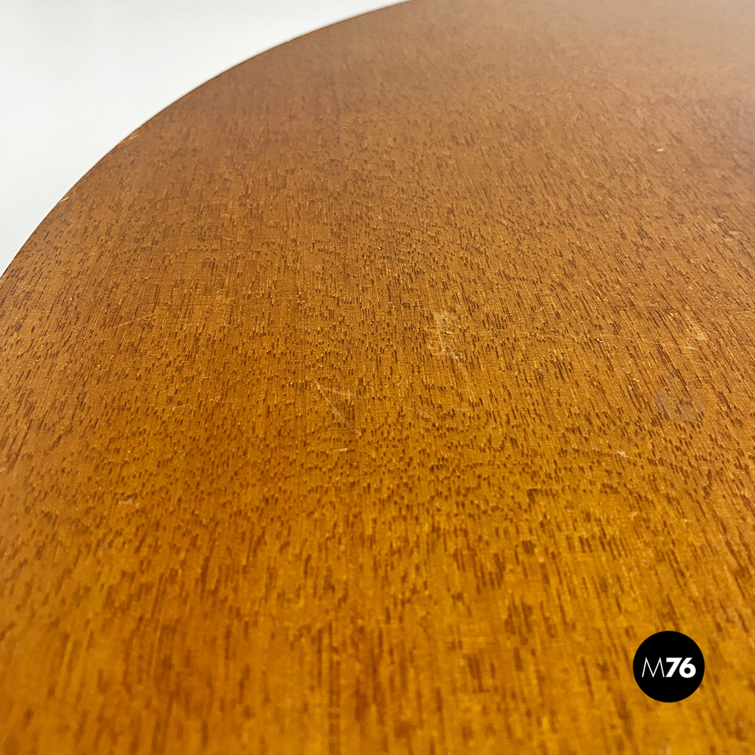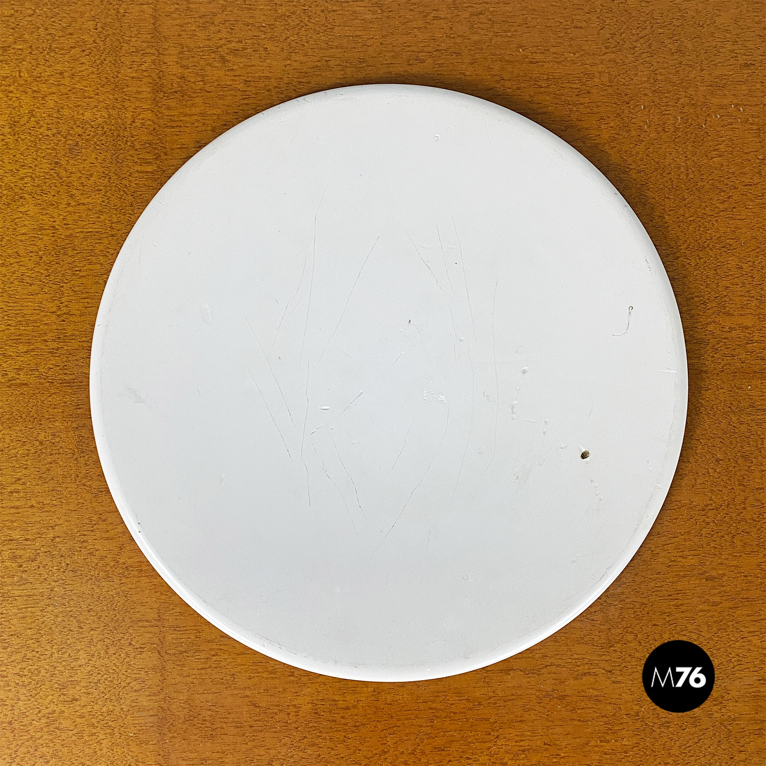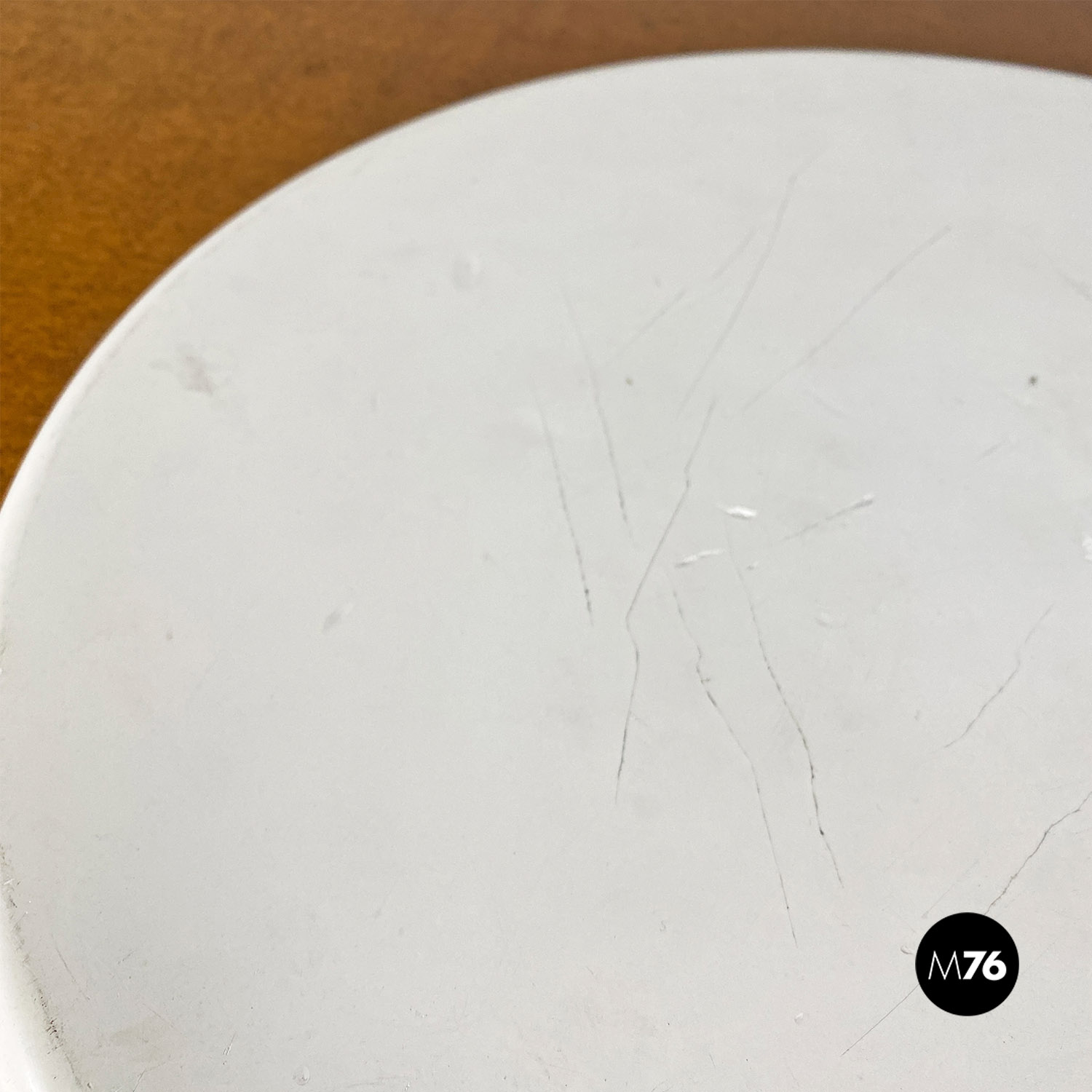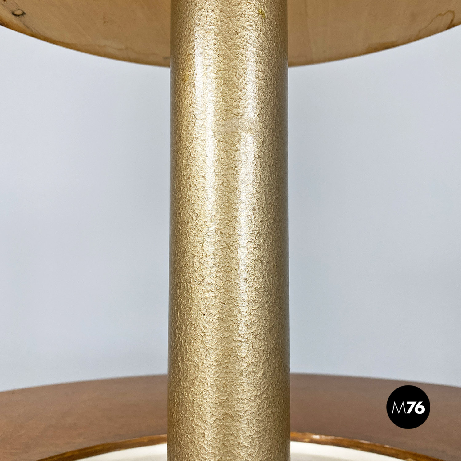Tavolo da caffè, noto anche come tavolo Gervasino, con struttura in legno in colore naturale, con parti verniciate in bianco. Il disco bianco posto al centro del piano nasconde un vano bar portabottiglie, che viene su in automatico spostando una leva metallica, posta sotto lo stesso piano.