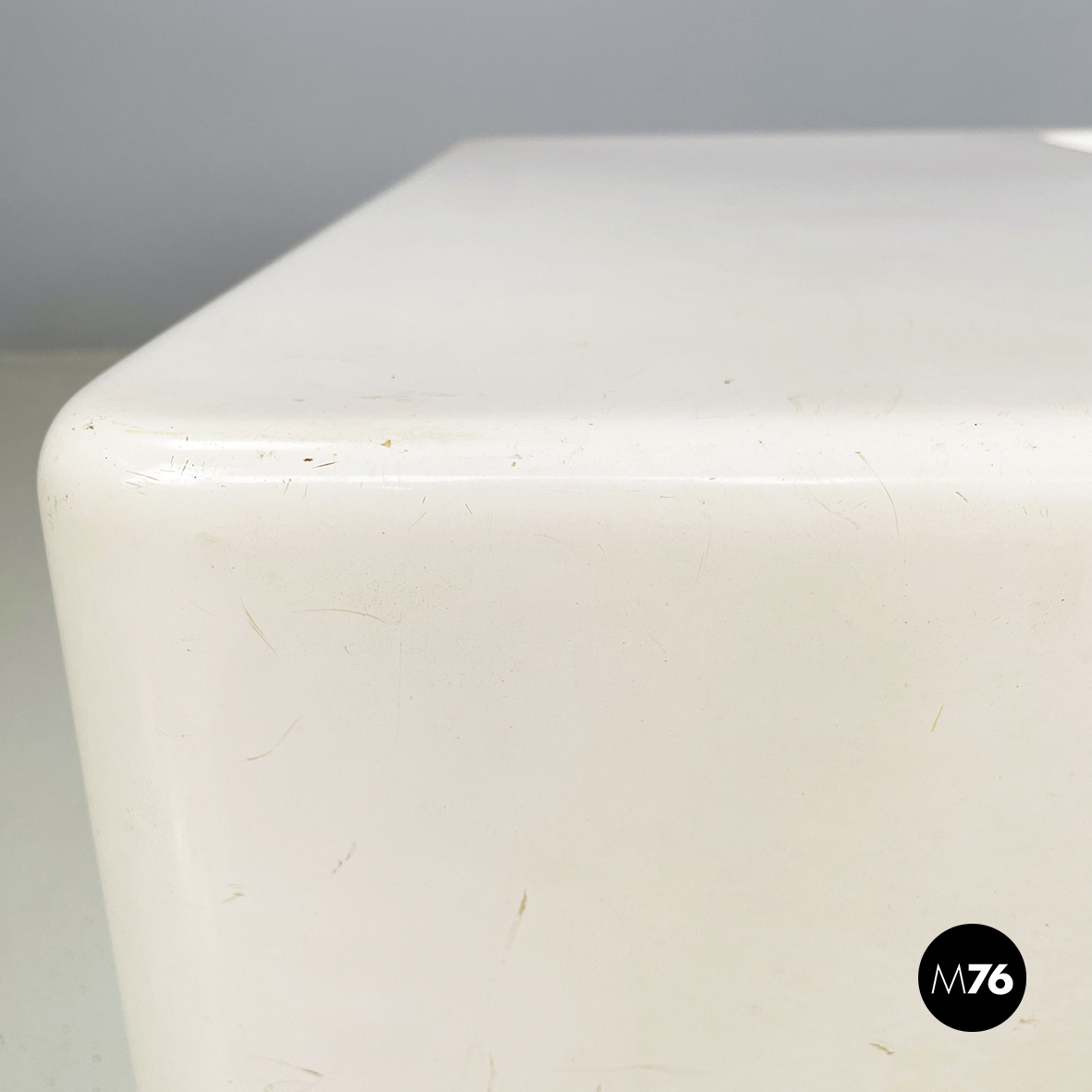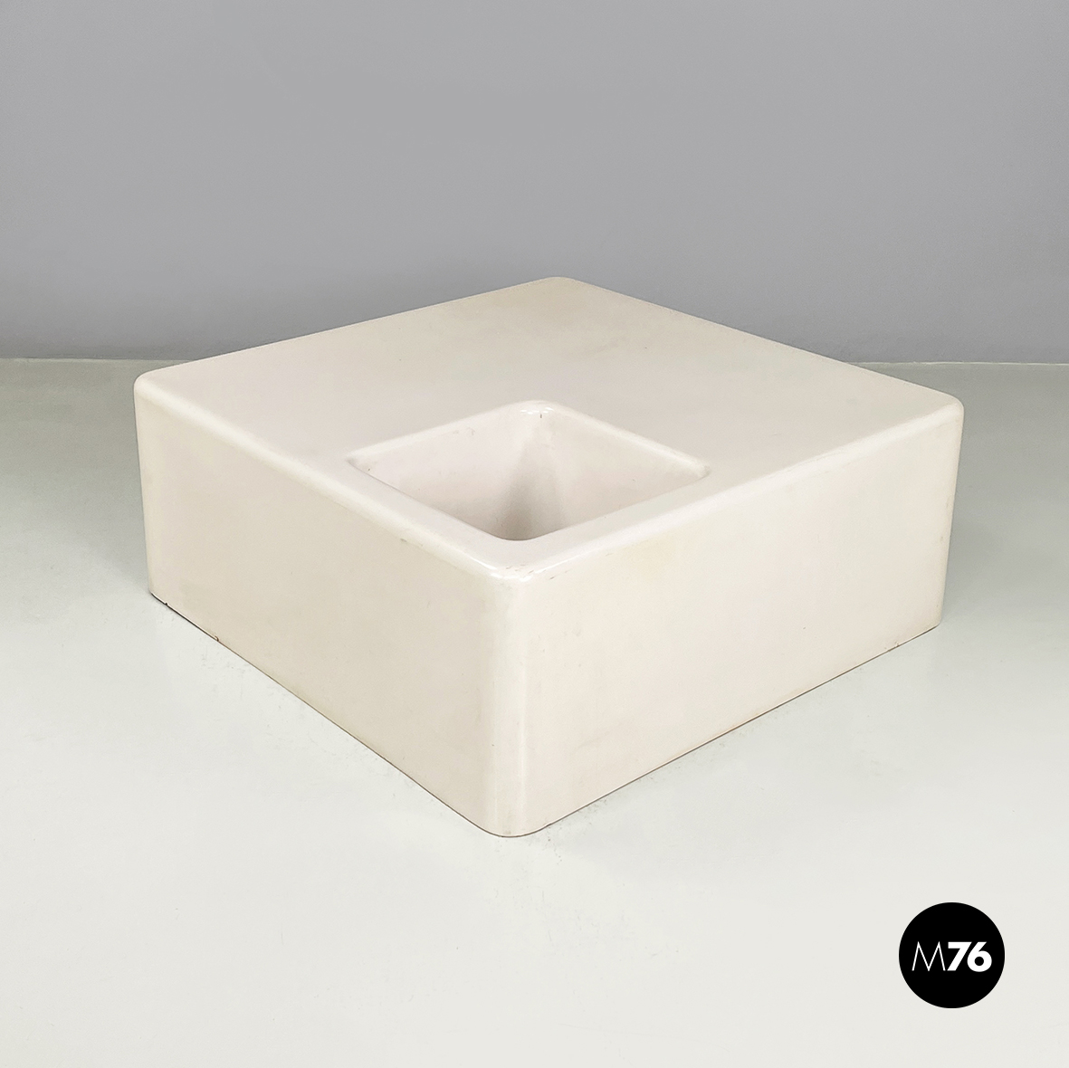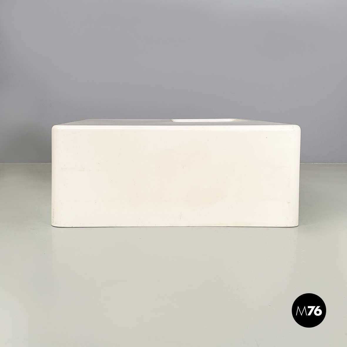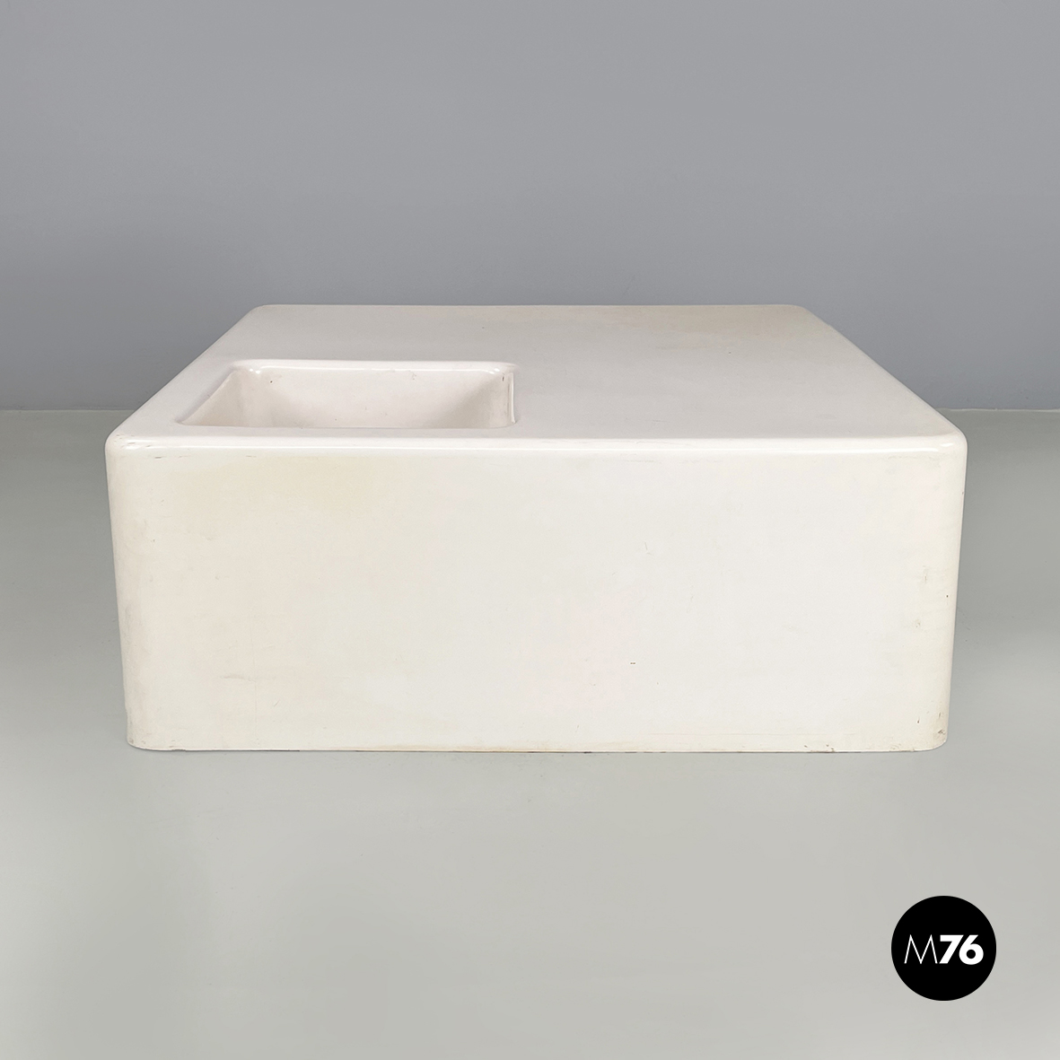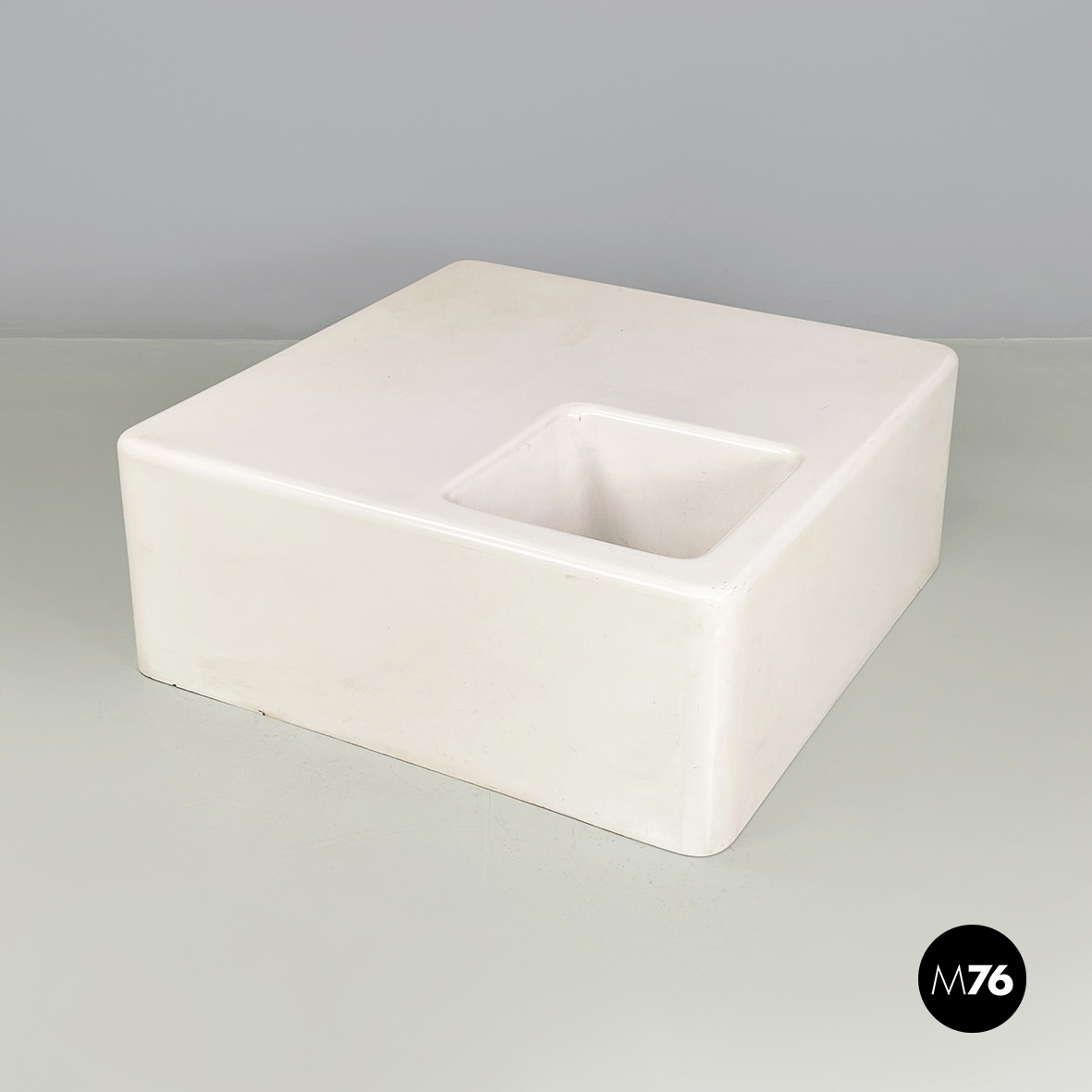 Tavolo da caffè con portabottiglie in vetroresina bianca. Il tavolo presenta una struttura monoscocca in vetroresina a base quadrata. In un angolo presenta un vano quadrato, utilizzabile come vasiera o portaoggetti. Il tavolo è adatto ad uso esterno come per il giardino.