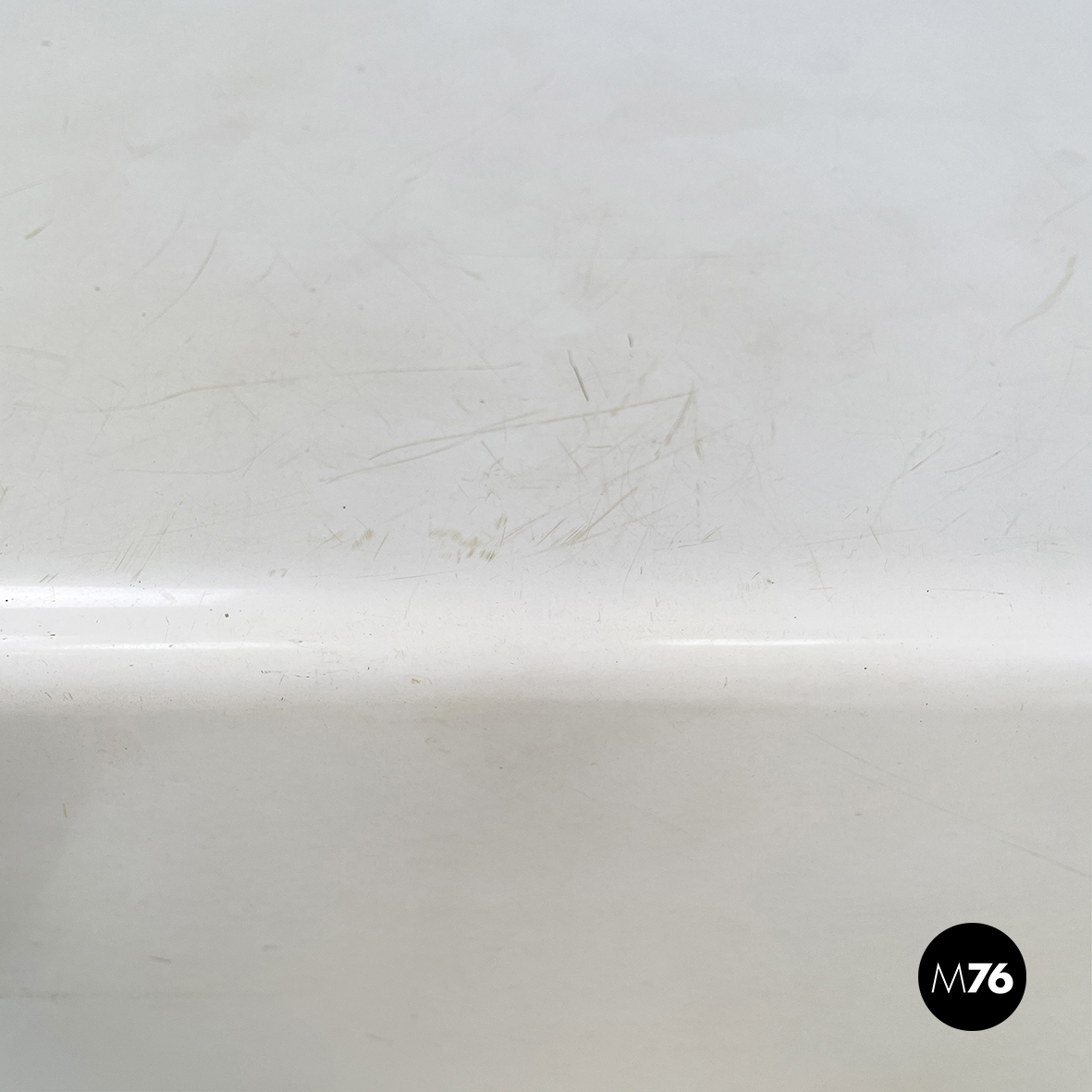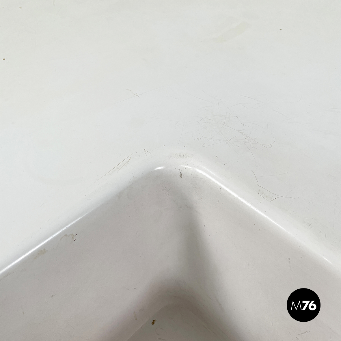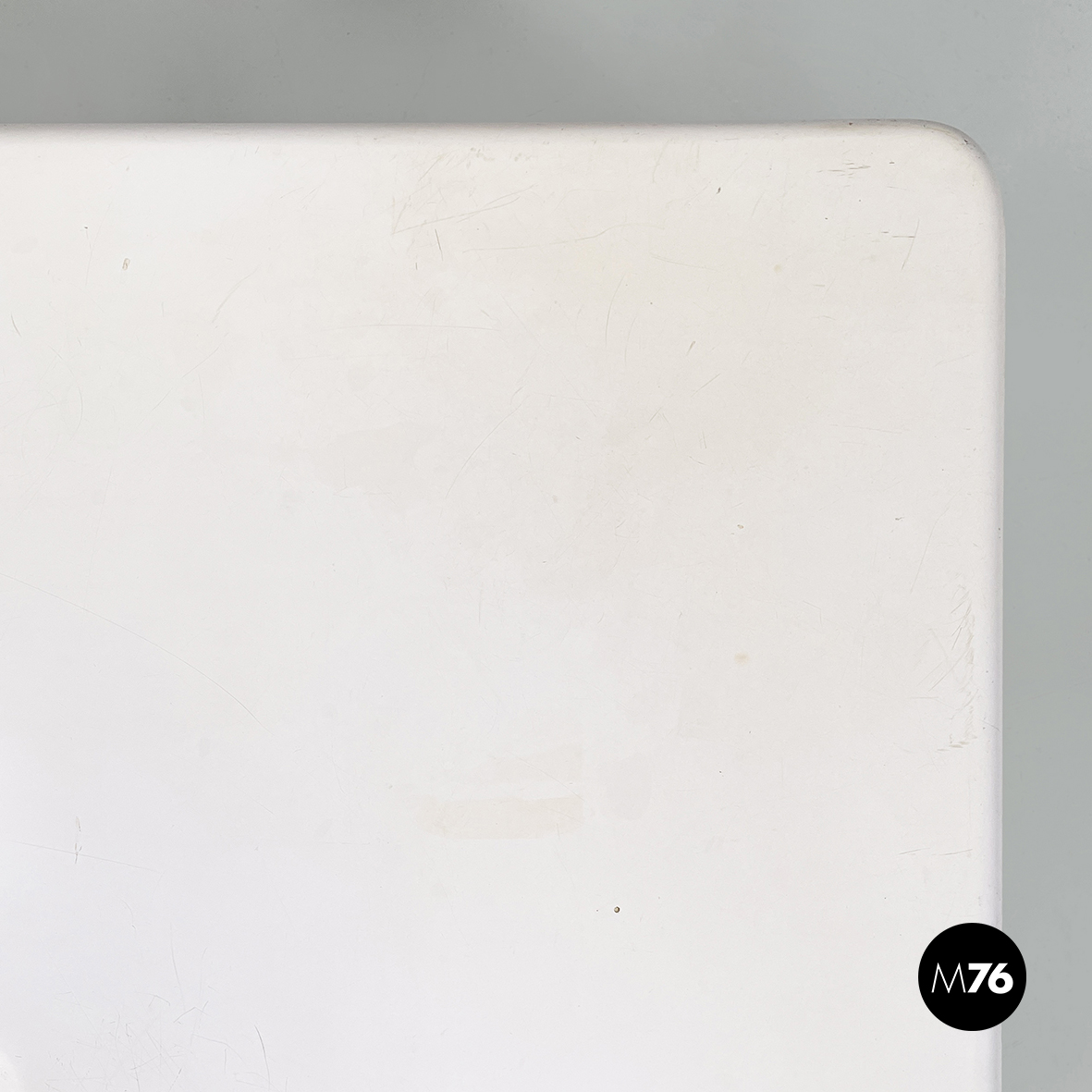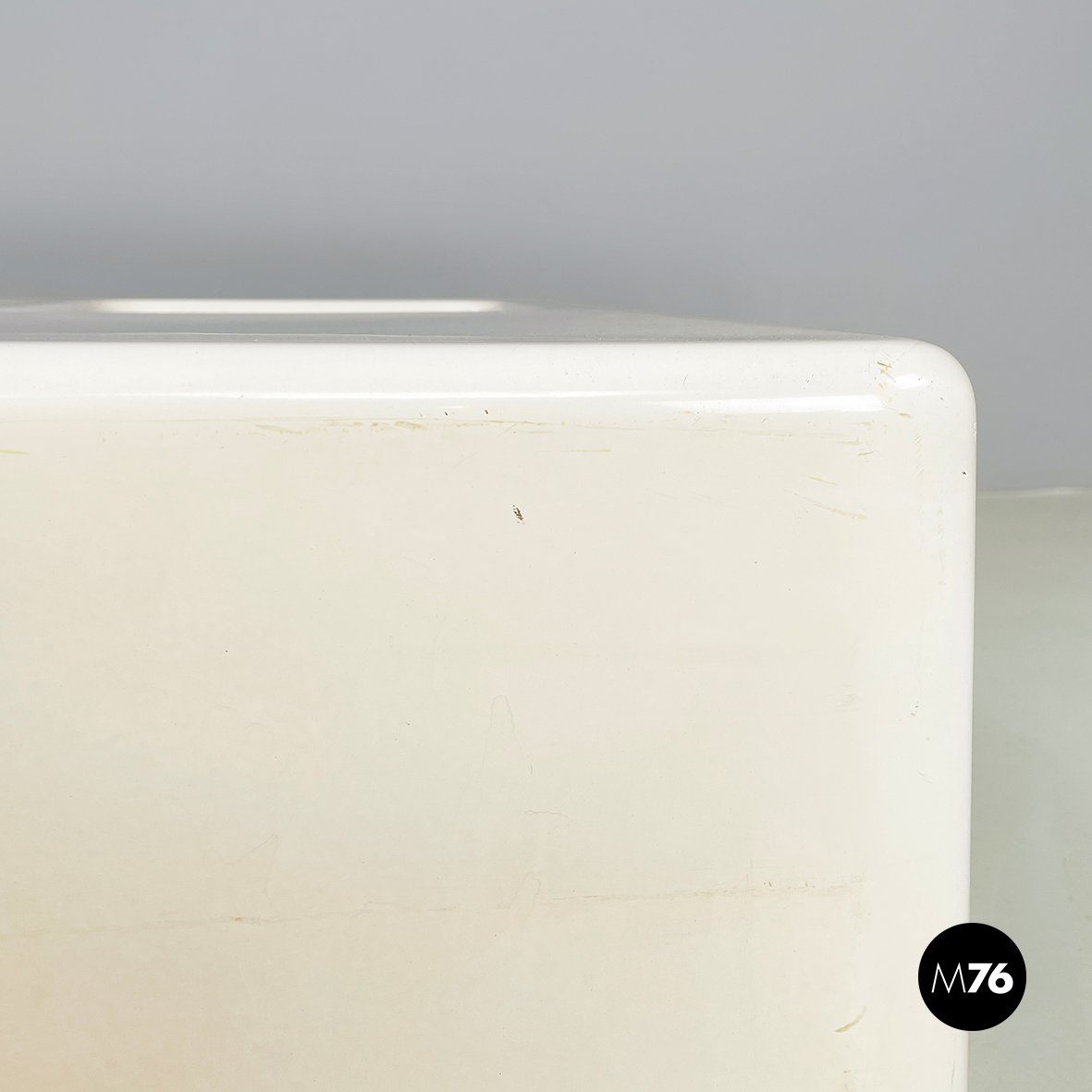 Tavolo da caffè con portabottiglie in vetroresina bianca. Il tavolo presenta una struttura monoscocca in vetroresina a base quadrata. In un angolo presenta un vano quadrato, utilizzabile come vasiera o portaoggetti. Il tavolo è adatto ad uso esterno come per il giardino.