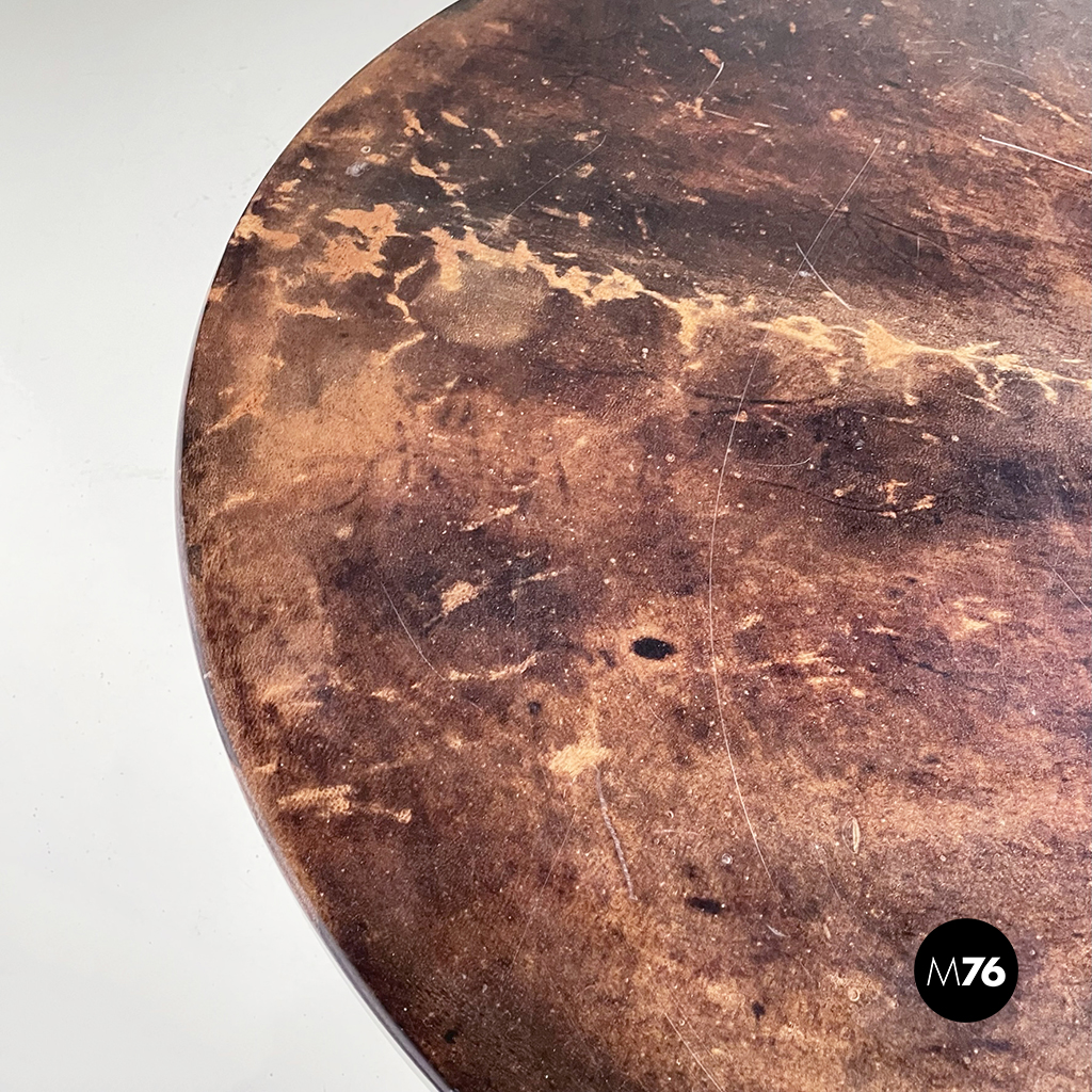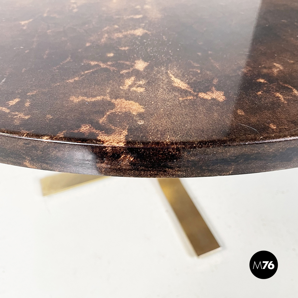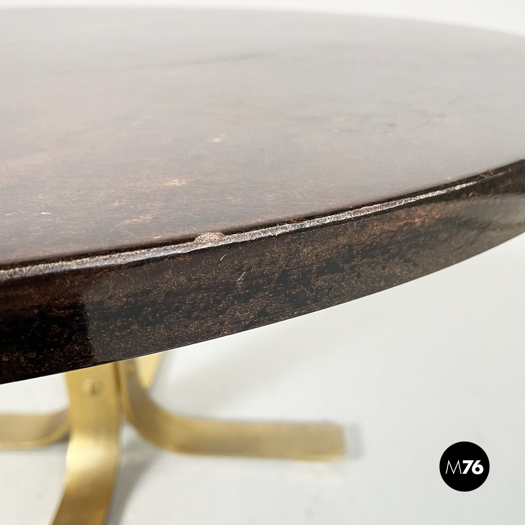 Tavolo da caffè con piano tondo in legno, rivestito in pergamena con finitura in marrone scuro. La zampa a quattro razze è in ottone.