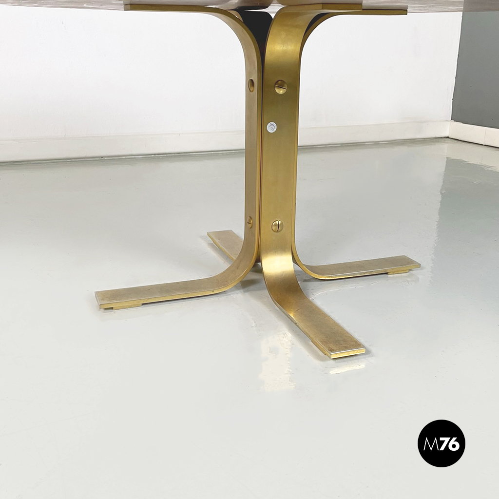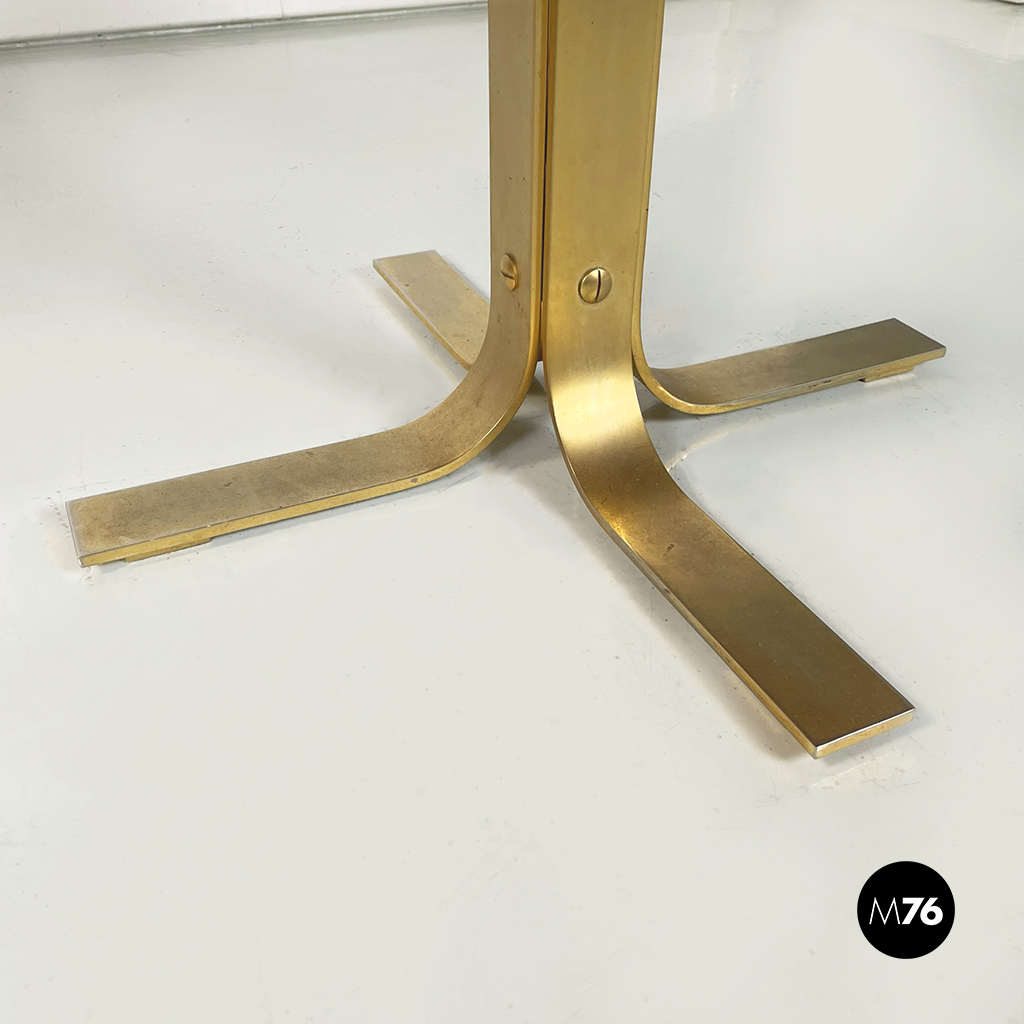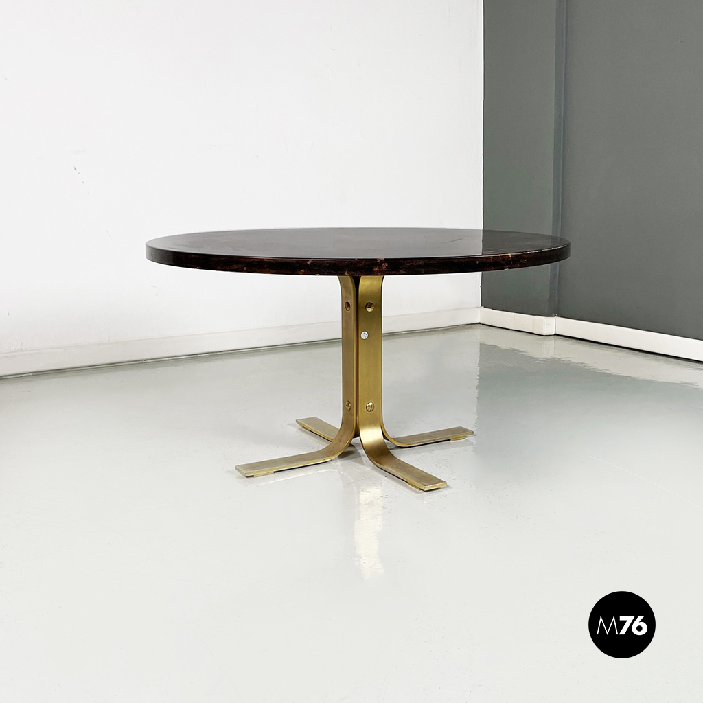 Tavolo da caffè con piano tondo in legno, rivestito in pergamena con finitura in marrone scuro. La zampa a quattro razze è in ottone.