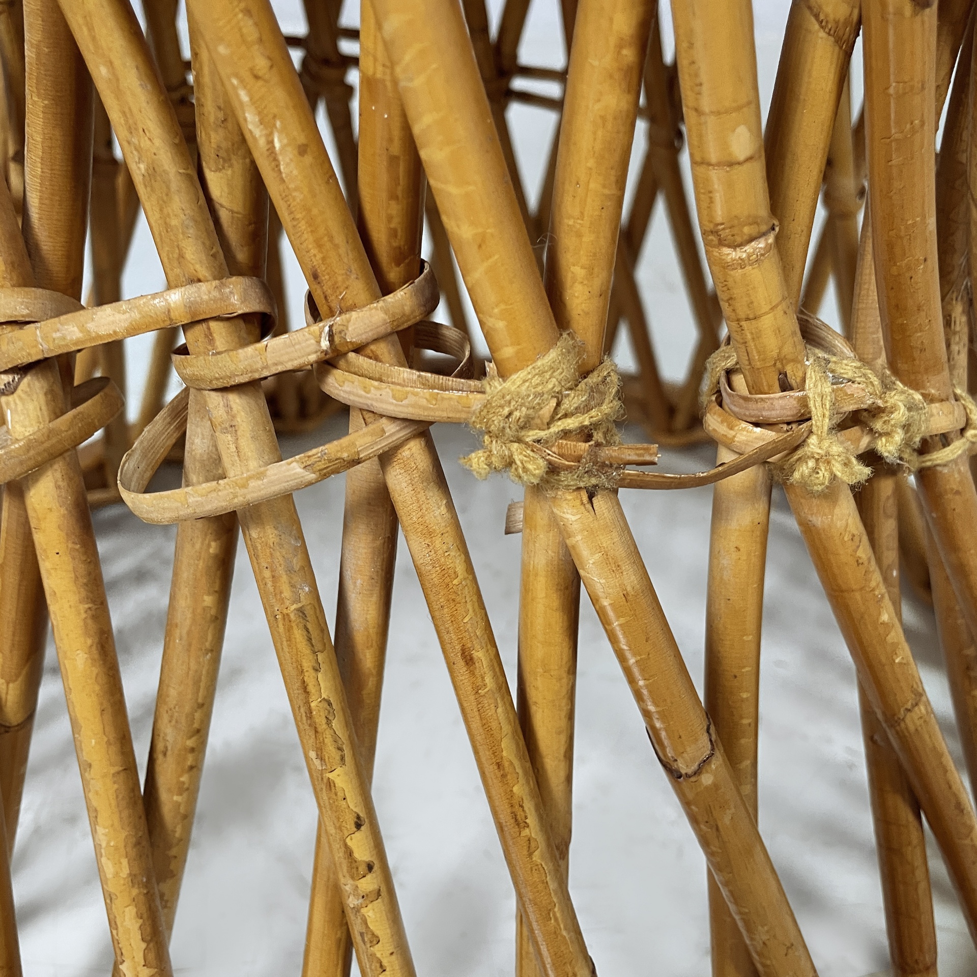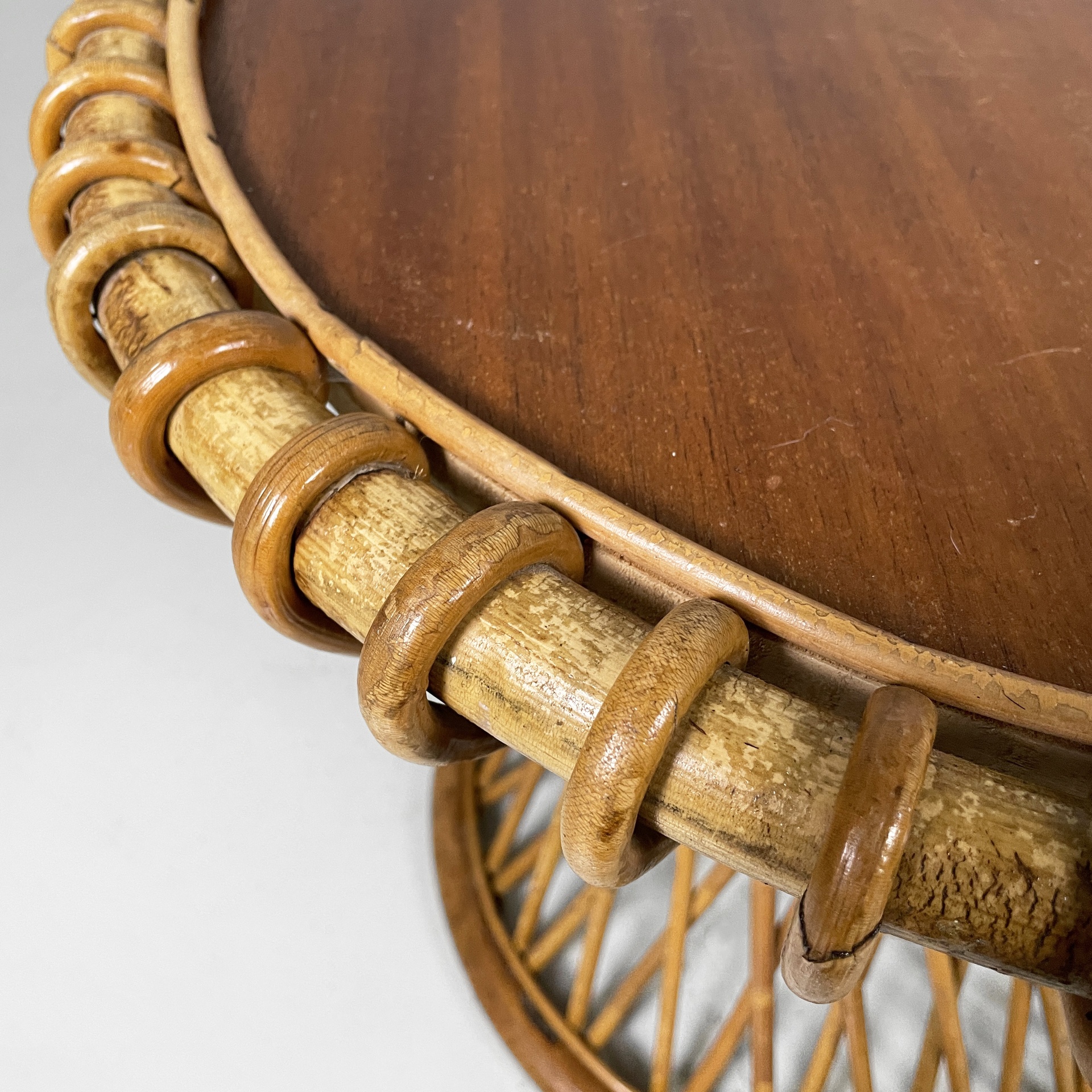 Condizioni discrete. Il piano in legno presenta leggeri segni sparsi. Il rattan presenta diversi segni e piccole mancanze agli intrecci.