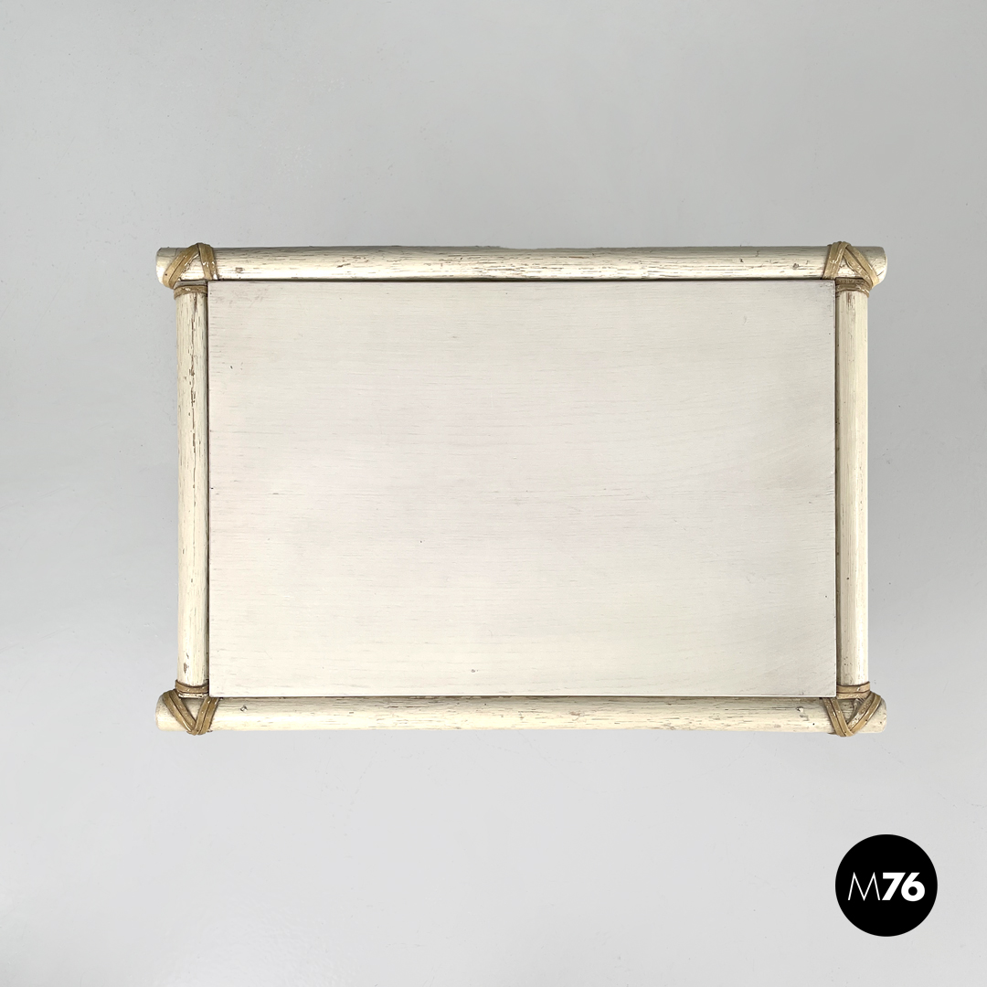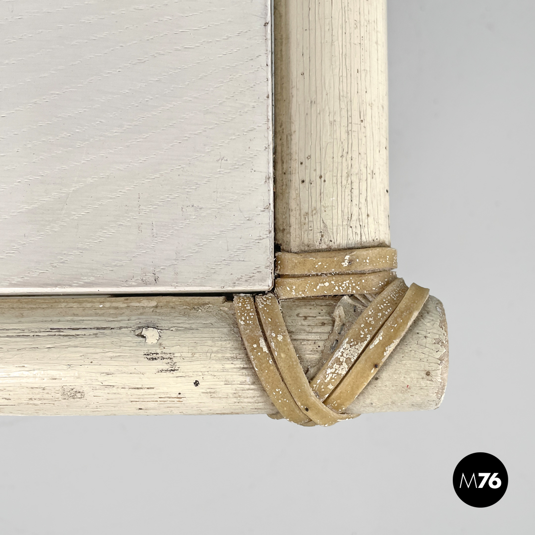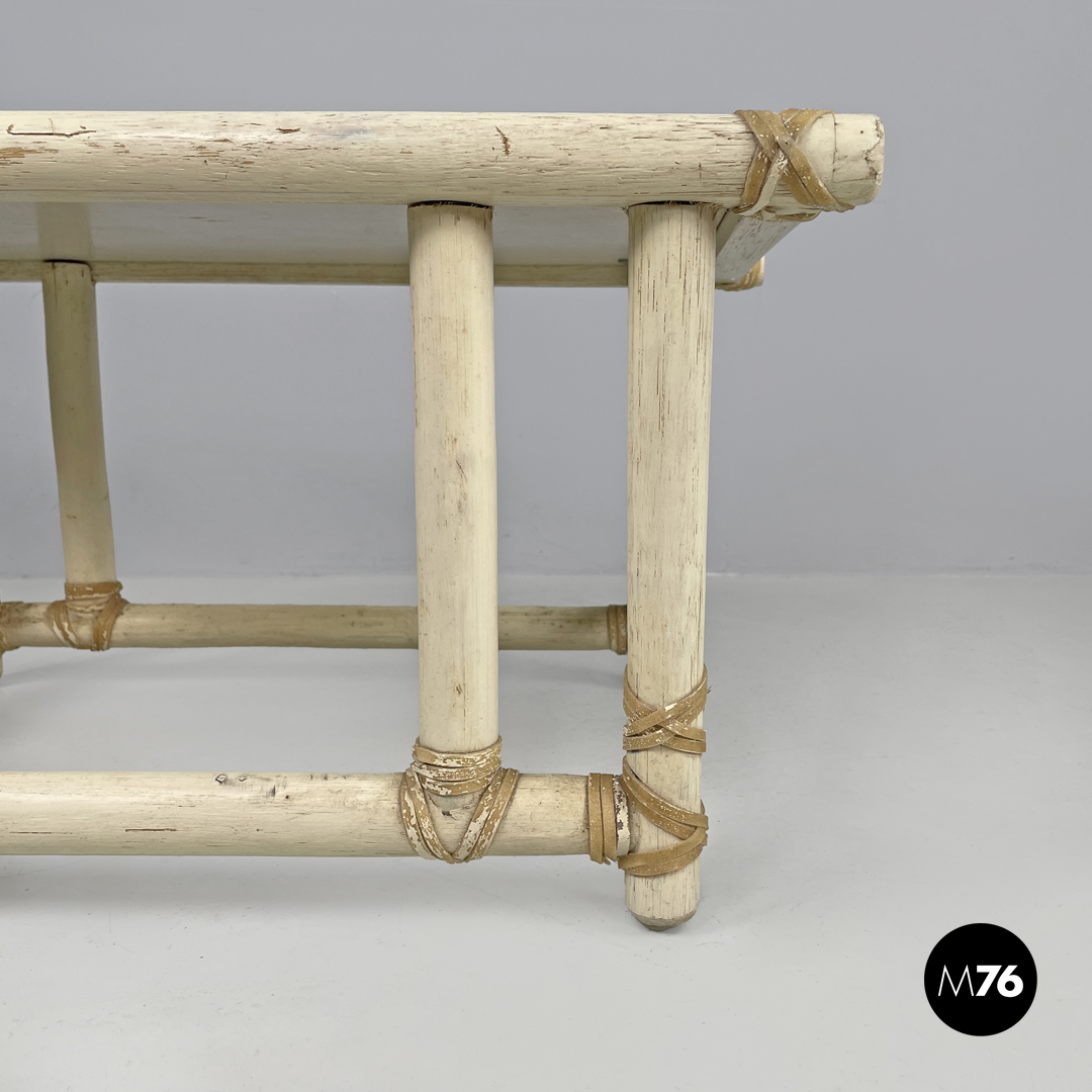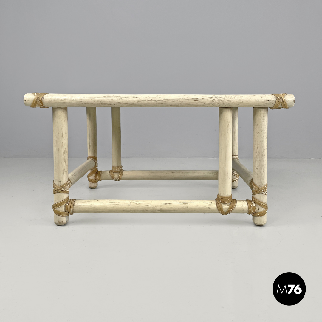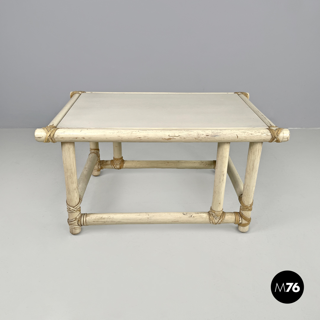 Tavolo da caffè rettangolare in rattan. Il piano è in legno verniciato bianco, la struttura è composta da listelli di bamboo incrociati e legati tra loro con un laccio in plastica beige, ed anch’essi sono verniciati in bianco. Utilizzabile anche in un ambiente esterno come un giardino, un terrazzo o una veranda.
