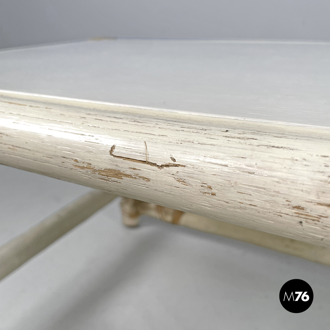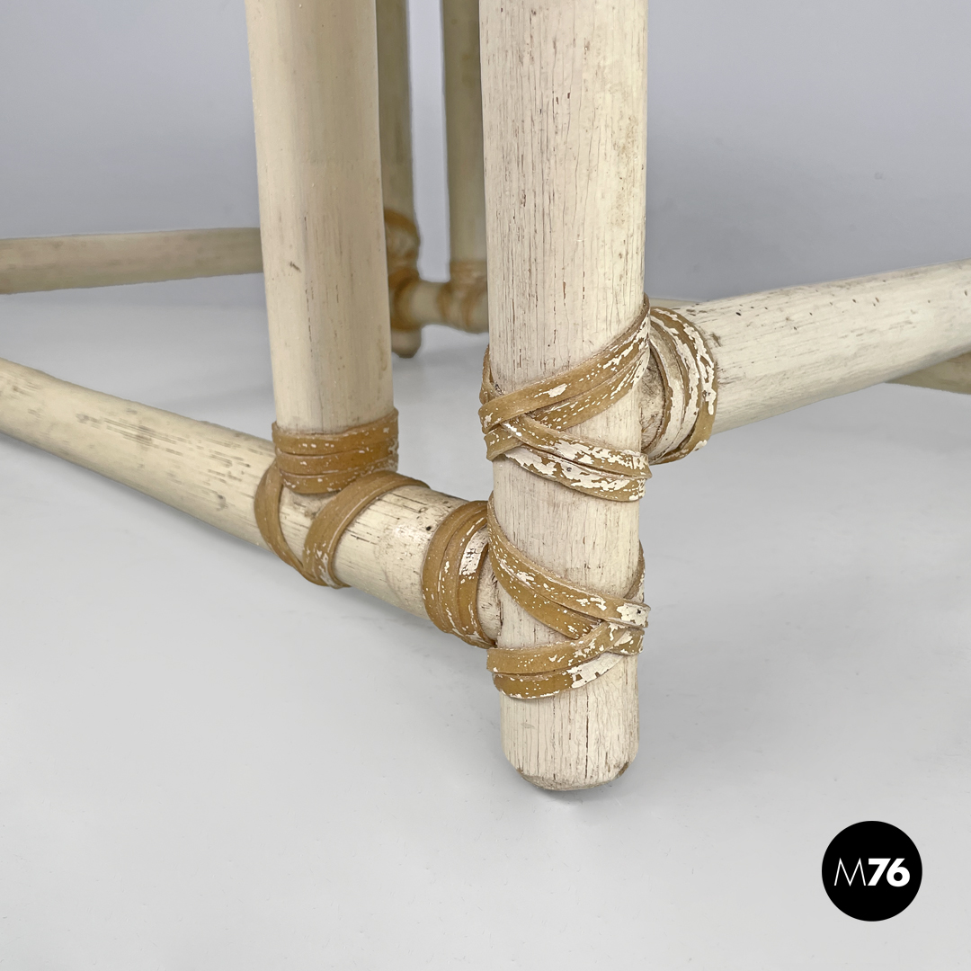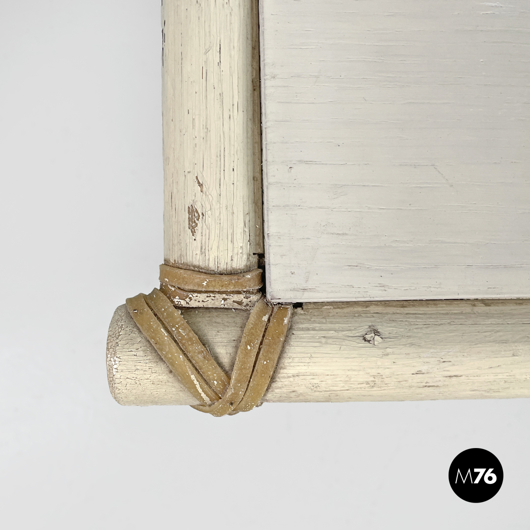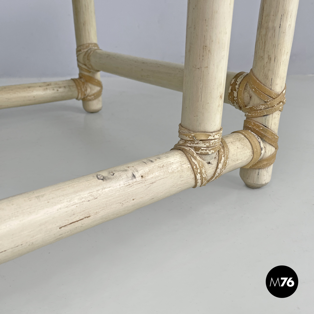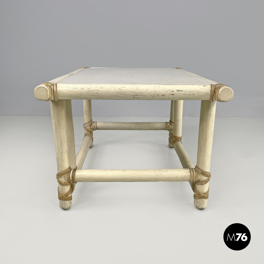 Tavolo da caffè rettangolare in rattan. Il piano è in legno verniciato bianco, la struttura è composta da listelli di bamboo incrociati e legati tra loro con un laccio in plastica beige, ed anch’essi sono verniciati in bianco. Utilizzabile anche in un ambiente esterno come un giardino, un terrazzo o una veranda.