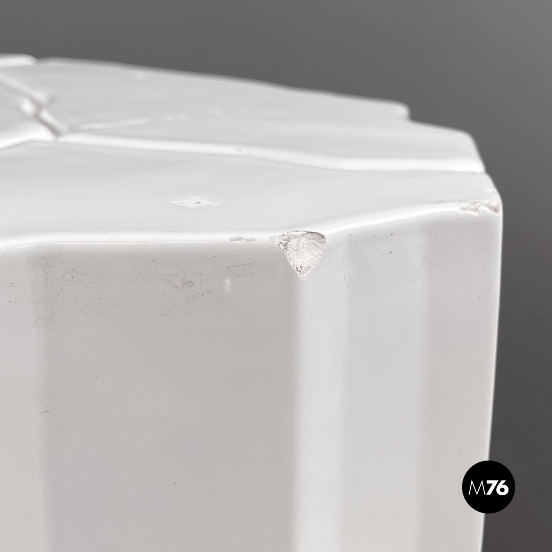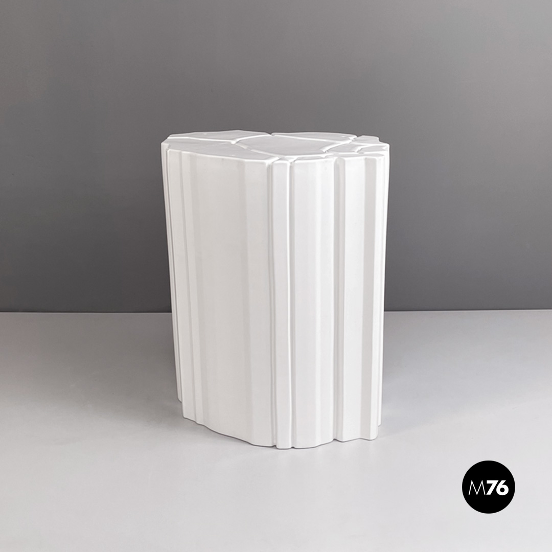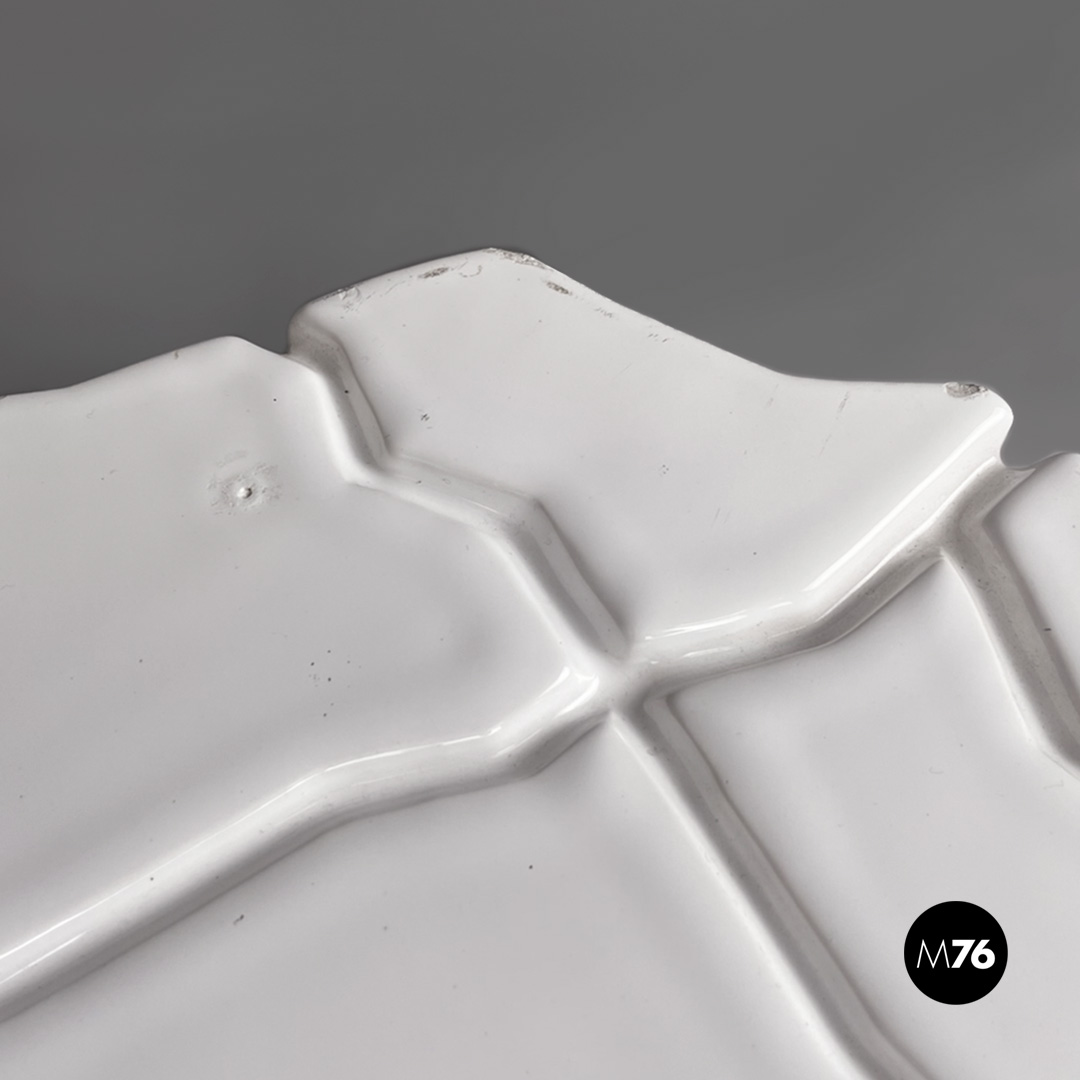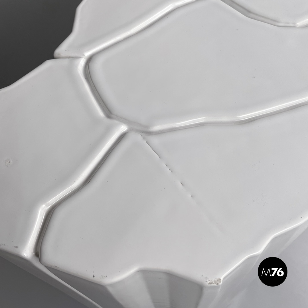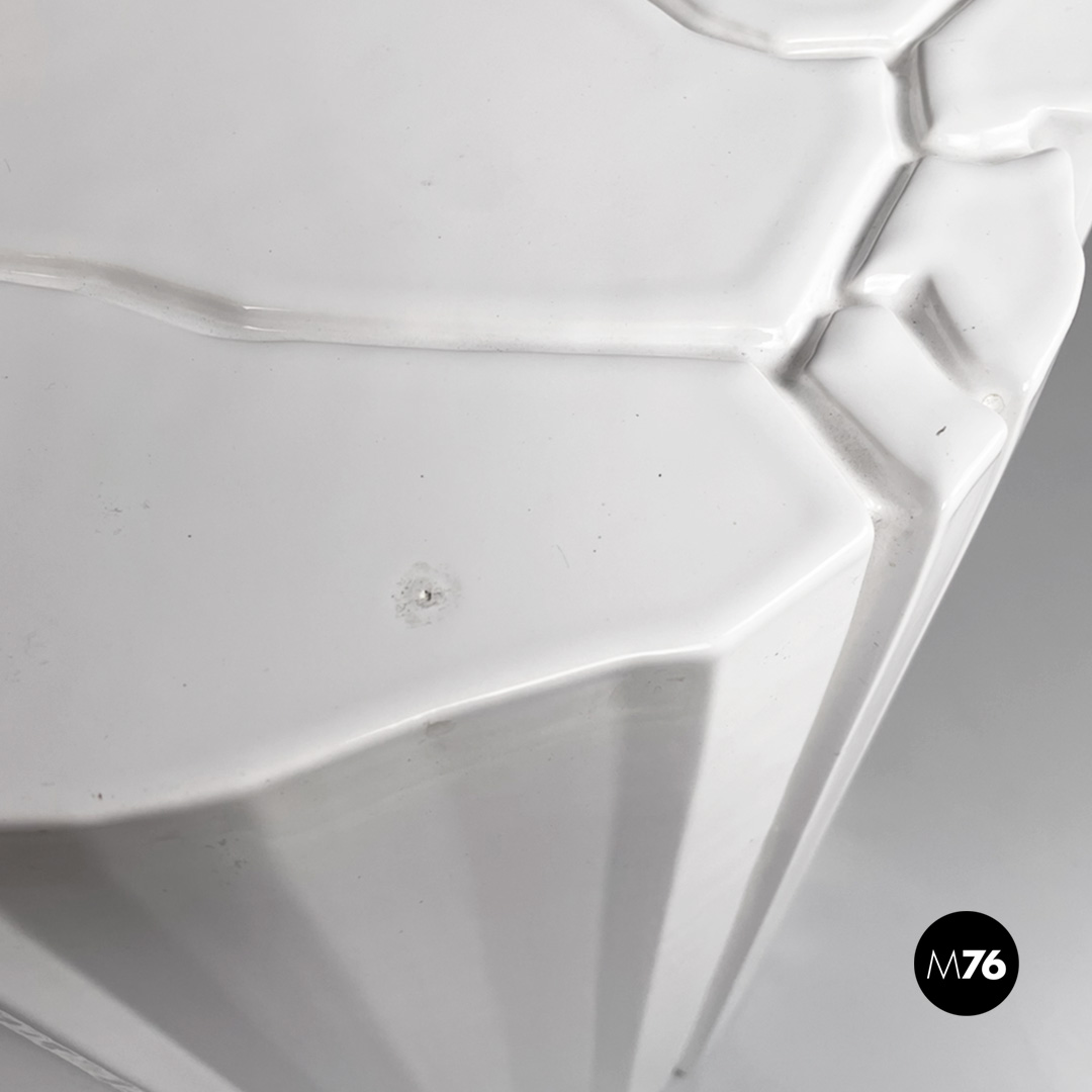 Tavolo da caffè geometrico in ceramica, con finitura in vernice bianca lucida. Il piano presenta una decorazione geometrica in basso rilievo che prosegue sui lati rendendoli irregolari. Adatto ad uso esterno come in giardino.