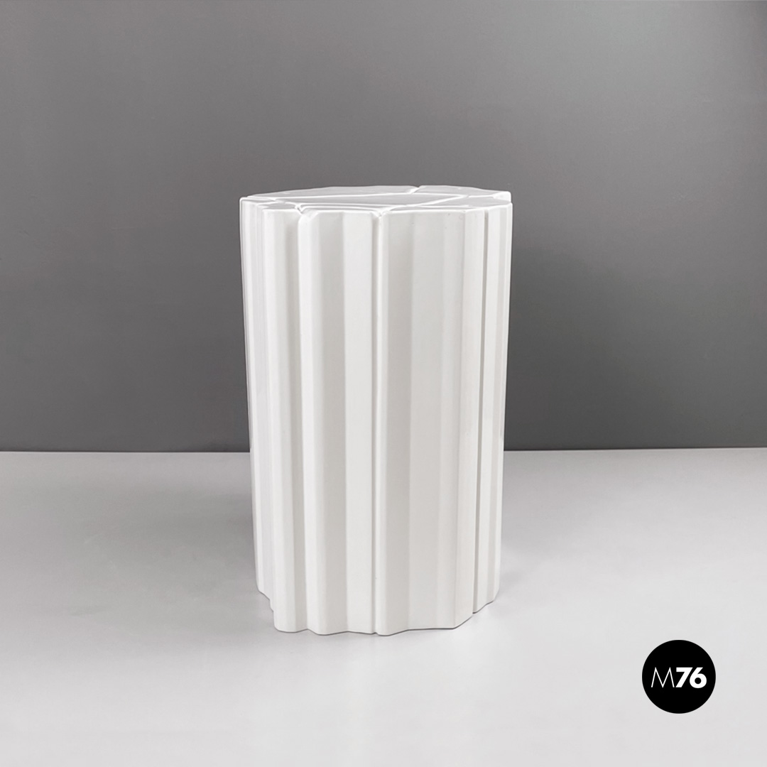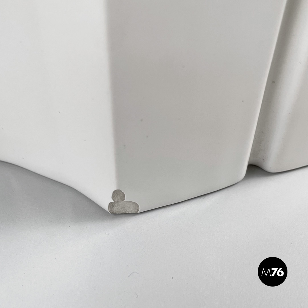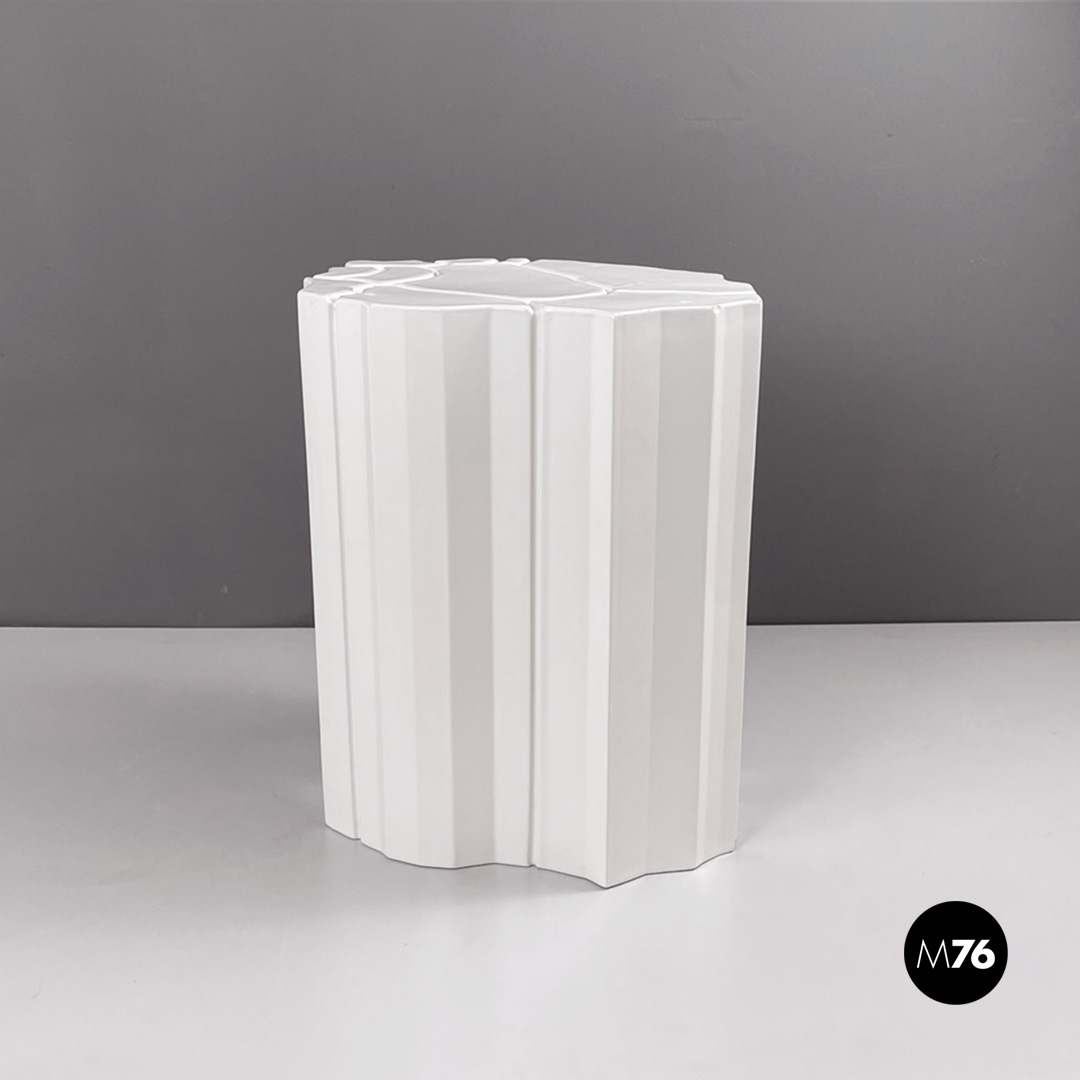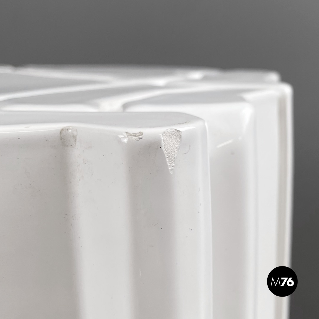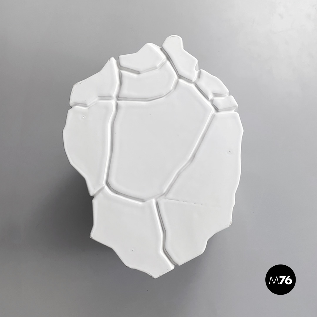 Tavolo da caffè geometrico in ceramica, con finitura in vernice bianca lucida. Il piano presenta una decorazione geometrica in basso rilievo che prosegue sui lati rendendoli irregolari. Adatto ad uso esterno come in giardino.