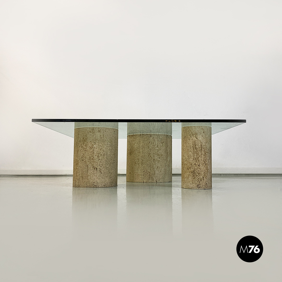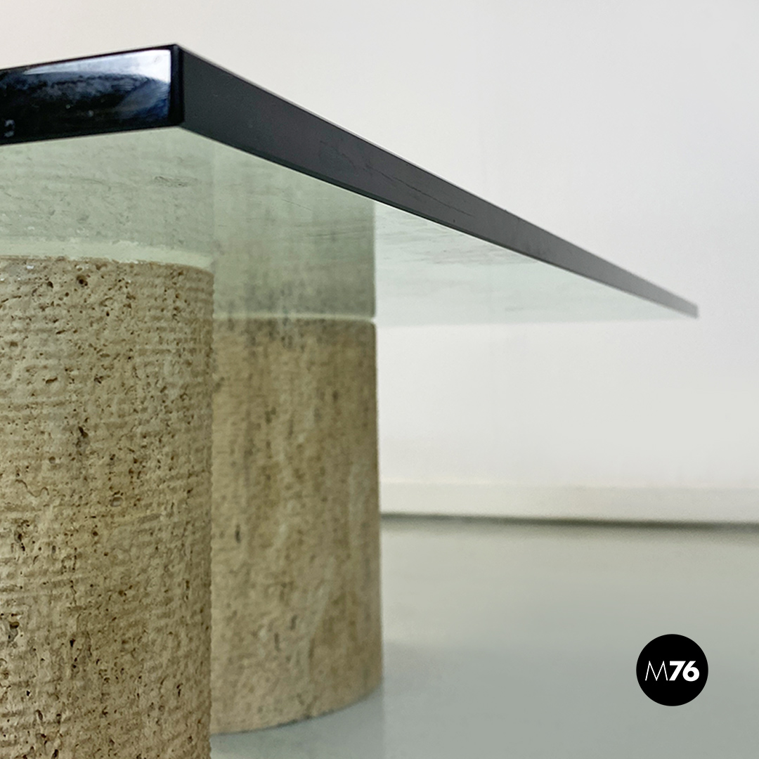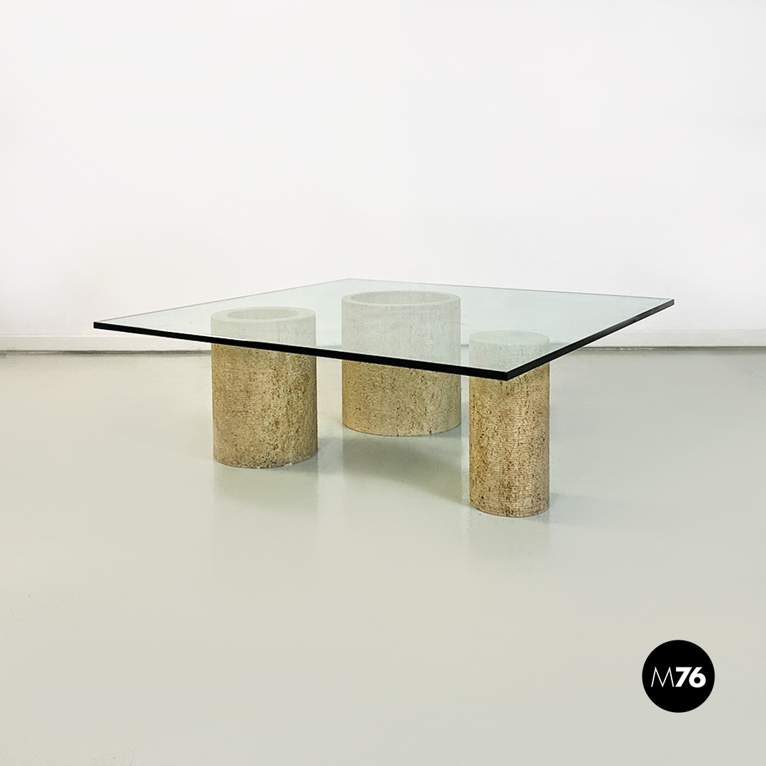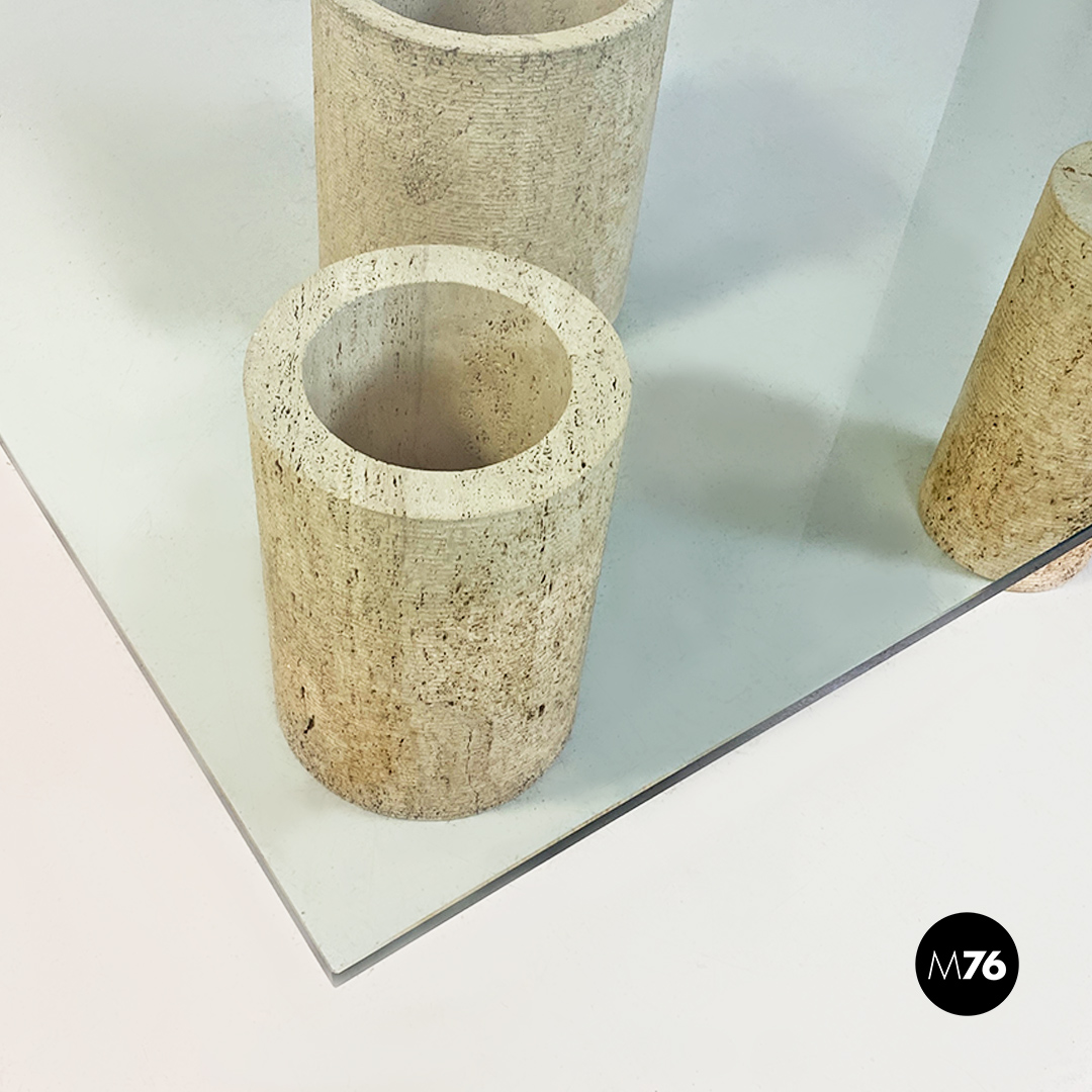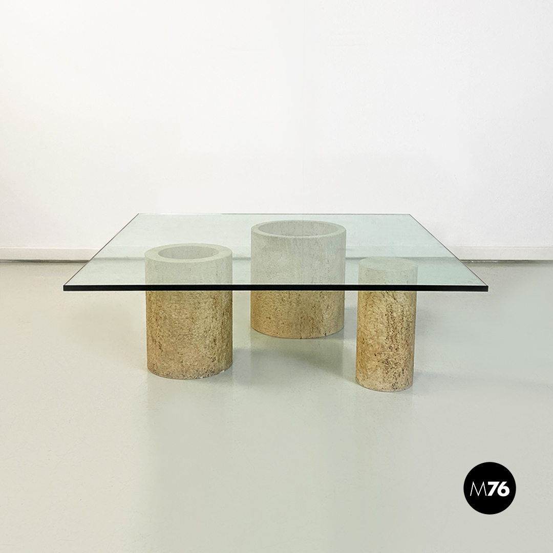 Tavolo da caffè modello Di Uno Tre in vetro e travertino, composto da tre sculture cilindriche in travertino, di cui due vuote ed una piena di varie dimensioni e piano in vetro verde acquamarina di forma quadrata.