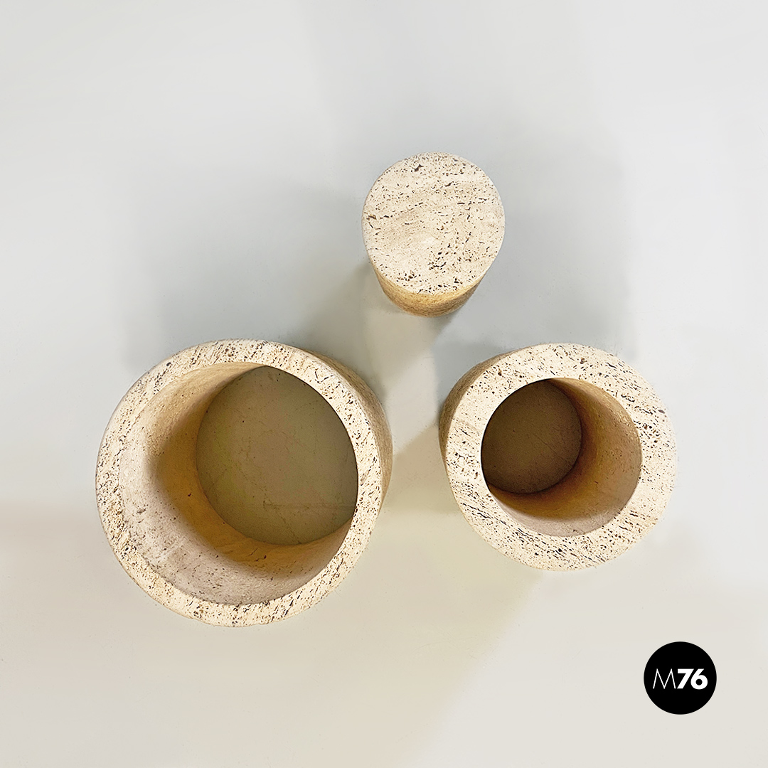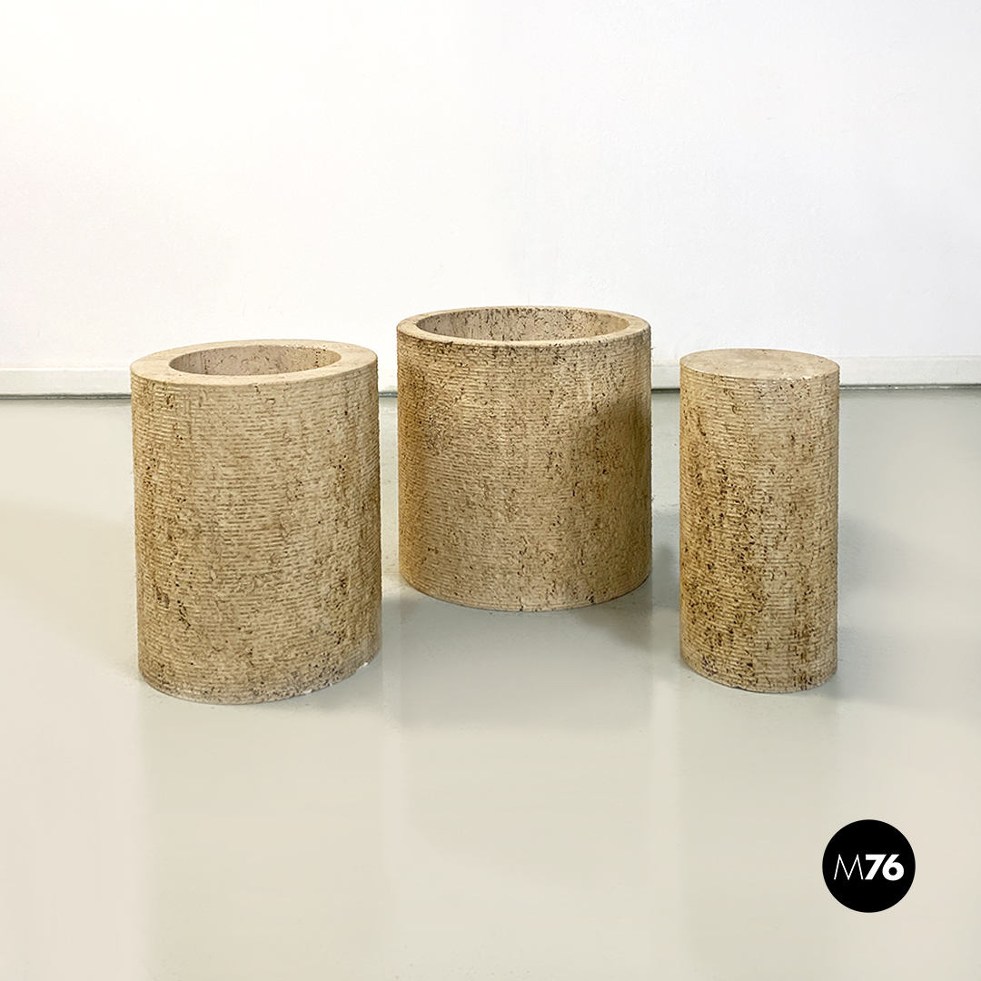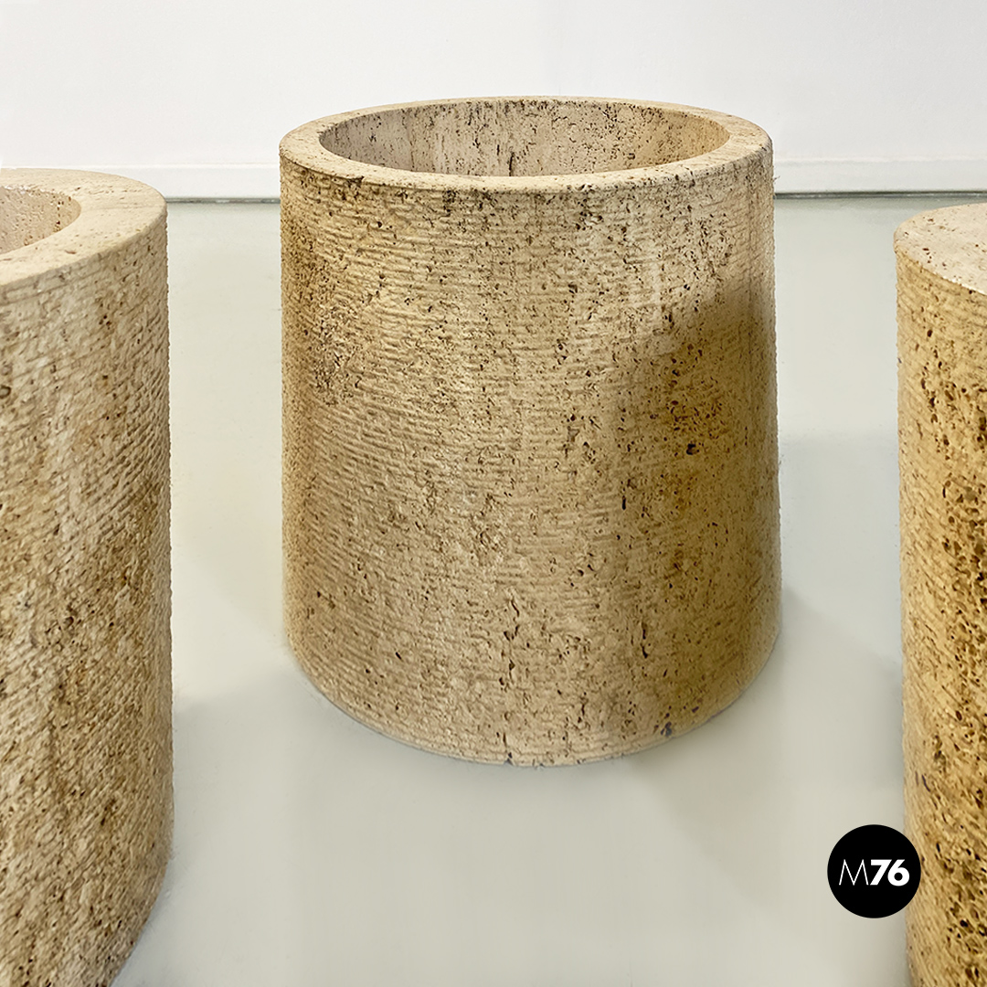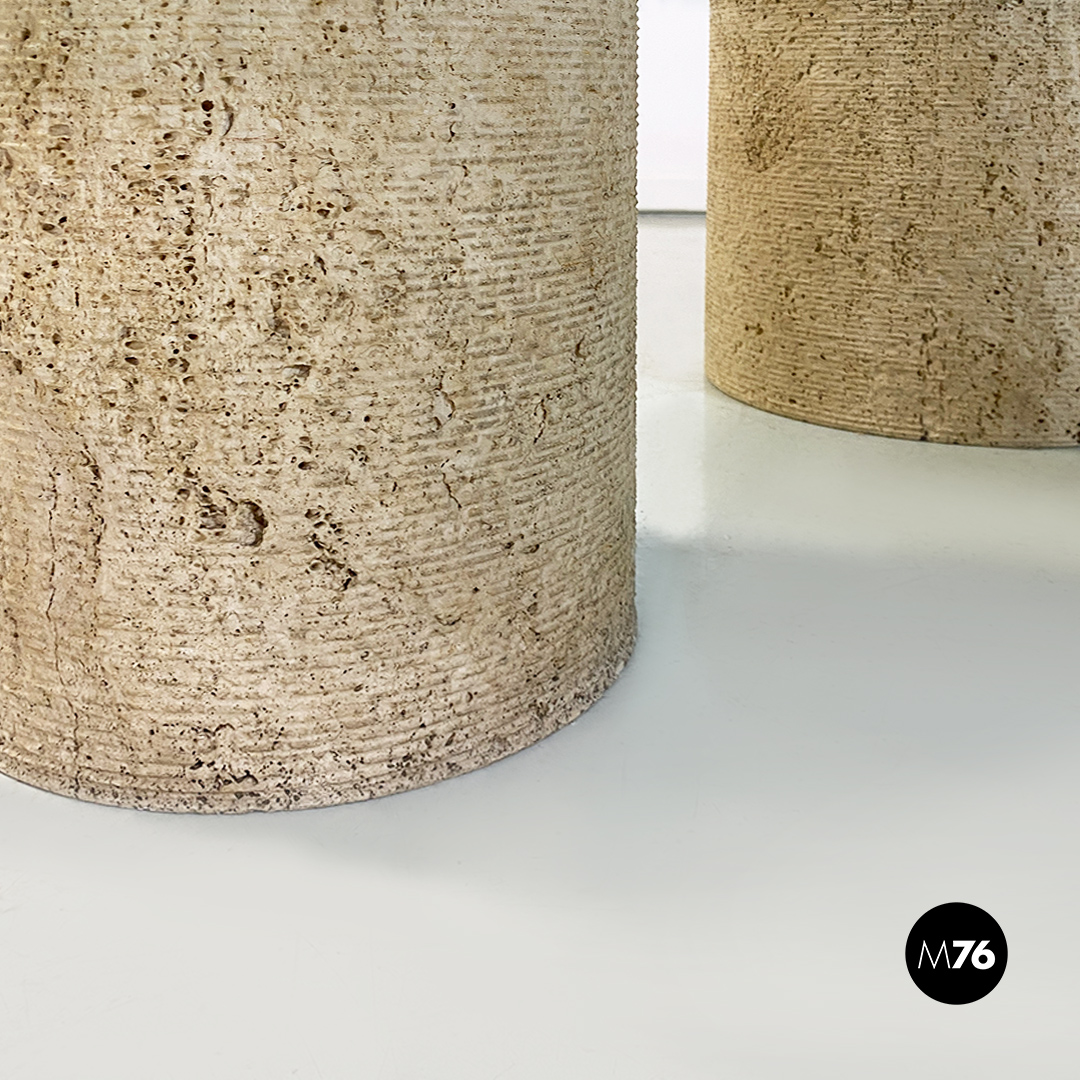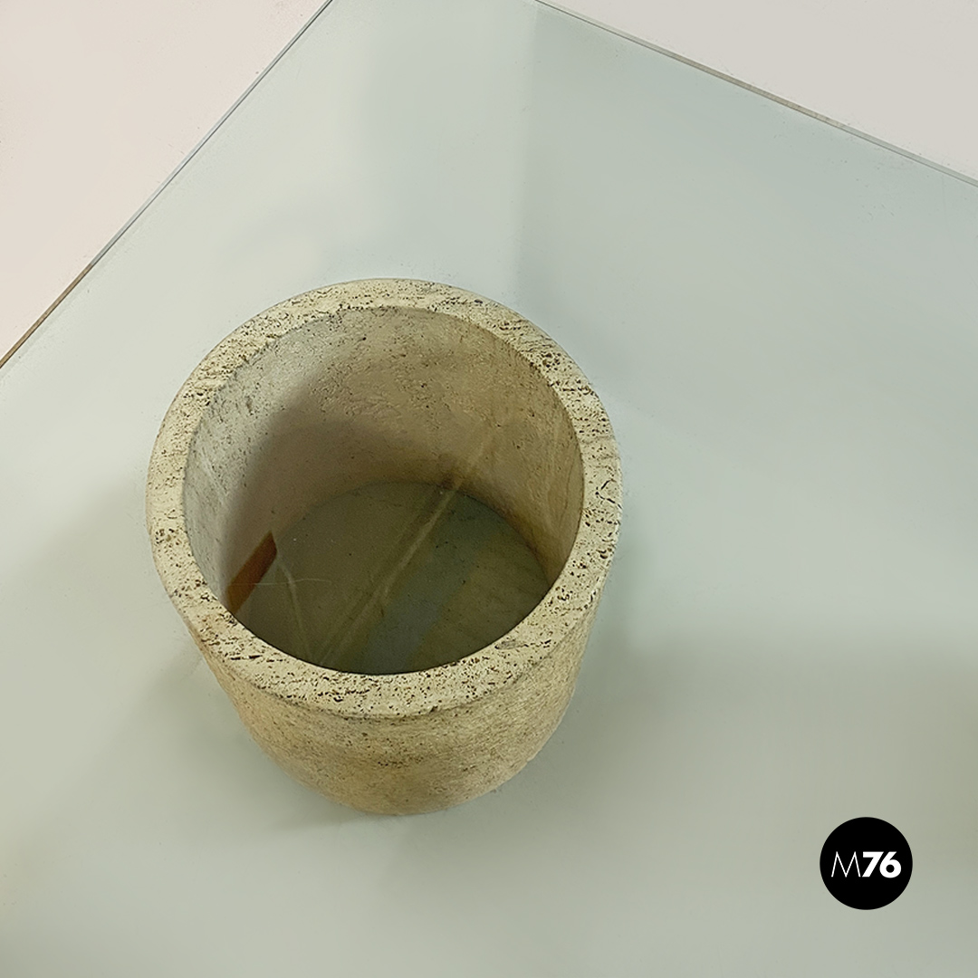 Tavolo da caffè modello Di Uno Tre in vetro e travertino, composto da tre sculture cilindriche in travertino, di cui due vuote ed una piena di varie dimensioni e piano in vetro verde acquamarina di forma quadrata.