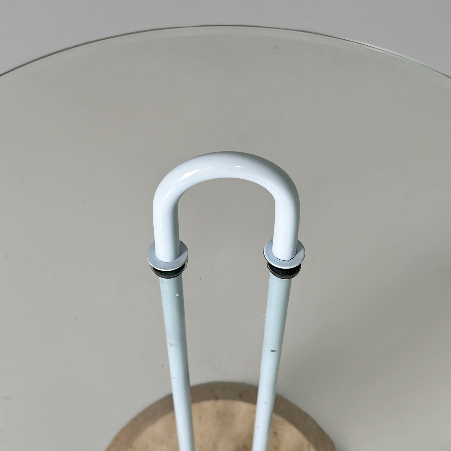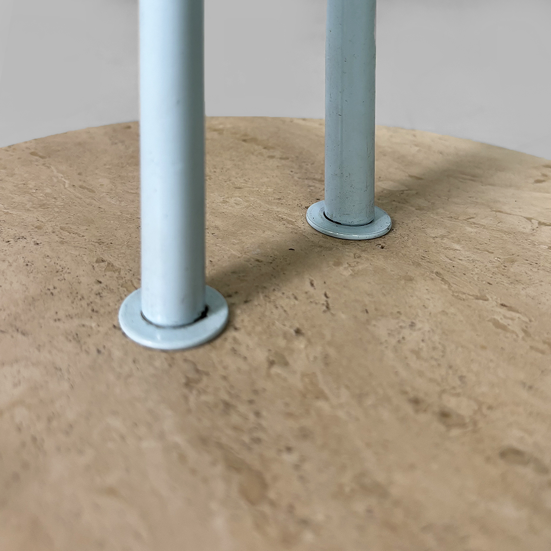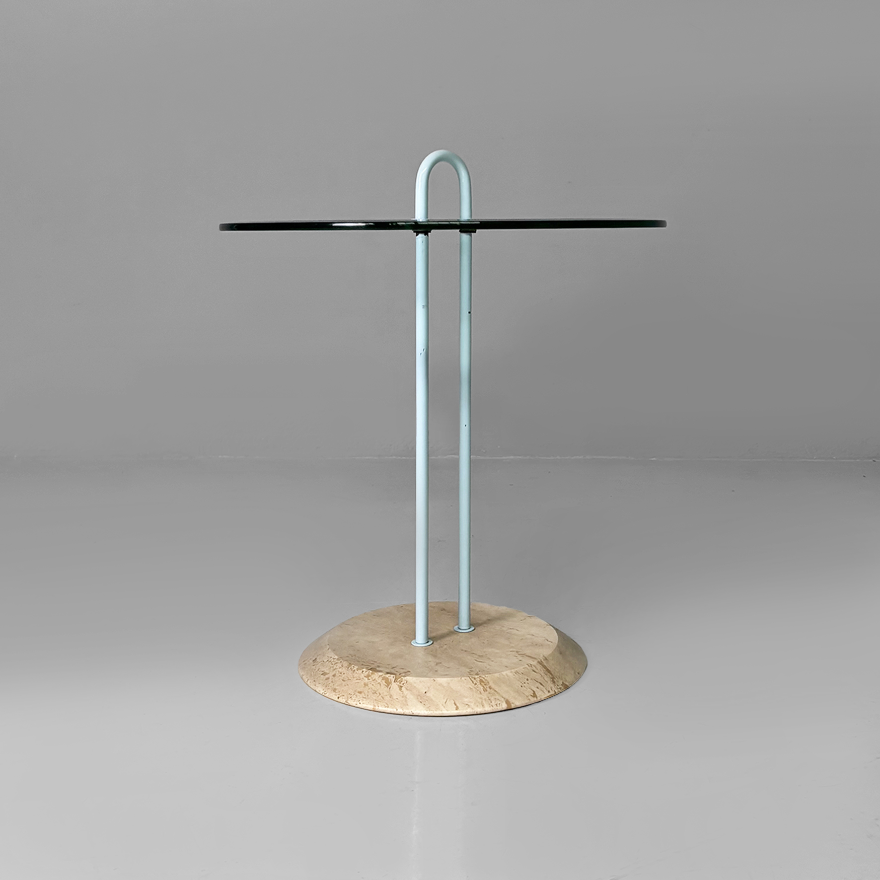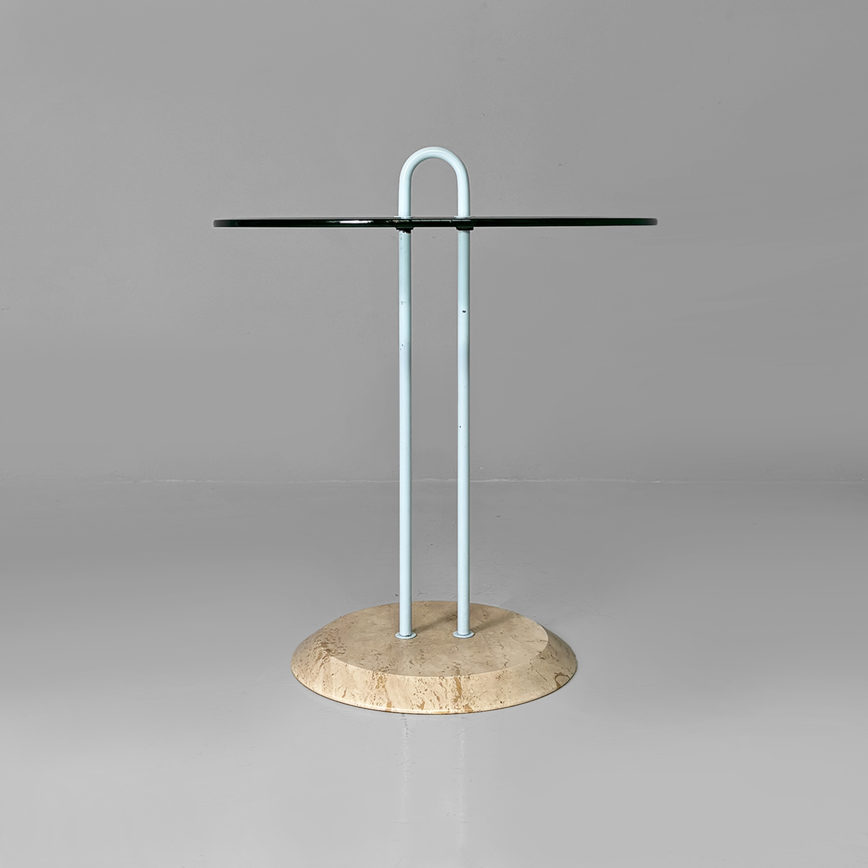 Tavolo da caffè in metallo, vetro e travertino. La struttura è in metallo verniciato colore azzurro. Il piano tondo è in vetro spesso. La base tonda è in travertino.