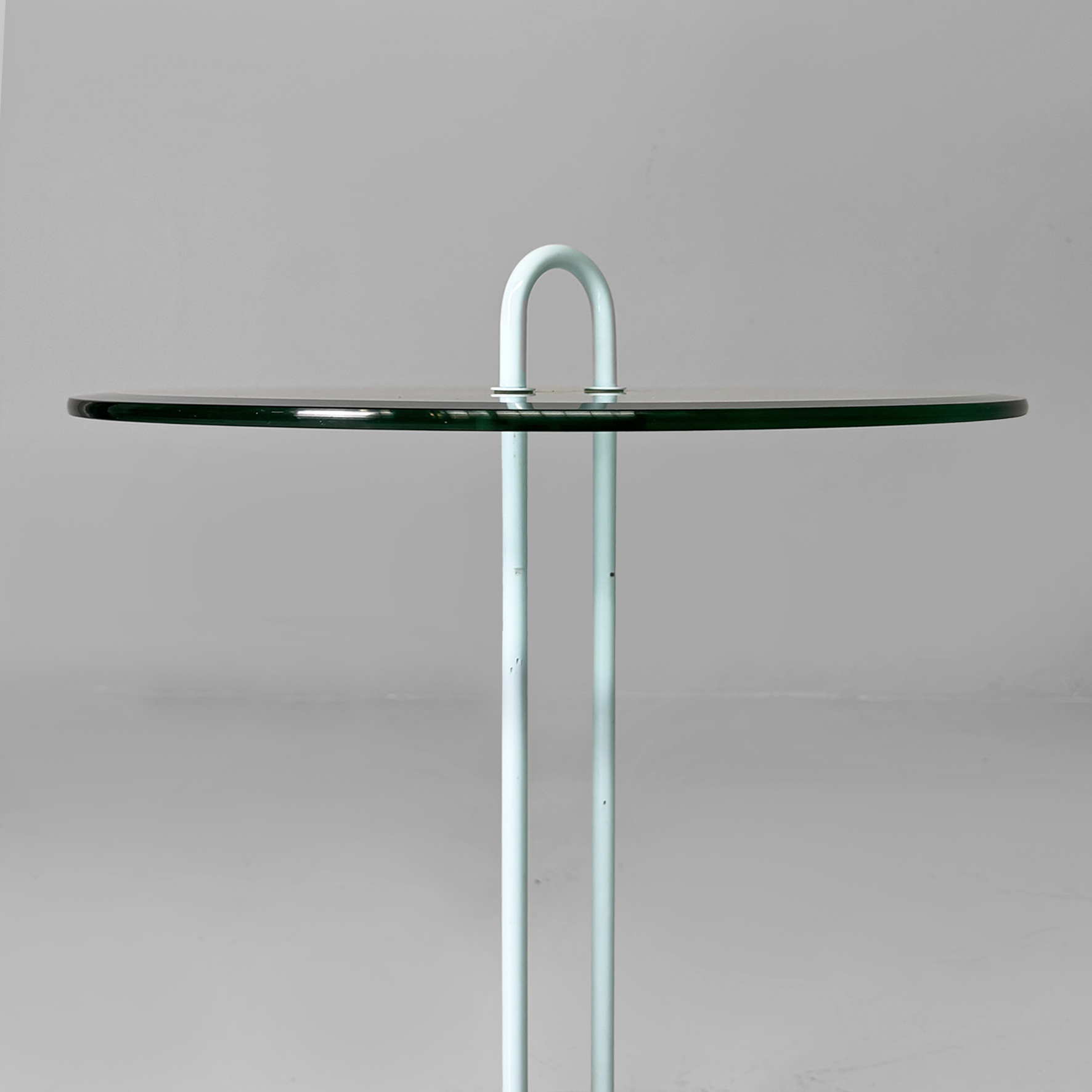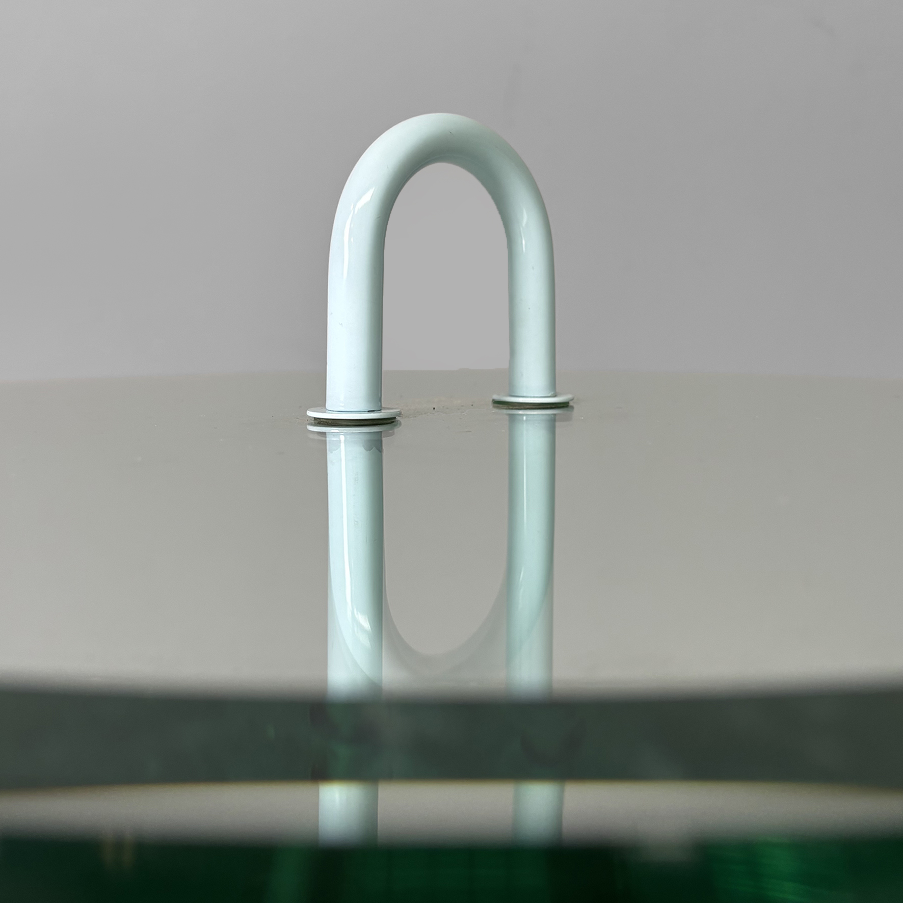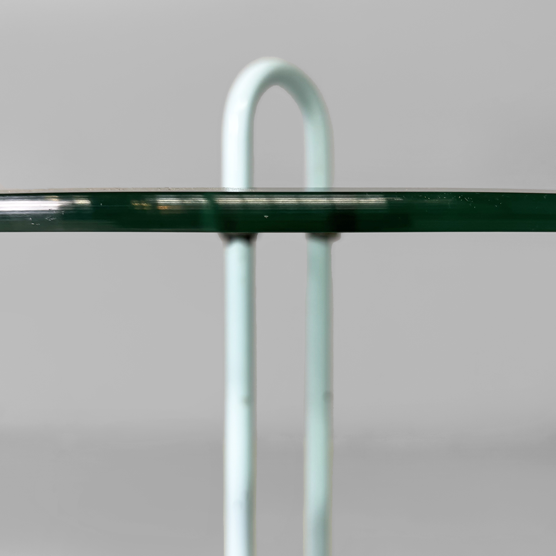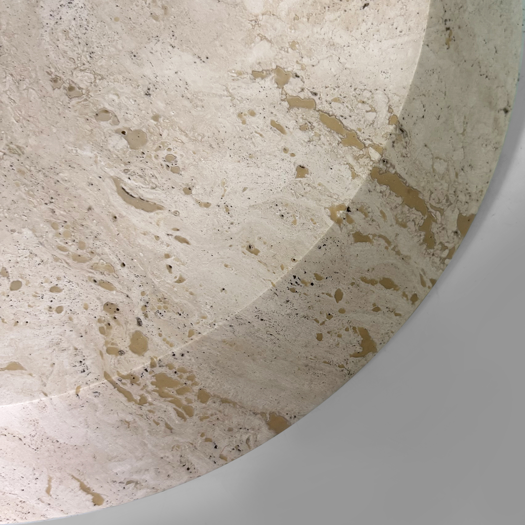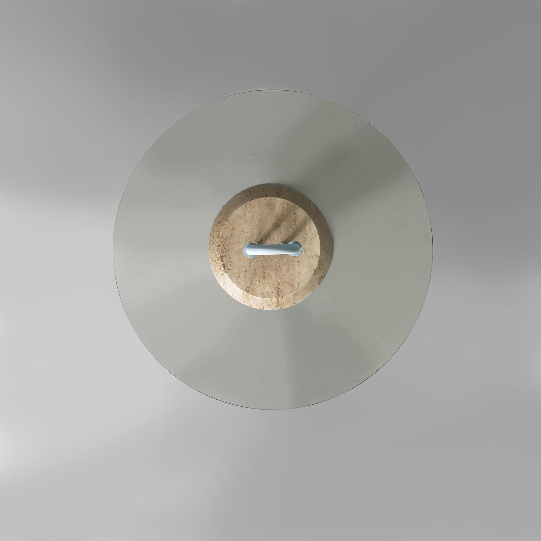 Tavolo da caffè in metallo, vetro e travertino. La struttura è in metallo verniciato colore azzurro. Il piano tondo è in vetro spesso. La base tonda è in travertino.
